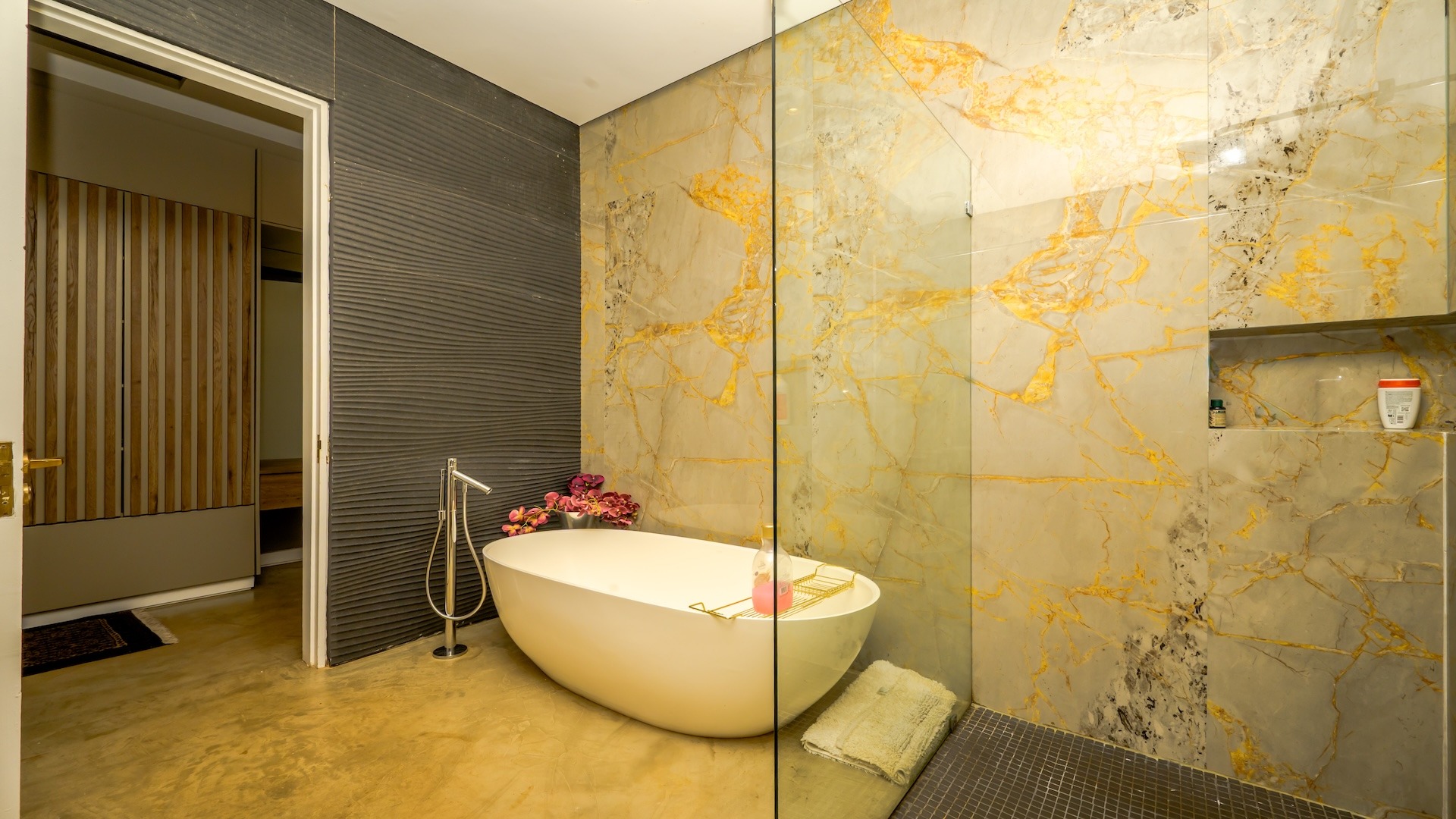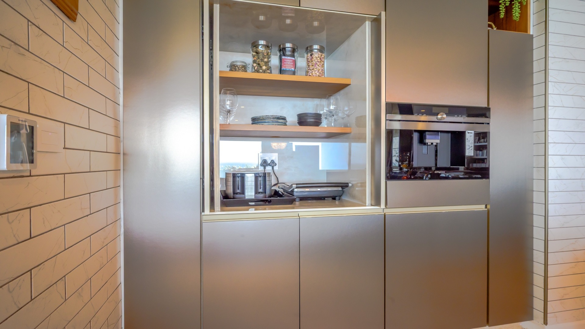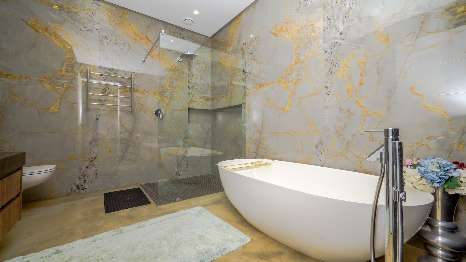The top level is home to a spacious, luxurious main-ensuite bedroom with grand dressing room and stylish bathroom with bath, rain shower and separate toilet. There are also a sea-facing gym and study on this level.