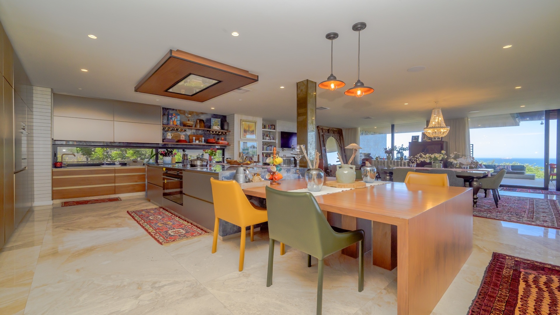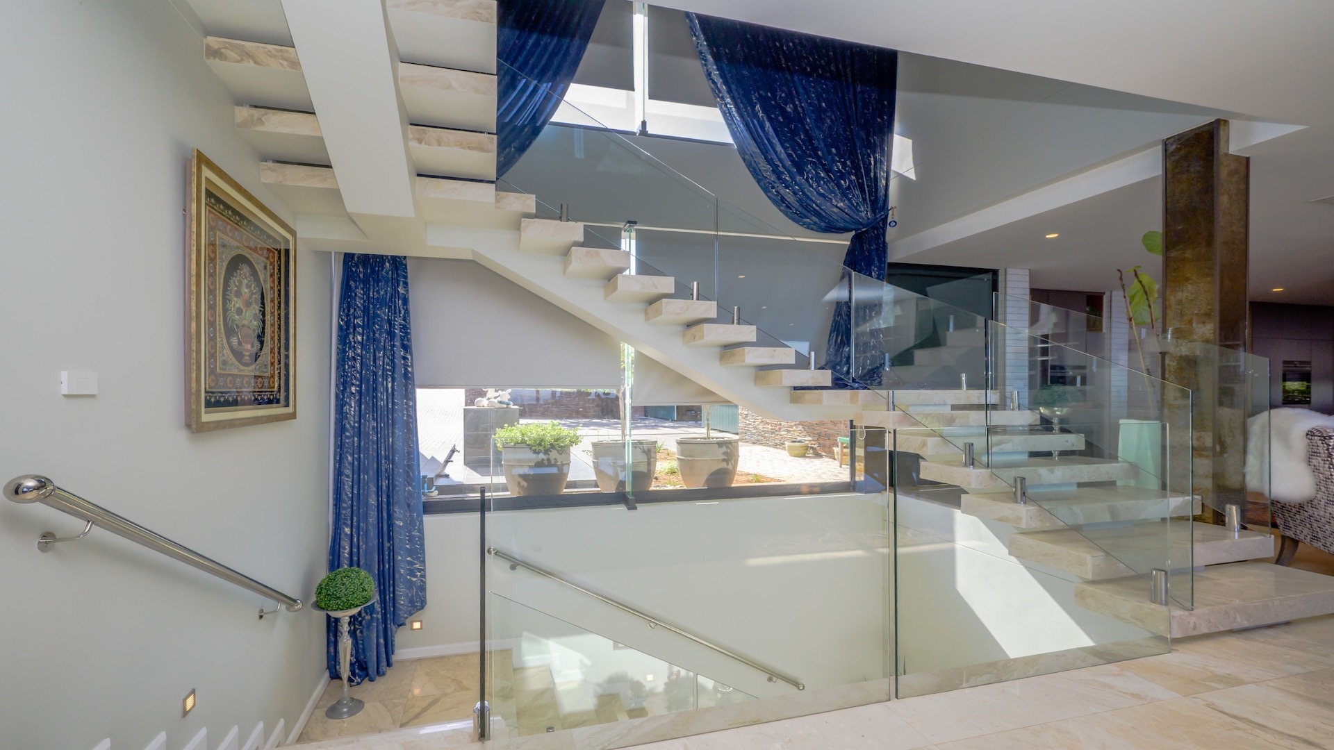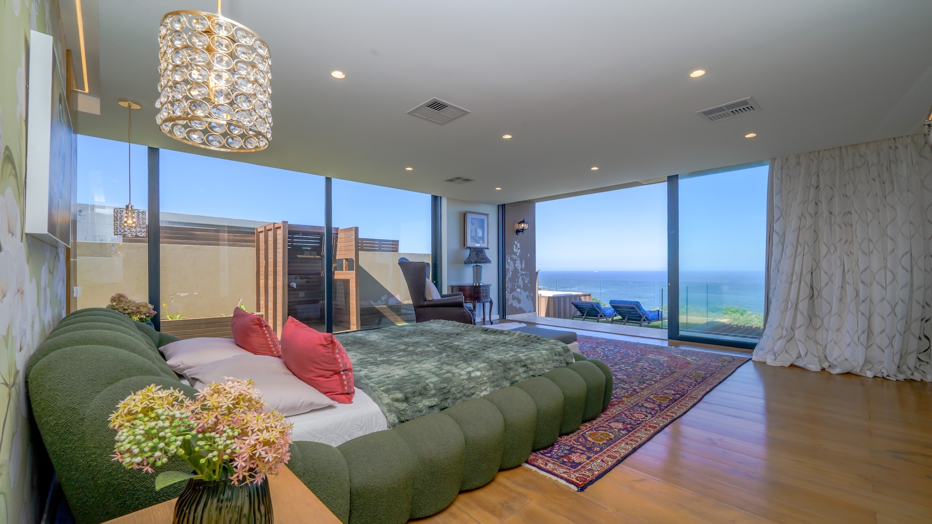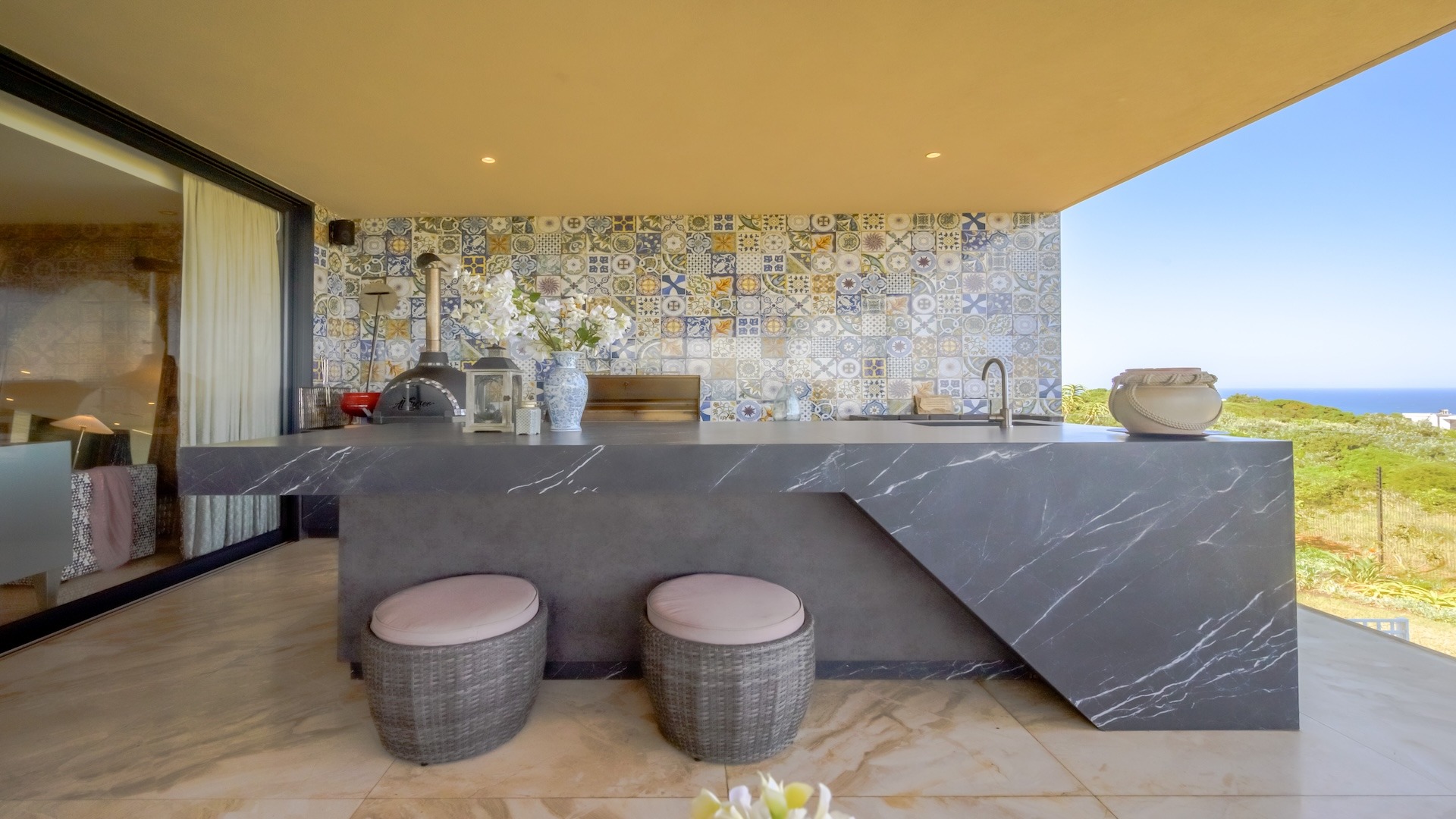 Ideal for a large family and effortless entertaining, the home spans three levels, designed around the glorious vistas, morning and afternoon light. The middle level forms the heart of the home, with the open plan kitchen, lounge and dining room flowing onto a massive patio with swimming pool, jacuzzi and uninterrupted sea views. There is a charcoal and a gas braai as well as a pizza oven. There is a cinema room, a guest toilet and an en-suite bedroom, leading onto the patio. There is direct access to the home from the triple garages to the pantry and scullery. The wide driveway offers additional open parking.