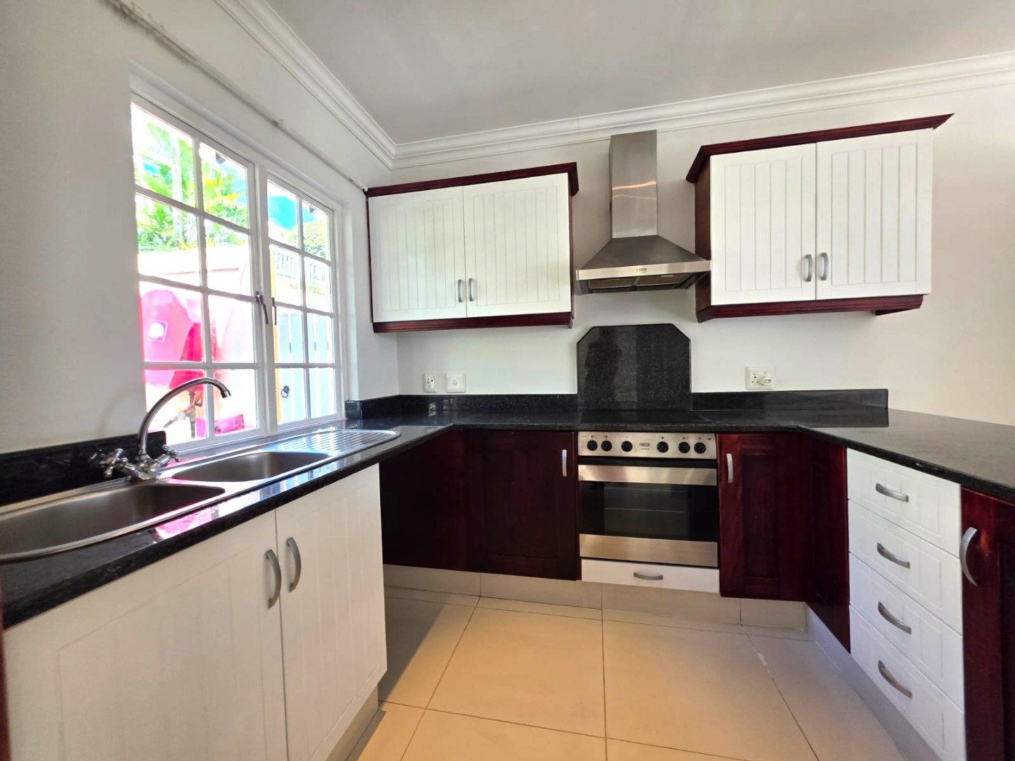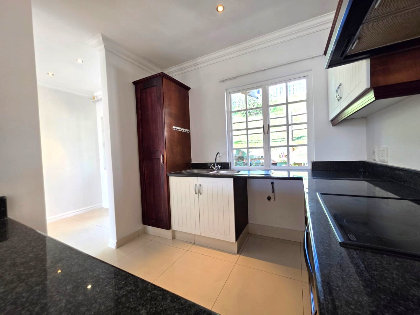 The open-plan kitchen is neatly appointed with granite countertops, ample cabinetry, and direct access to a private courtyard.