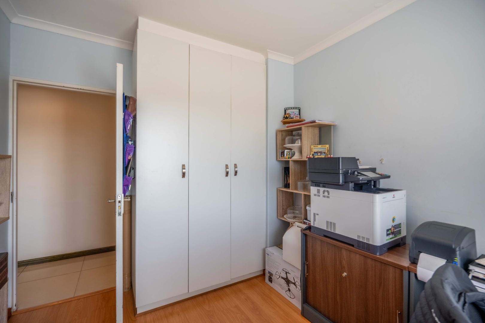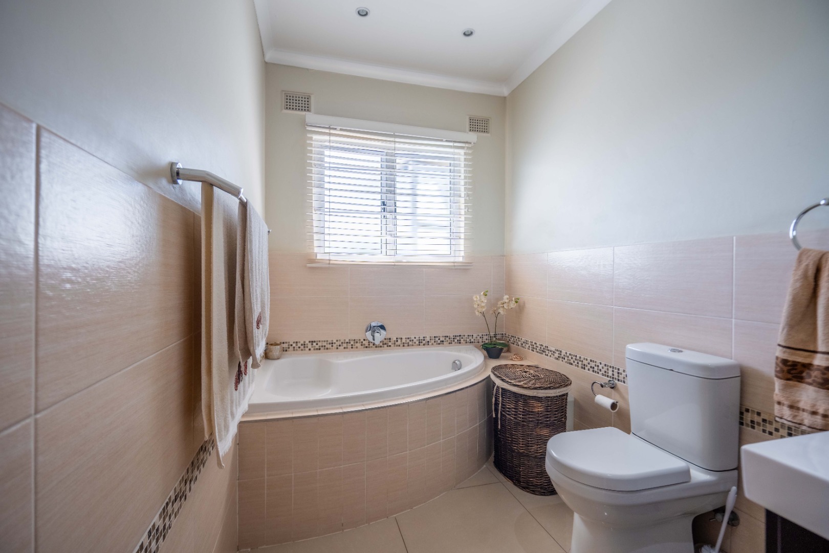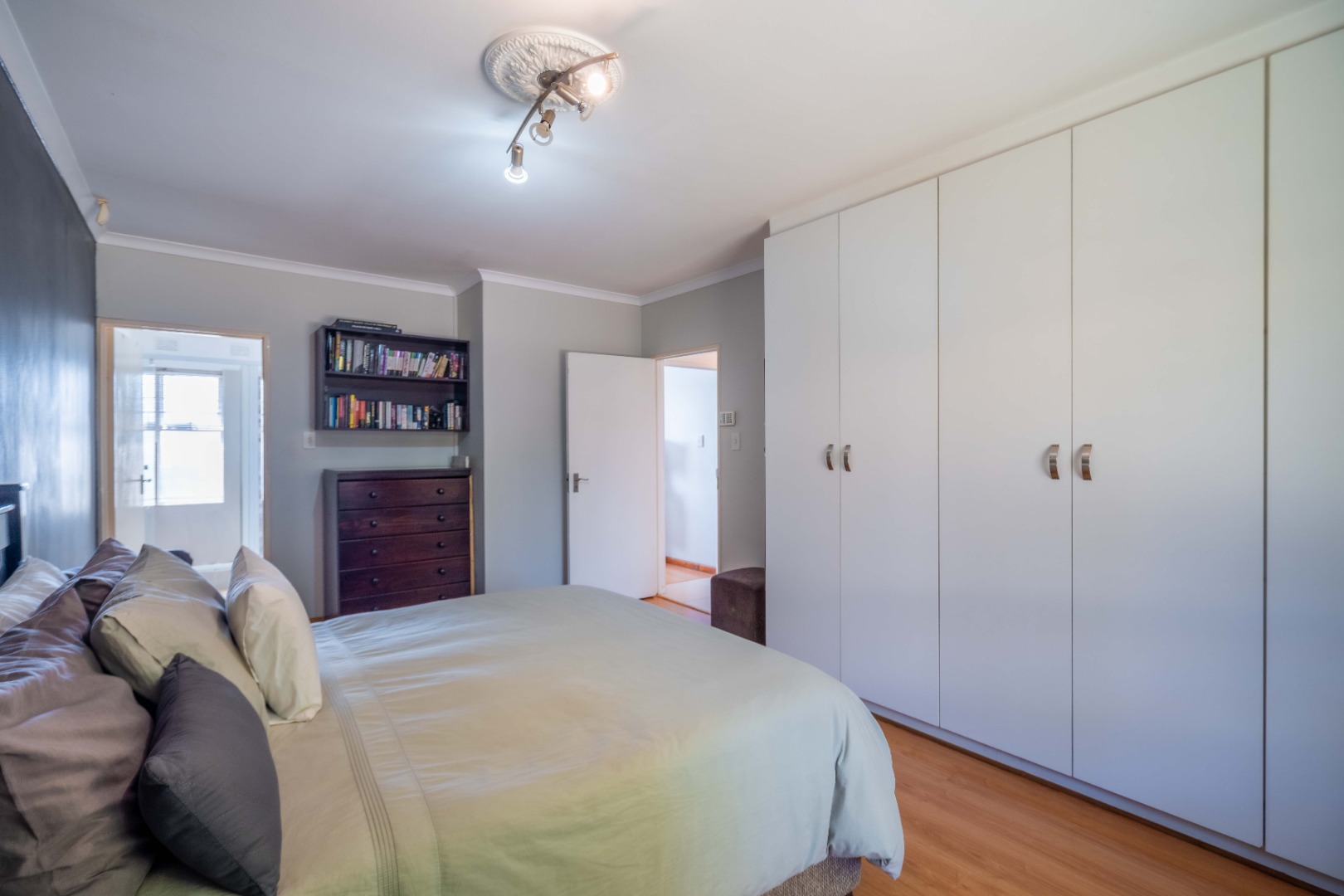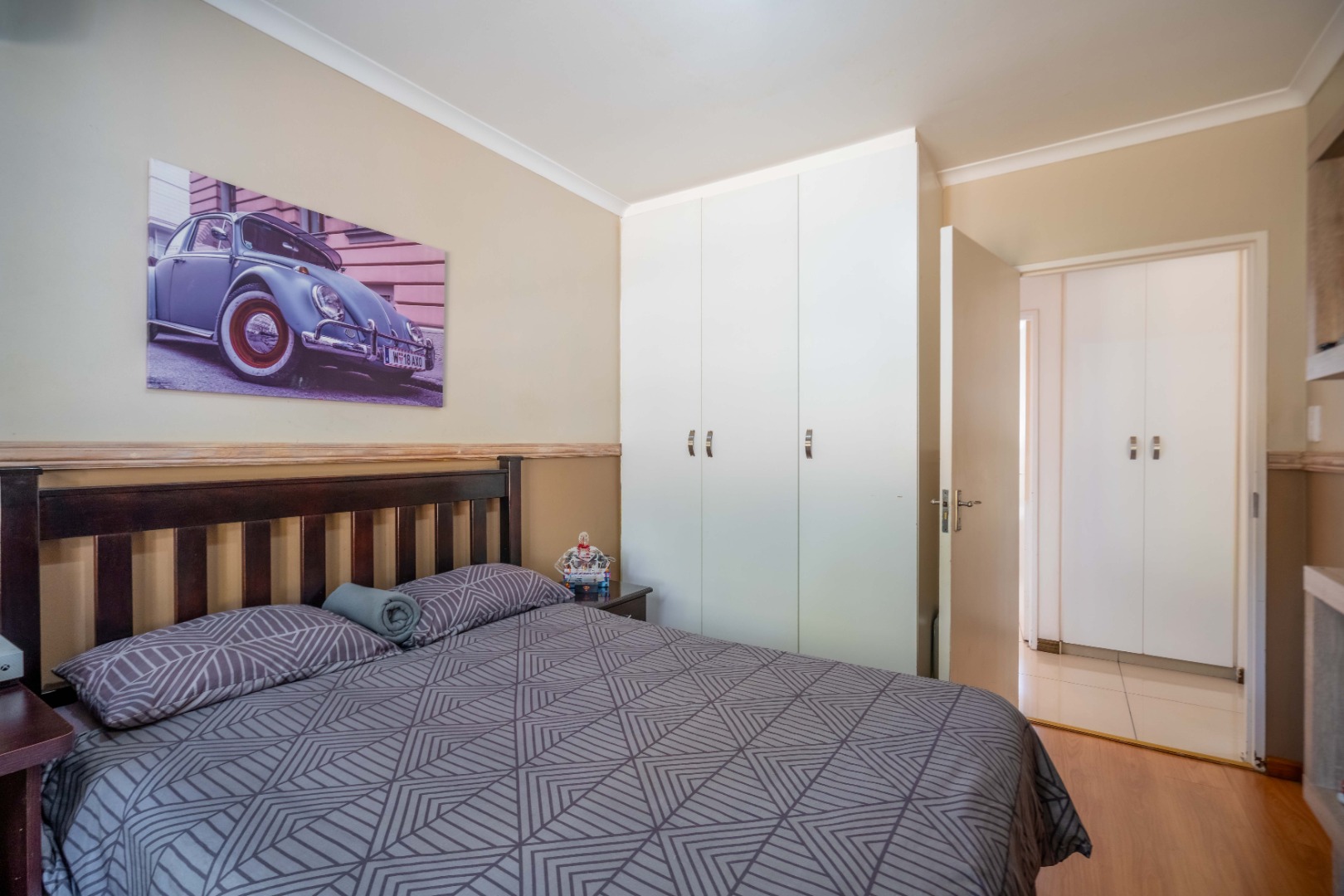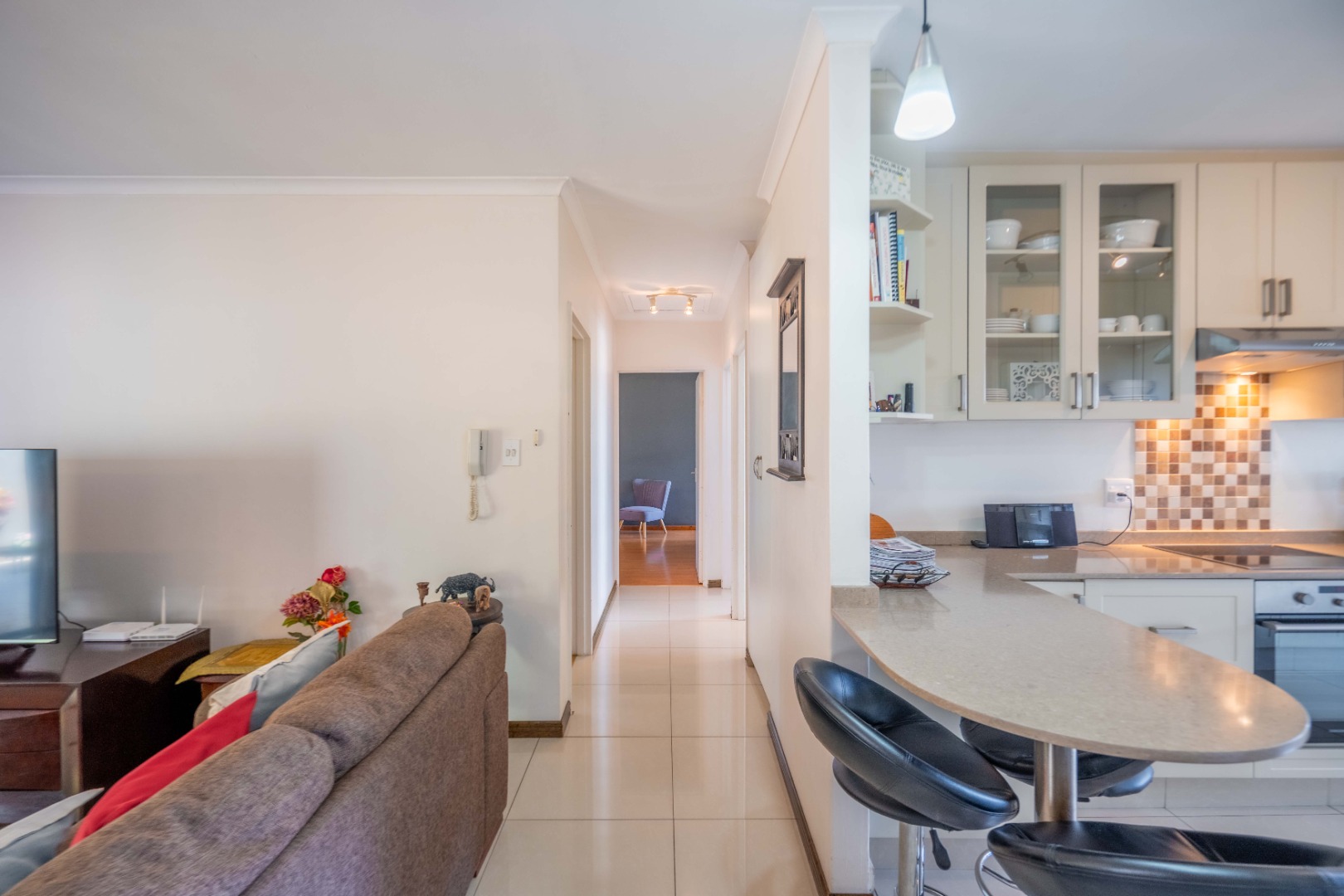 Down the passage, you’ll find three generously sized bedrooms, all with ample built-in cupboards. One is currently set up as a work from home office, perfect for modern living. The main bedroom boasts its own en suite bathroom with a large shower, while the remaining two bedrooms share a stylish family bathroom with a relaxing corner bath.