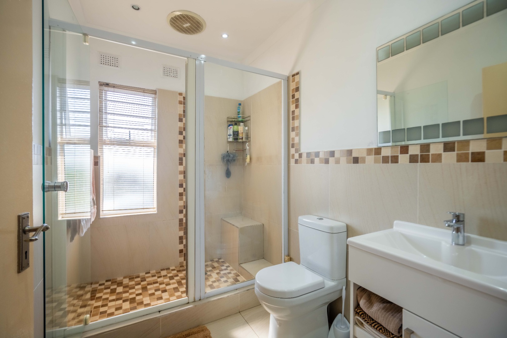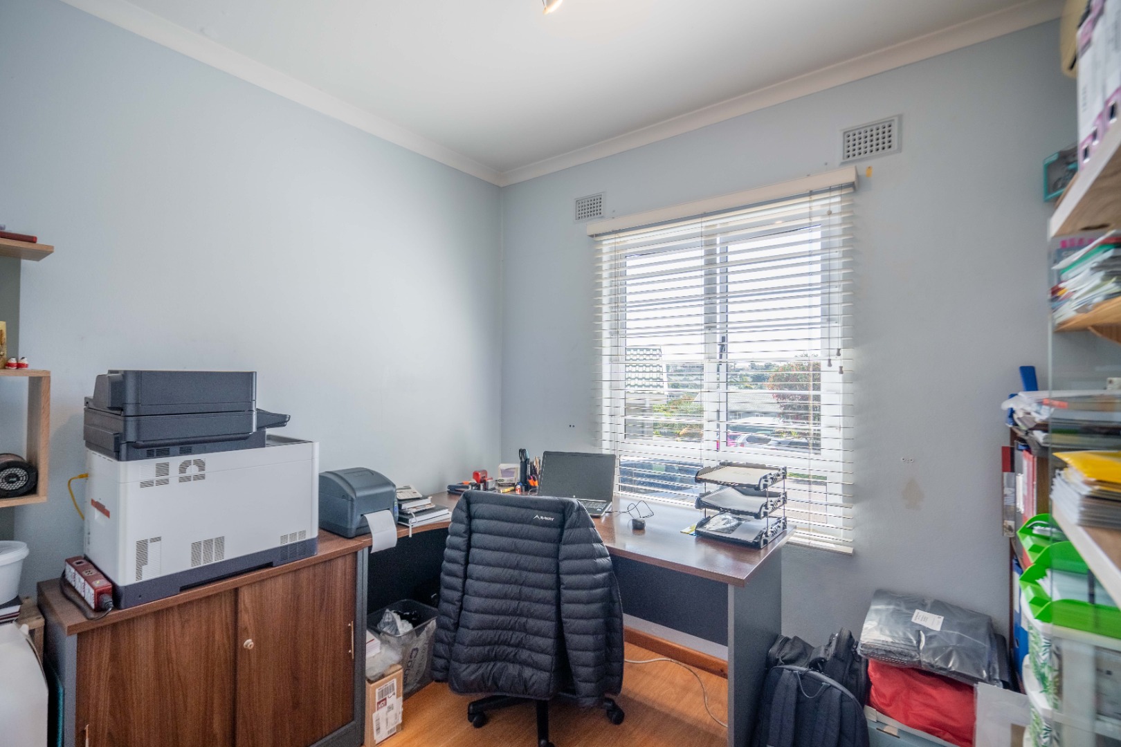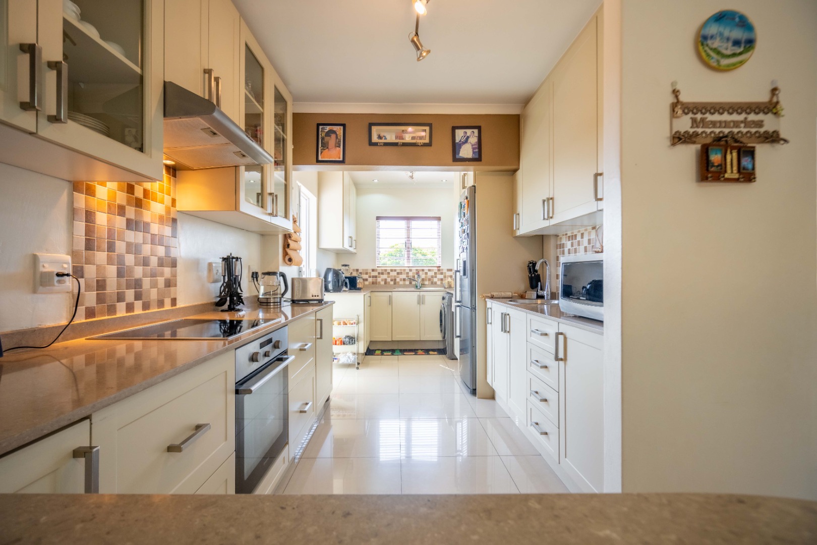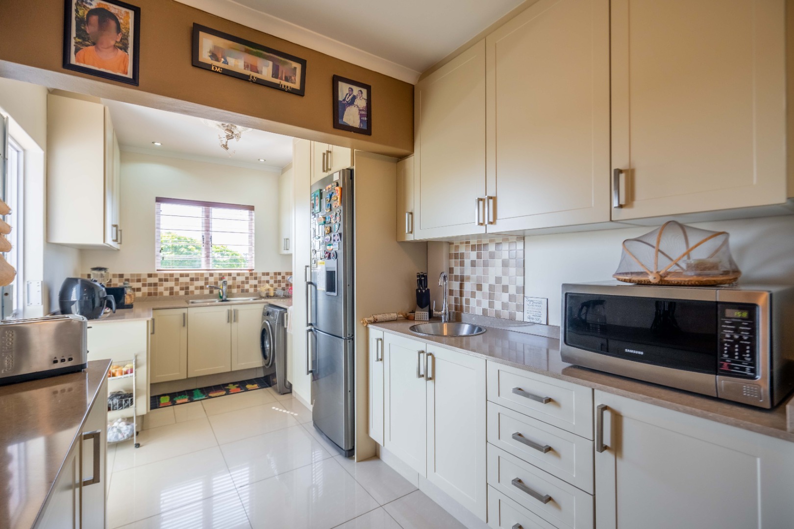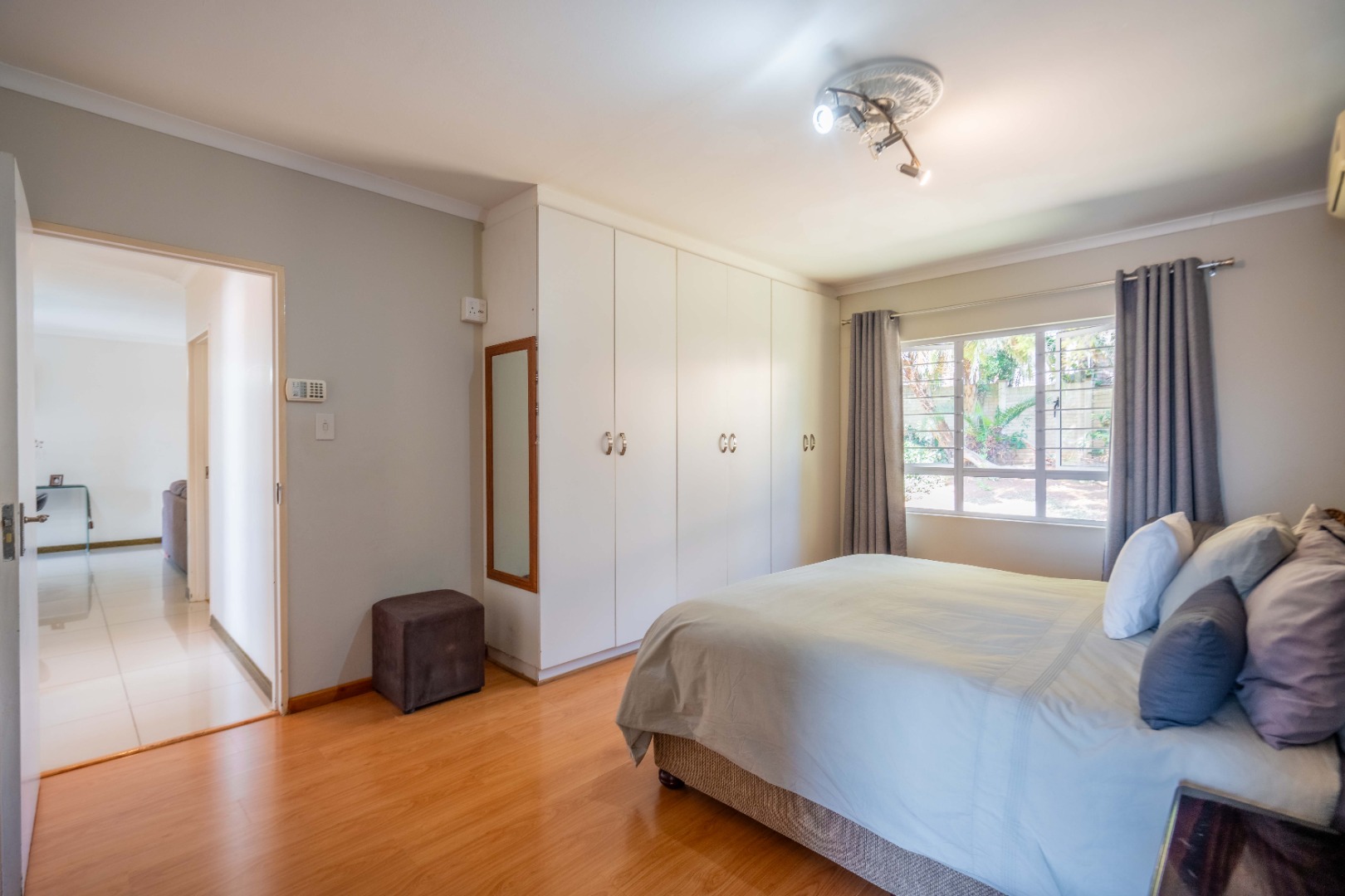 Down the passage, you’ll find three generously sized bedrooms, all with ample built-in cupboards. One is currently set up as a work from home office, perfect for modern living. The main bedroom boasts its own en suite bathroom with a large shower, while the remaining two bedrooms share a stylish family bathroom with a relaxing corner bath.