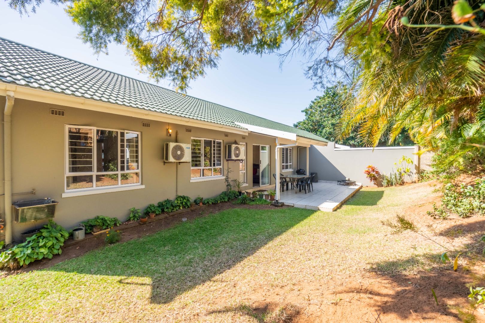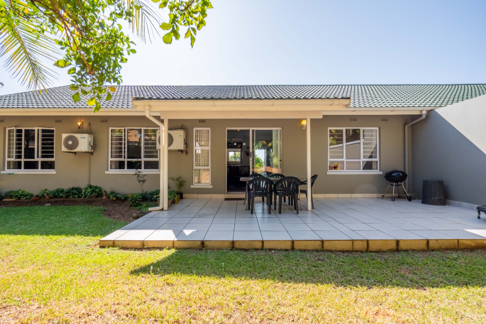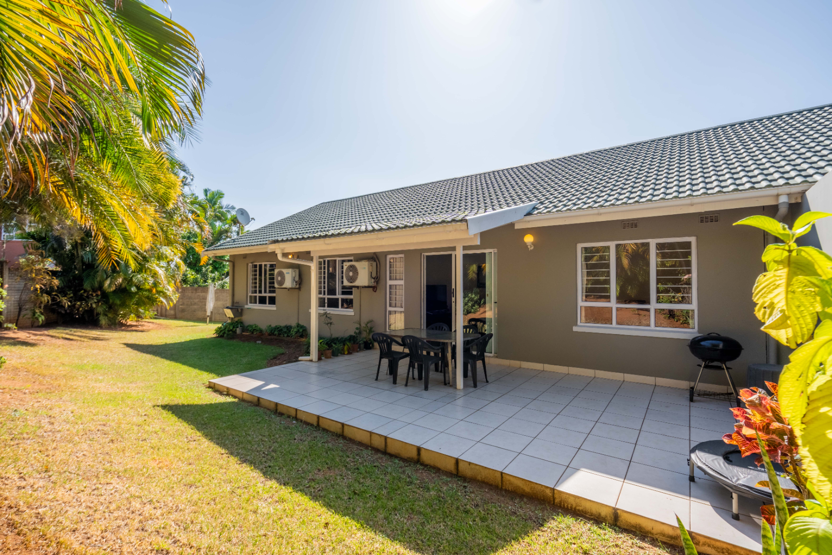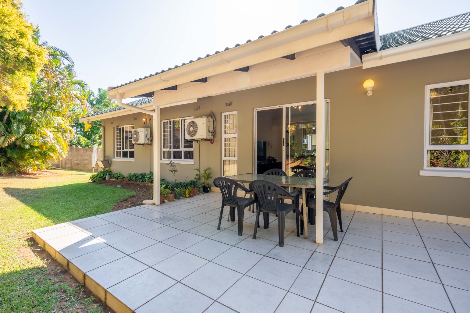 Glass doors open seamlessly from the lounge and dining area onto a covered patio and a totally private, lush tropical garden that wraps around the home. Morning coffees, weekend braais, barefoot afternoons with the dogs or kids playing safely, this outdoor space is pure magic and feels like your own private retreat.