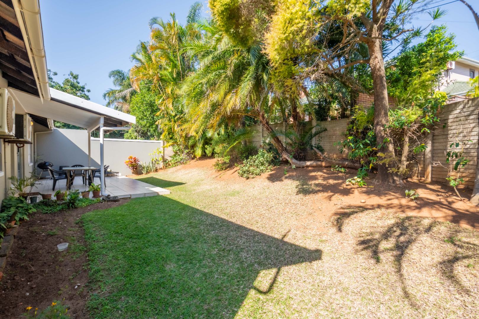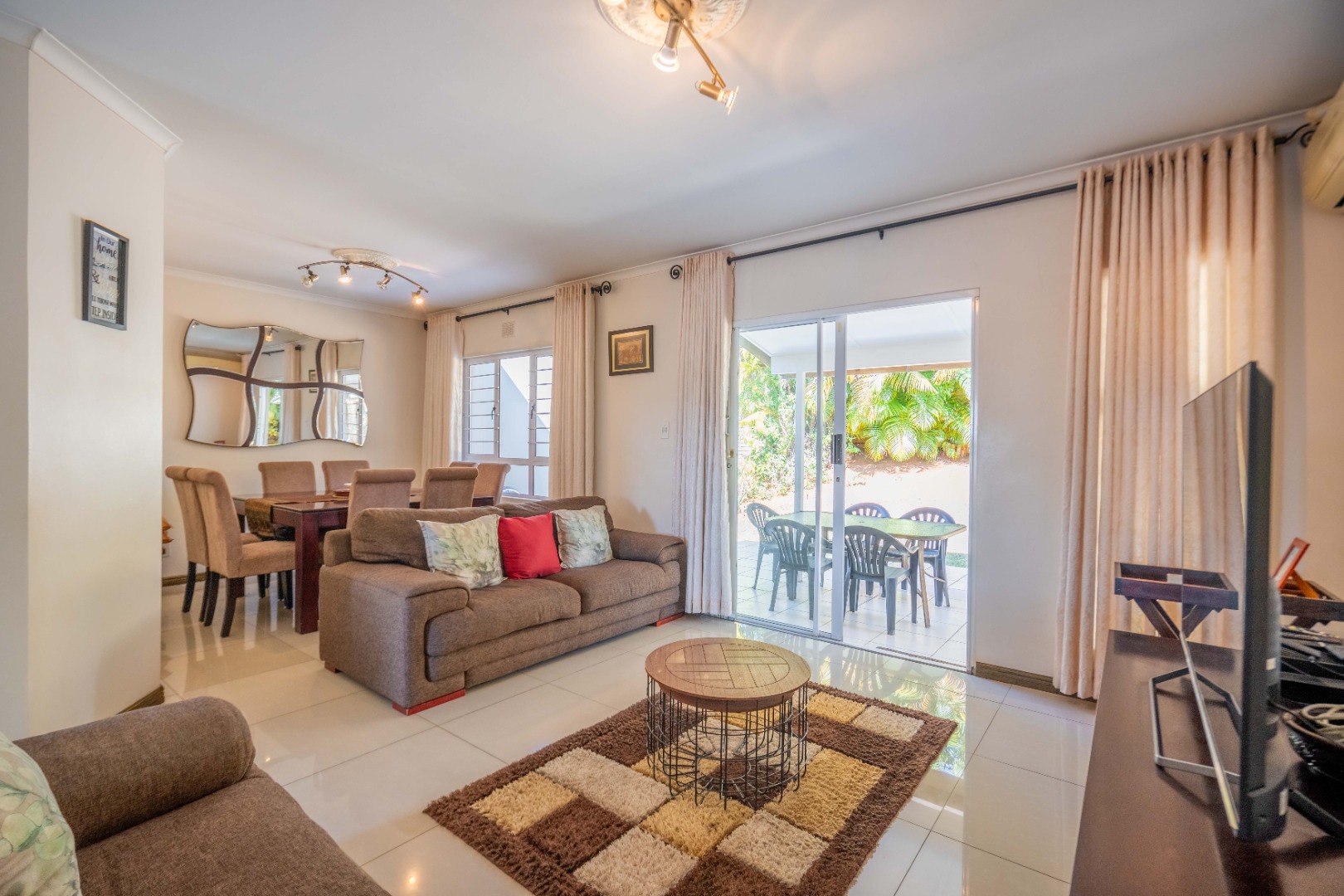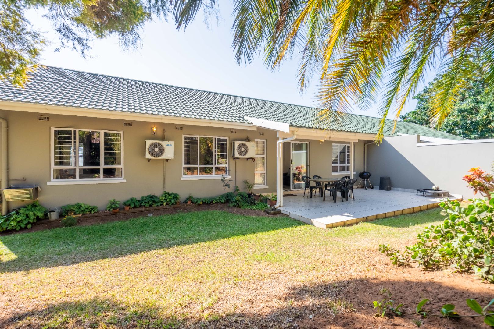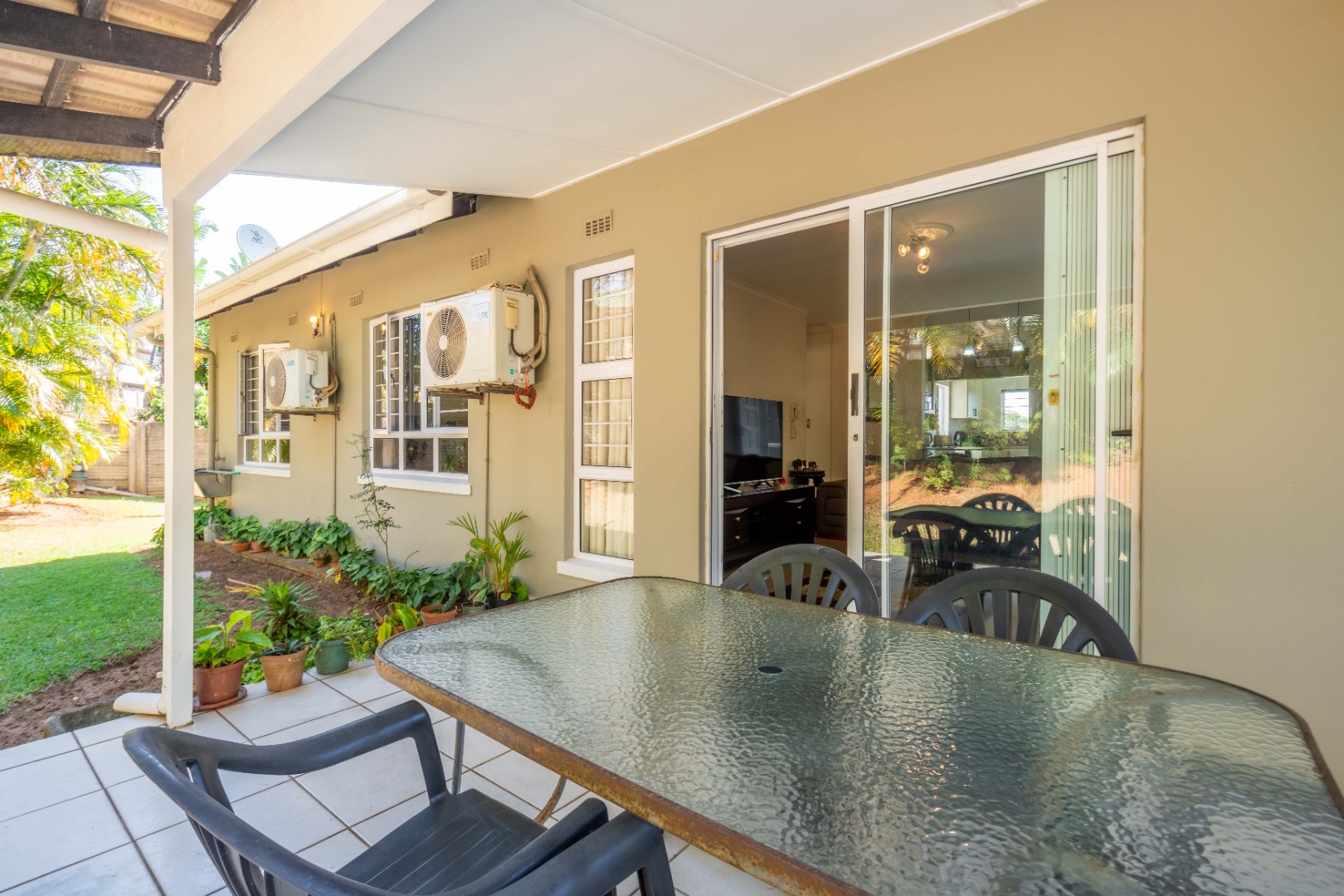 Glass doors open seamlessly from the lounge and dining area onto a covered patio and a totally private, lush tropical garden that wraps around the home. Morning coffees, weekend braais, barefoot afternoons with the dogs or kids playing safely, this outdoor space is pure magic and feels like your own private retreat.