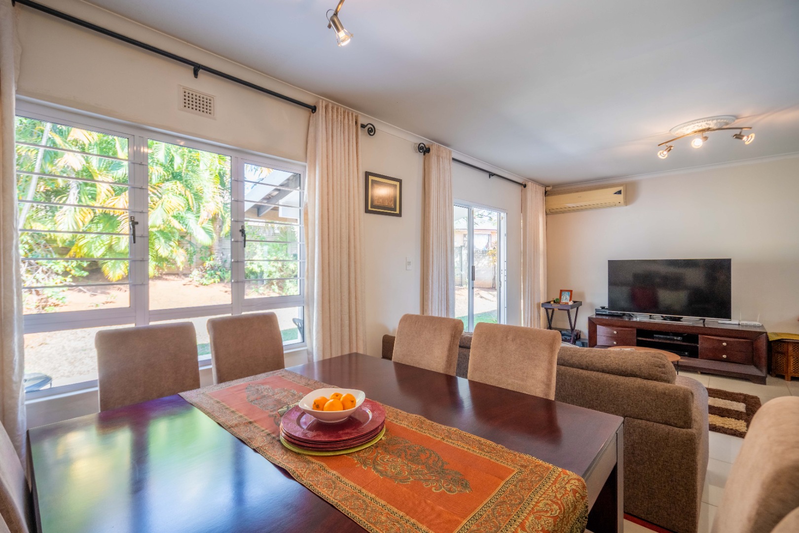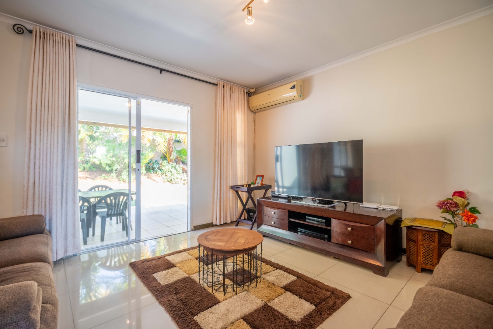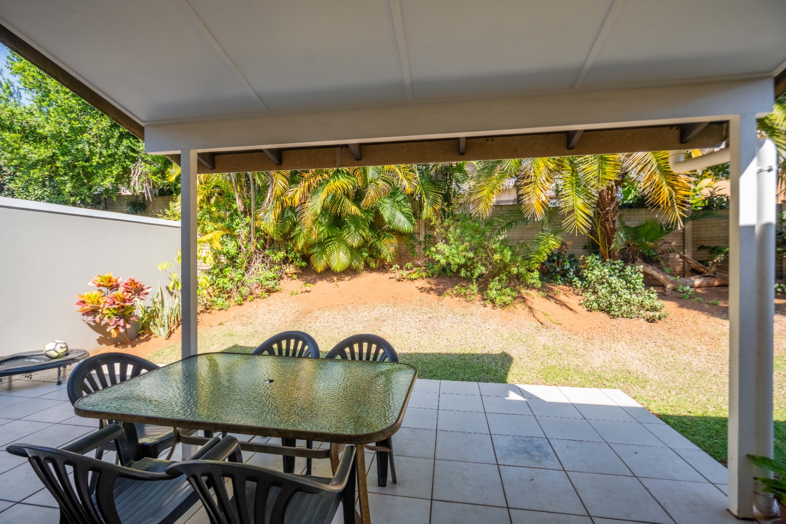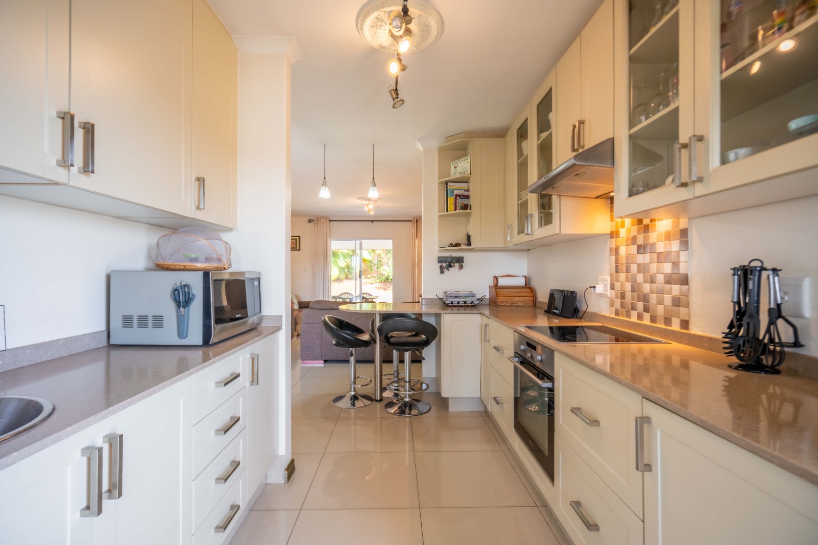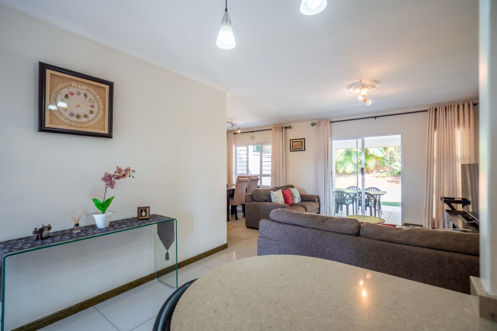 Glass doors open seamlessly from the lounge and dining area onto a covered patio and a totally private, lush tropical garden that wraps around the home. Morning coffees, weekend braais, barefoot afternoons with the dogs or kids playing safely, this outdoor space is pure magic and feels like your own private retreat.