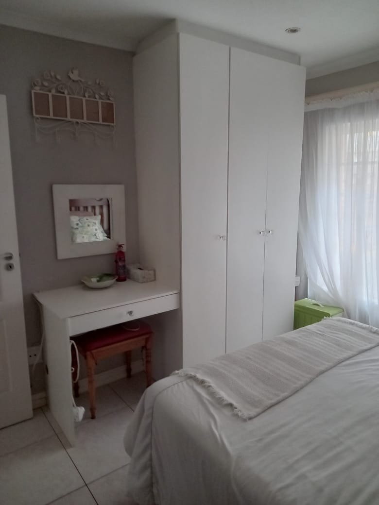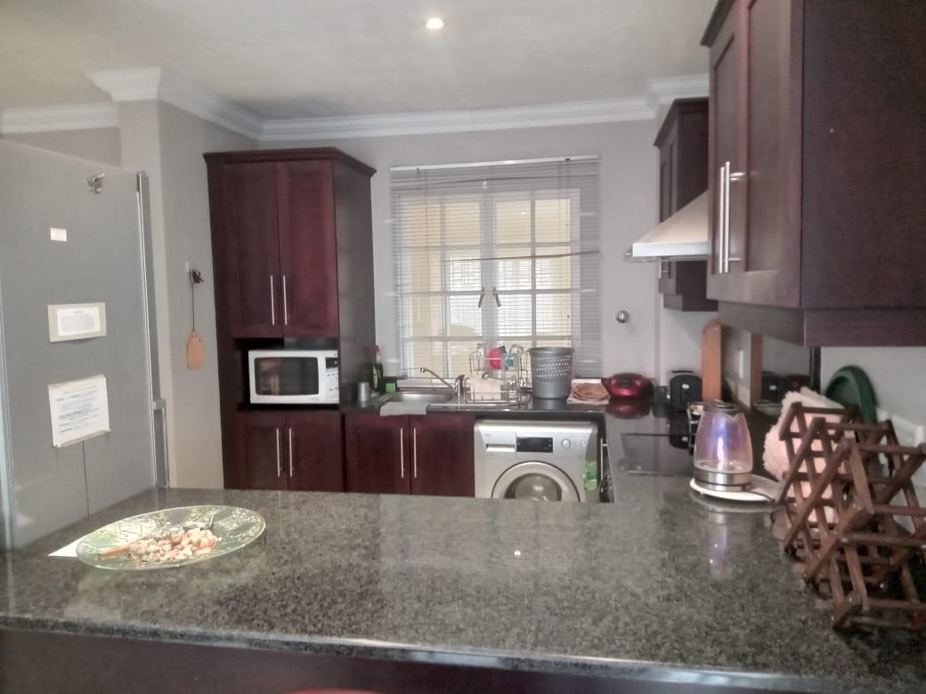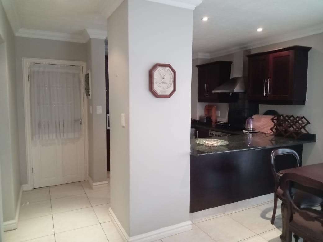 This modern 1-bedroom, 1-bathroom apartment is situated within the secure Somerset Valley Estate in Umhlanga, South Africa. The residence features an inviting open-plan living and dining area, enhanced by abundant natural light streaming through large windows and French doors. Durable tiled flooring extends throughout, ensuring easy maintenance, while an air conditioning unit provides comfort in the main living space.