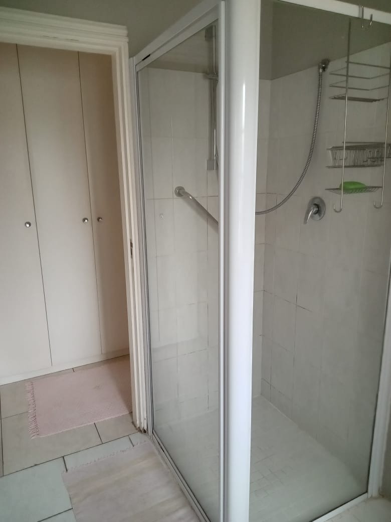 The spacious bedroom offers comfort with an air conditioning unit, built-in wardrobes for ample storage, and a large window providing natural light. The en-suite bathroom features a practical walk-in shower with a clear glass enclosure and a safety grab bar. French doors from the living area open onto a private, tiled balcony, offering a pleasant outdoor retreat.