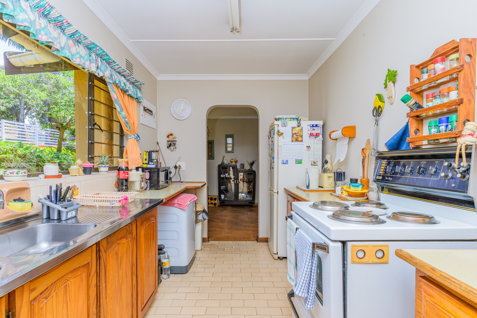 Neat, functional kitchen with wooden cabinets with direct access to an enclosed courtyard ideal for hanging