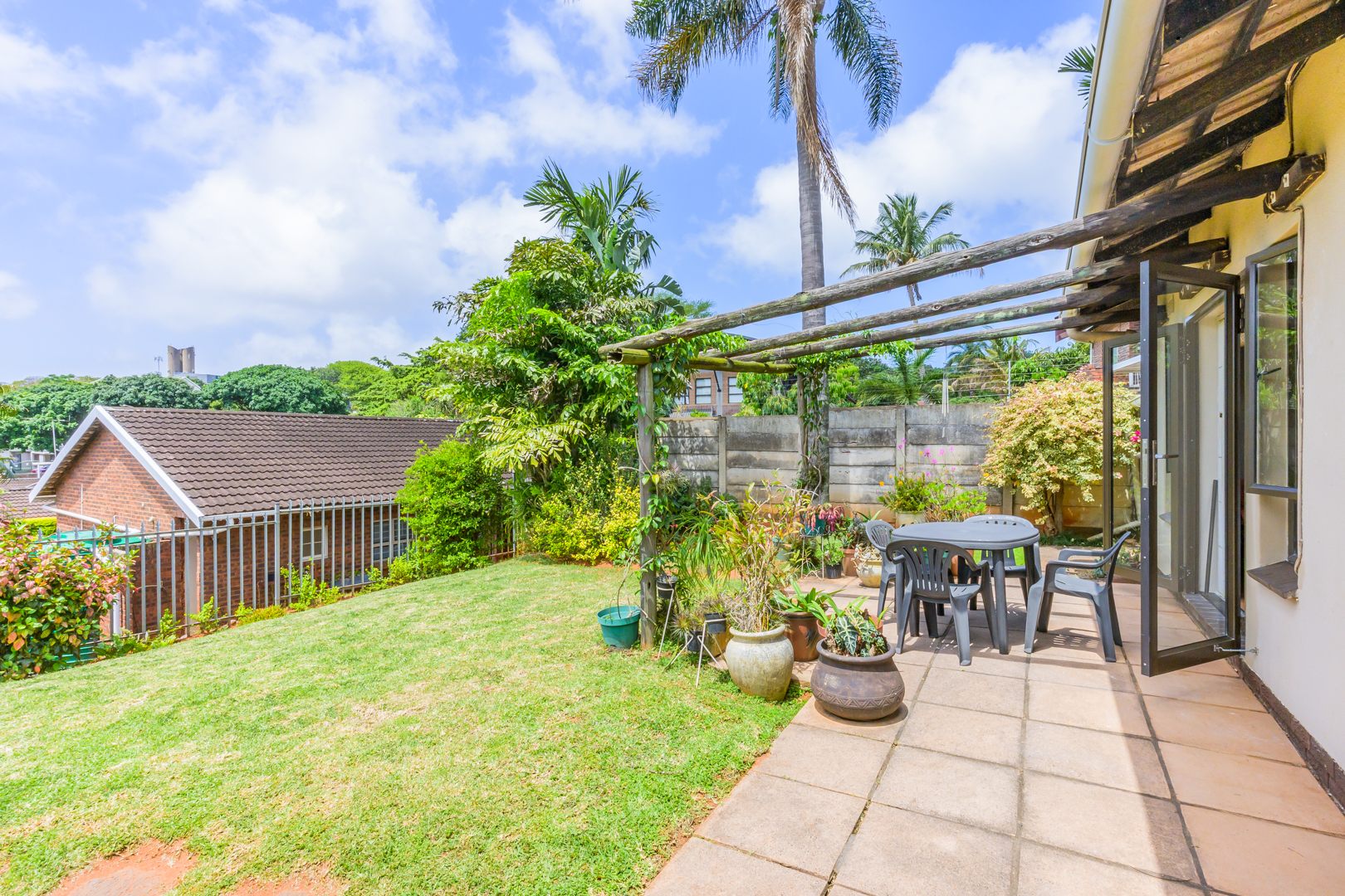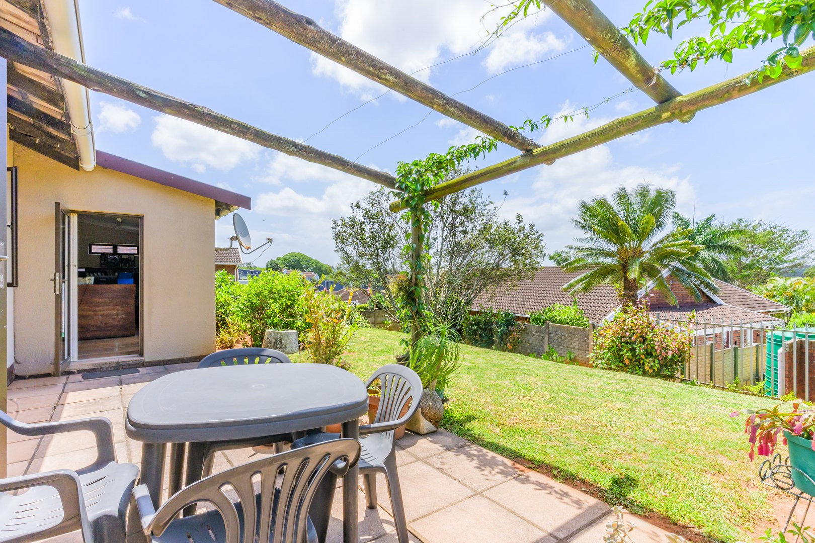 The dining room and lounge flows out to a sunny patio and neat colourful garden, perfect for entertaining