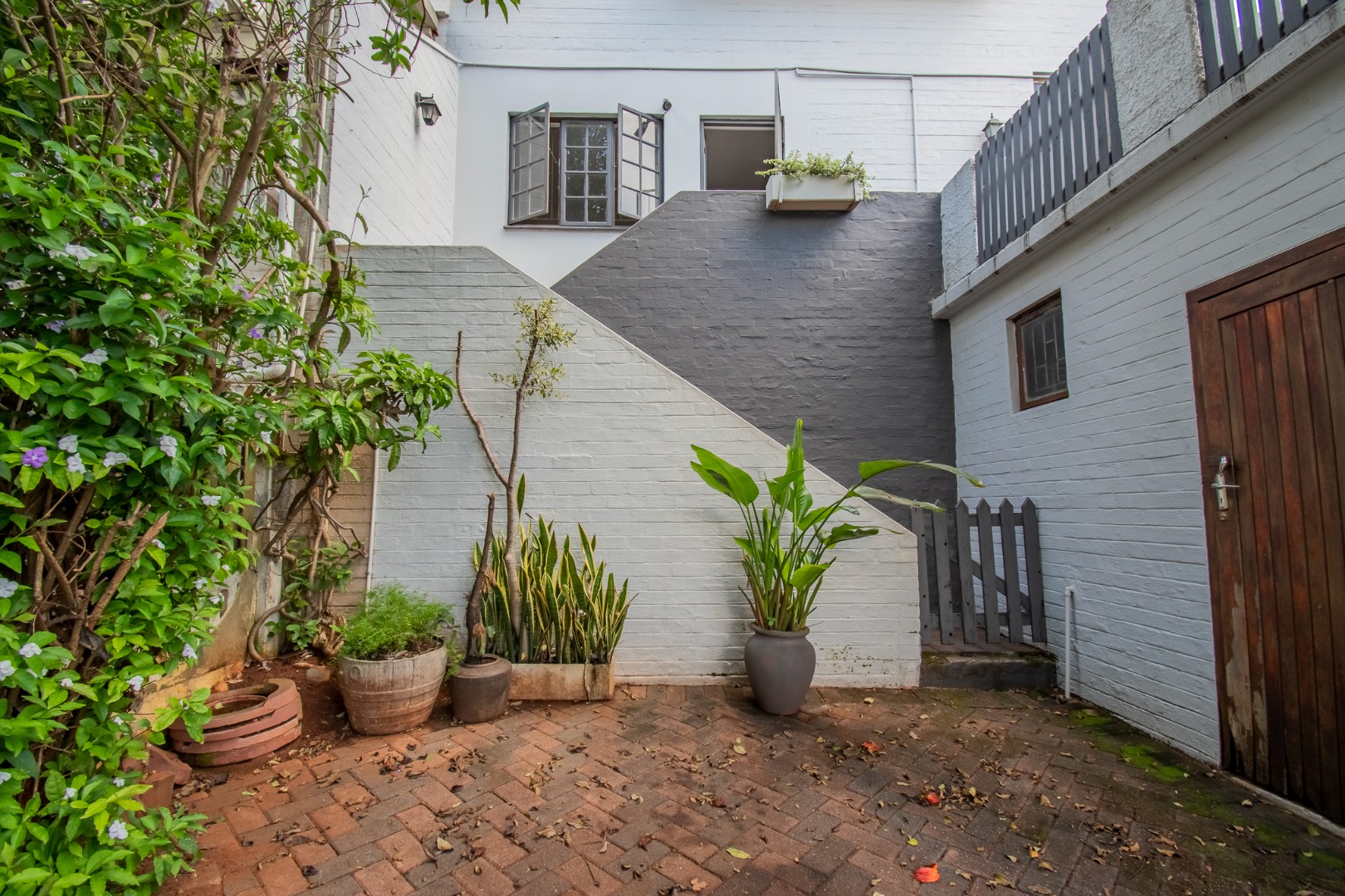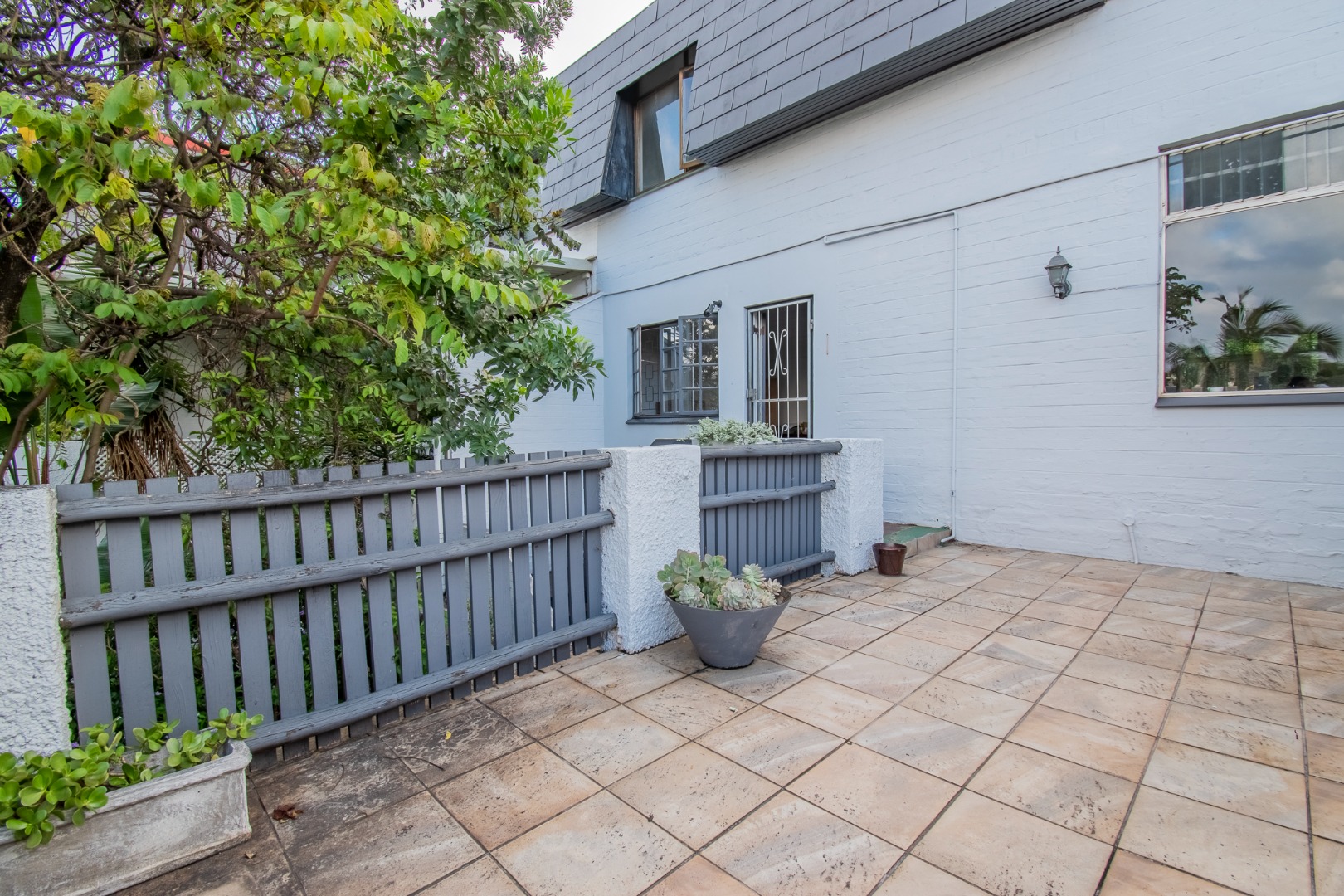 Outside, the paved patio overlooks a private garden with tiered levels and mature greenery, offering a peaceful space to enjoy fresh air and quiet afternoons. The home also includes a single automated garage, parking for three additional cars, an alarm system, and a secure pedestrian gate.