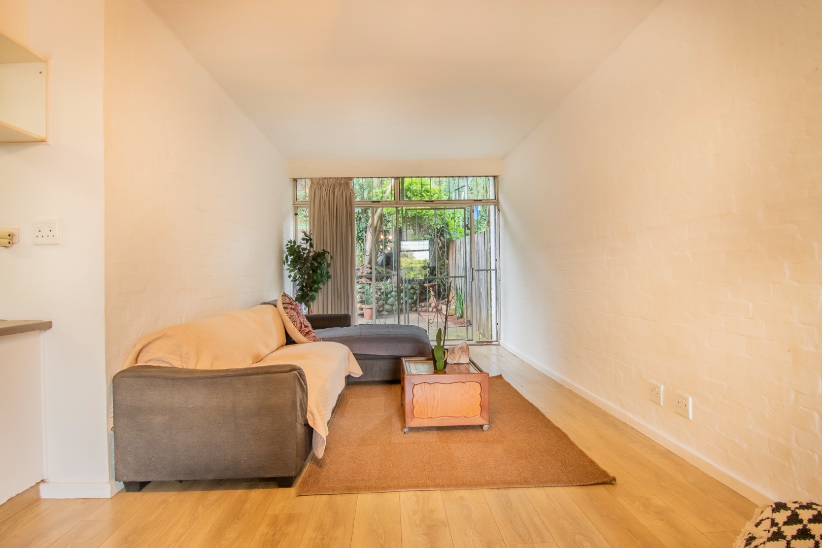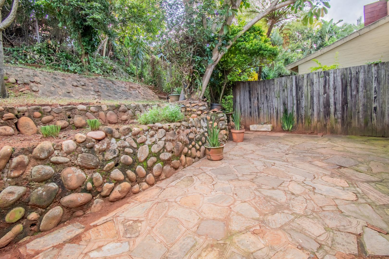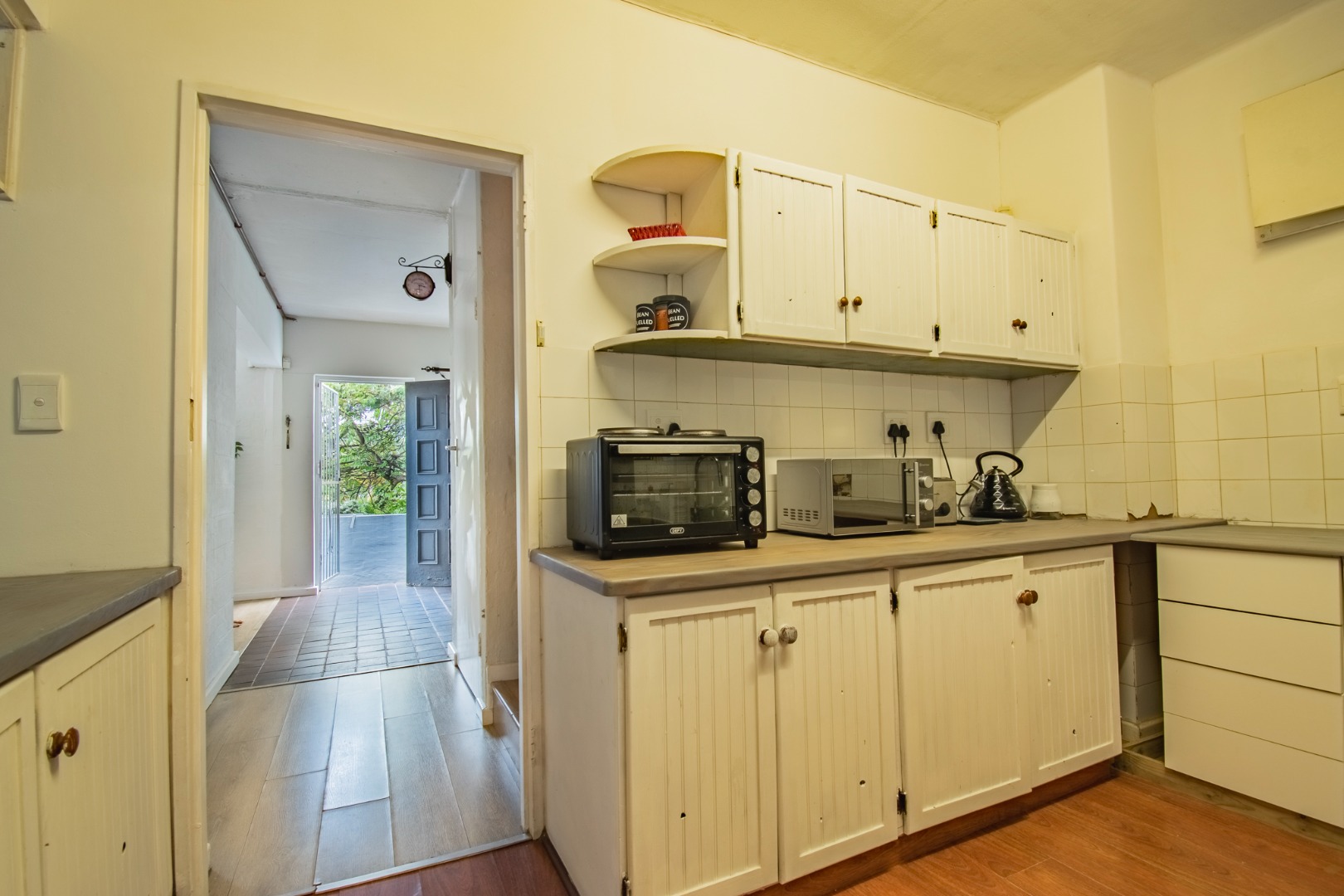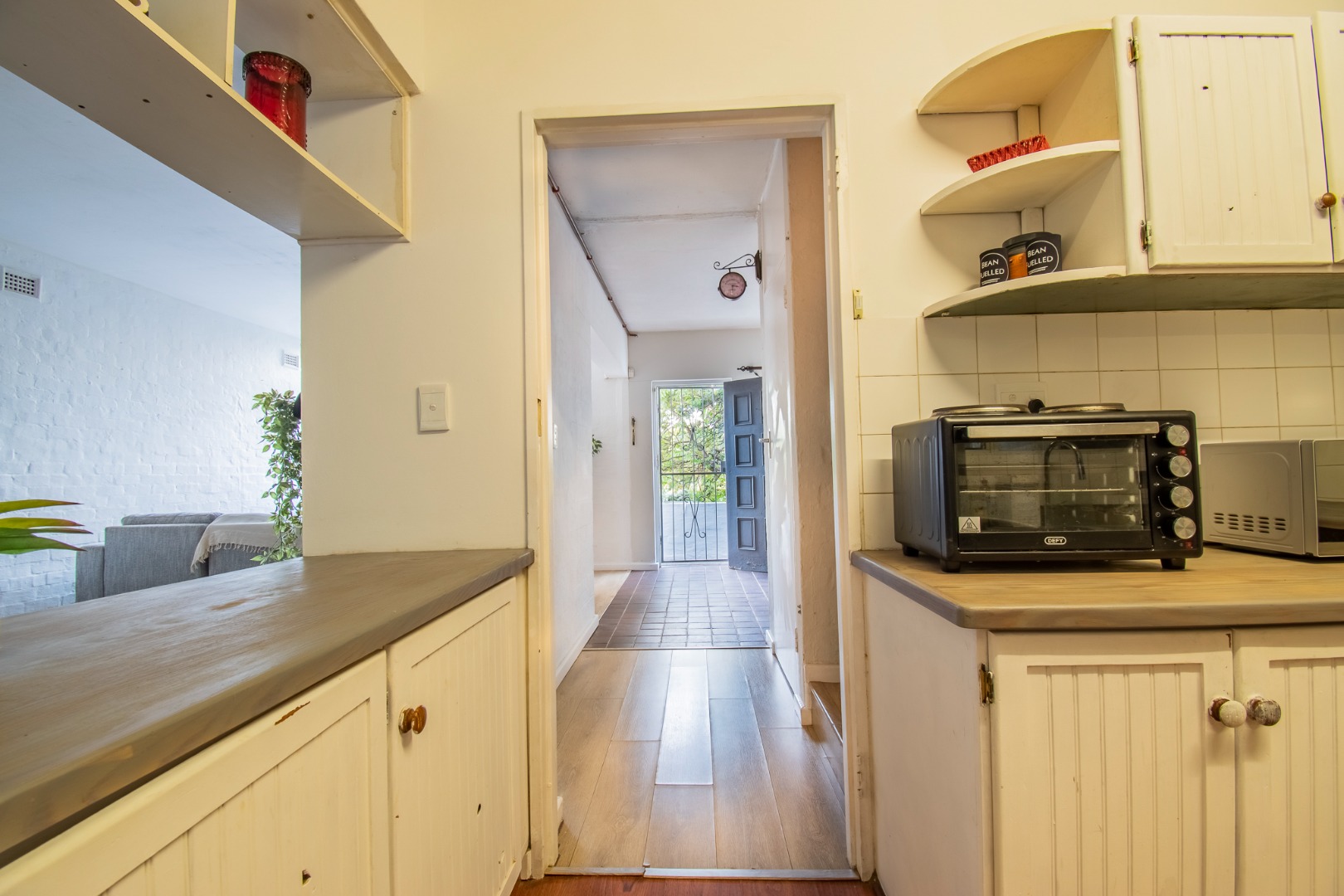 Straight ahead is the kitchen with built-in cabinetry and a serving hatch to the dining space. Off the kitchen, a covered utility room, a multi purpose room to utilize as a studio, study or work from home space. Off this utility room are staff ablutions, which could also be converted into a bathroom if renovated. From here, you access the paved patio and private garden area.
