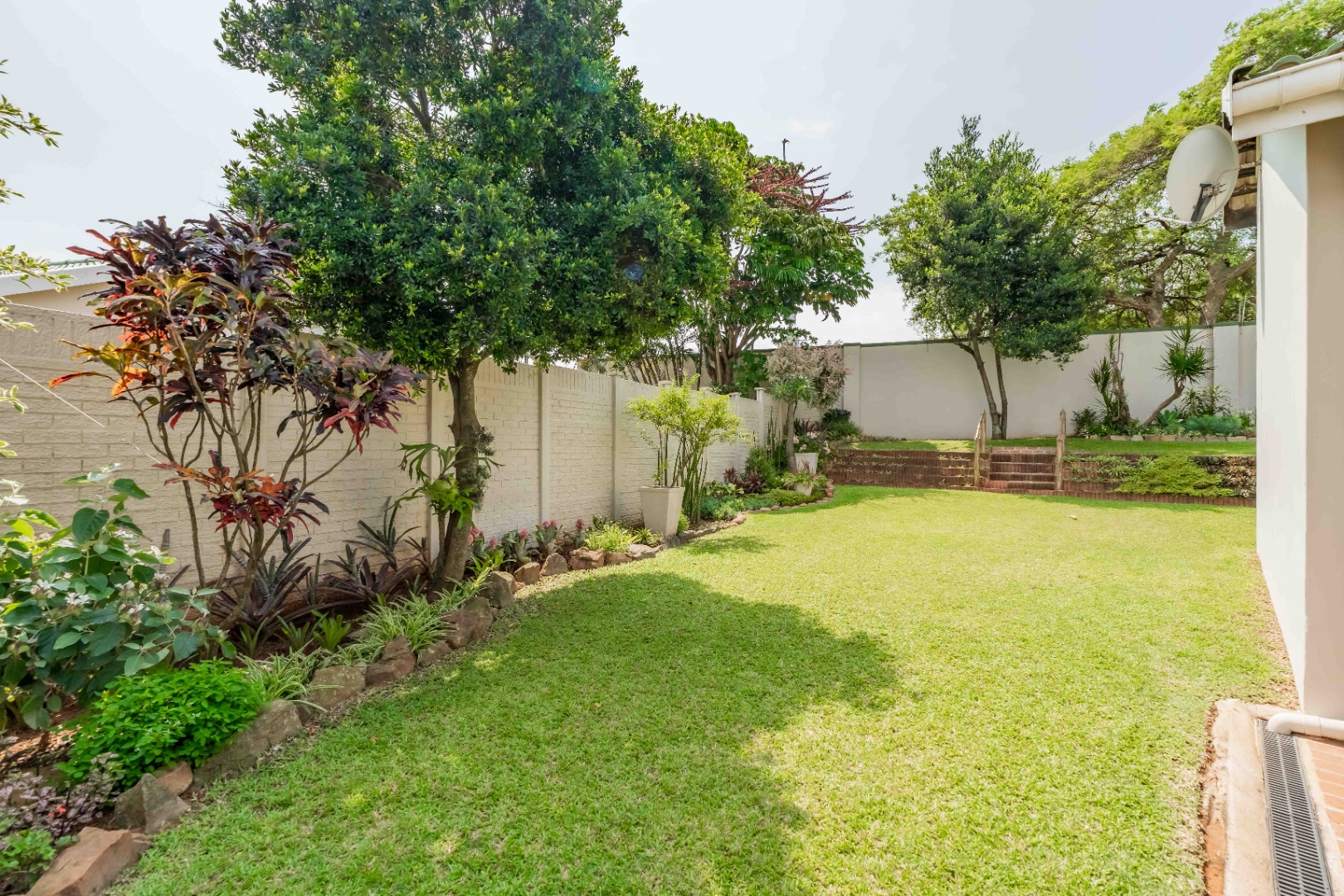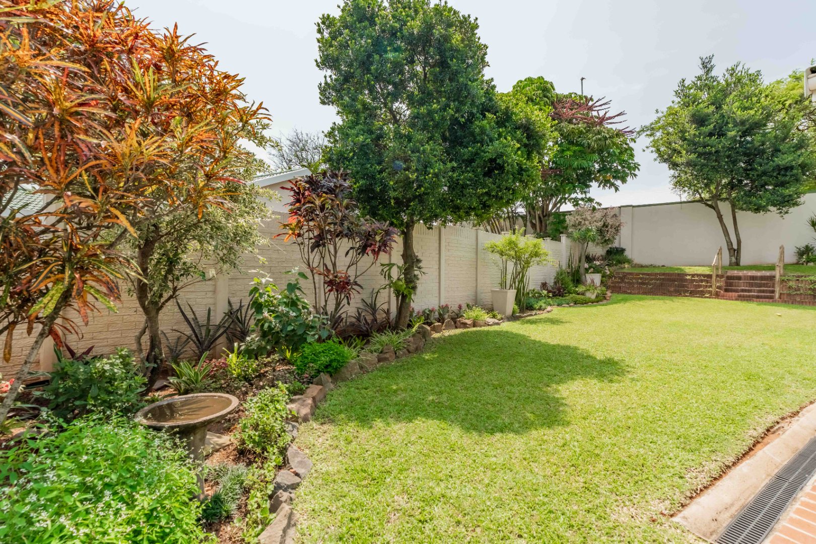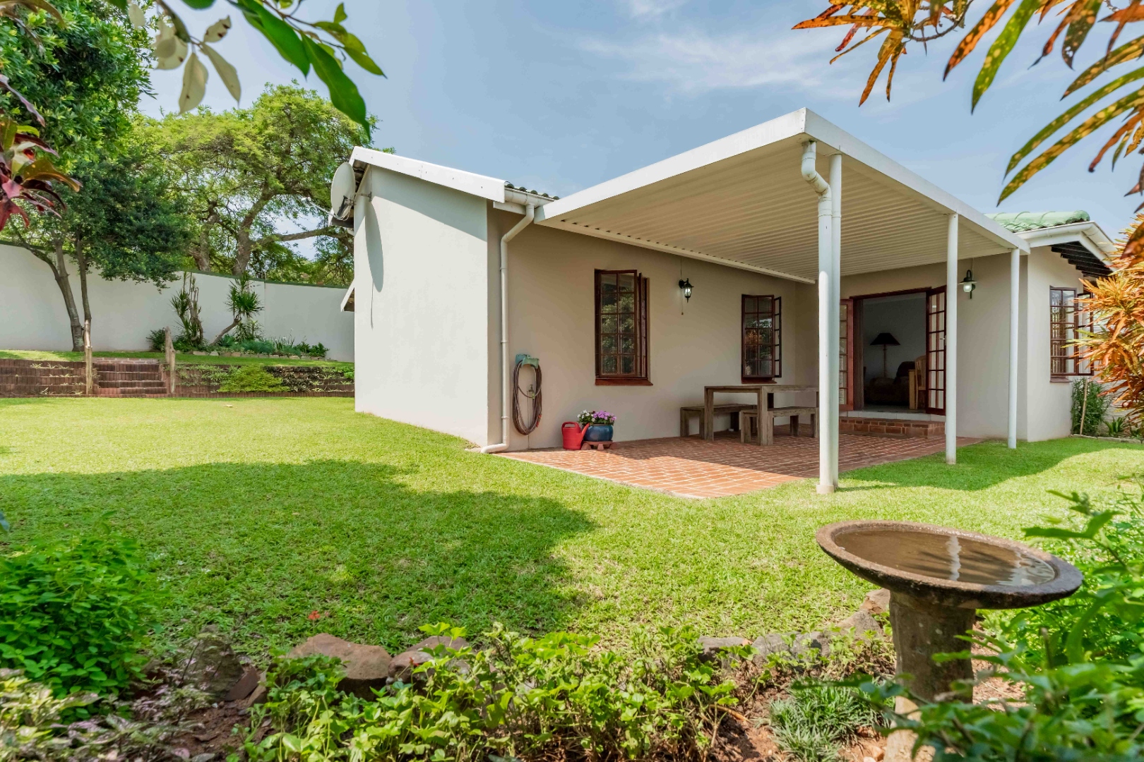 Step out onto a covered, red-brick patio overlooking a beautifully landscaped, terraced garden — privately walled and designed for easy upkeep. Whether you love entertaining, gardening, or simply enjoying quiet outdoor moments, this space is a standout feature.