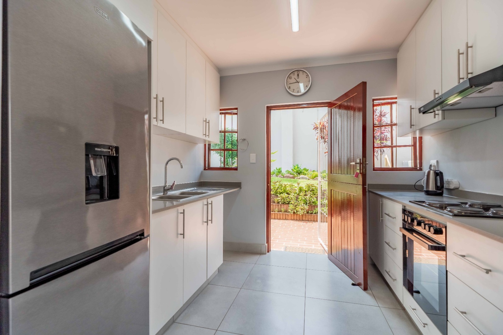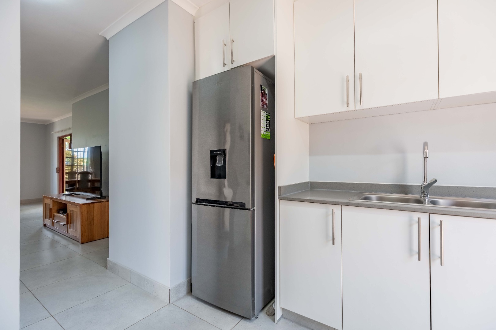 The kitchen is both practical and elegant, featuring ample white cabinetry, modern fittings, and convenient access to the outdoor patio.