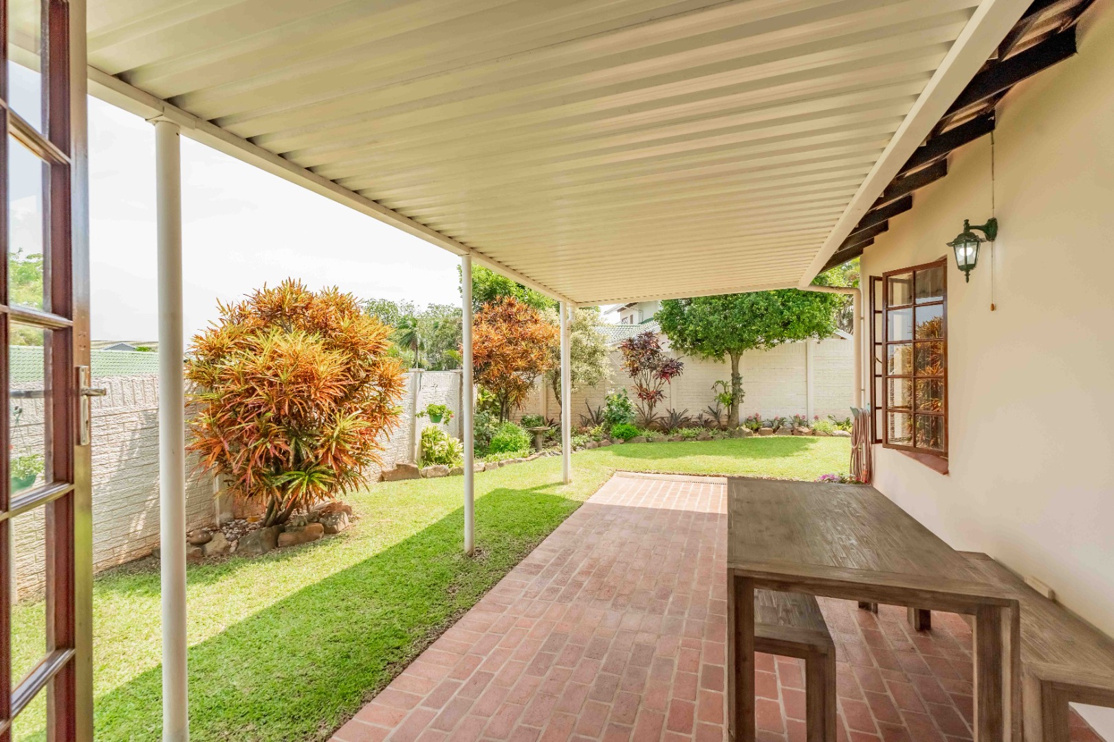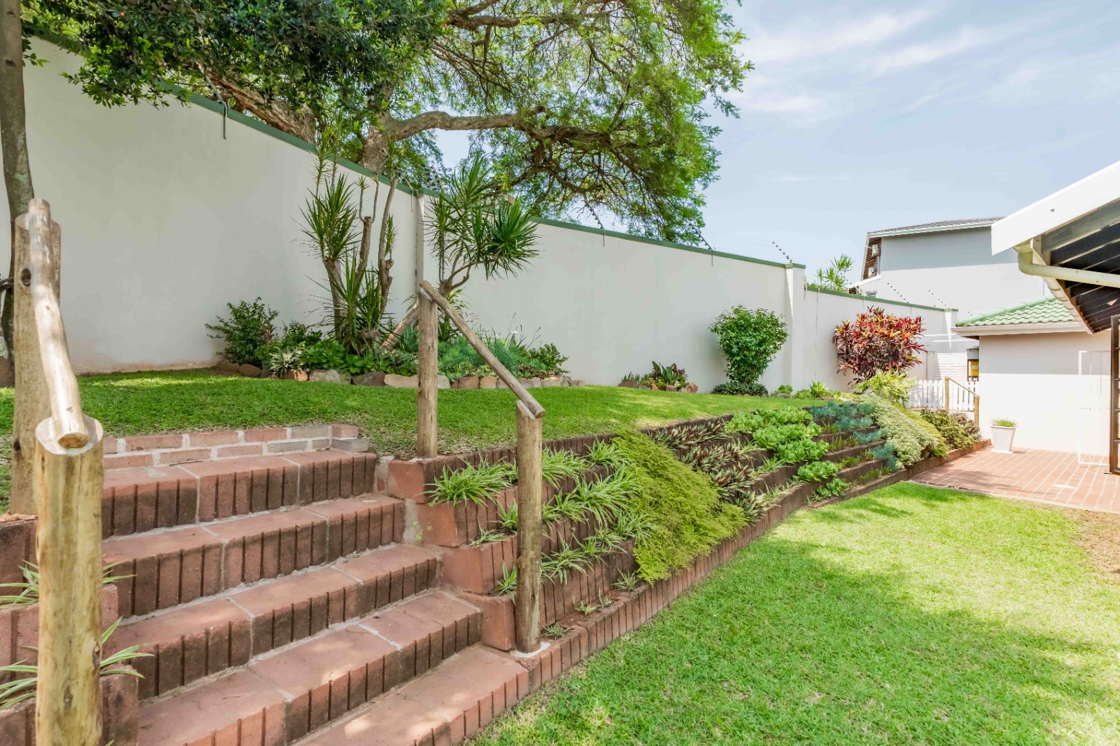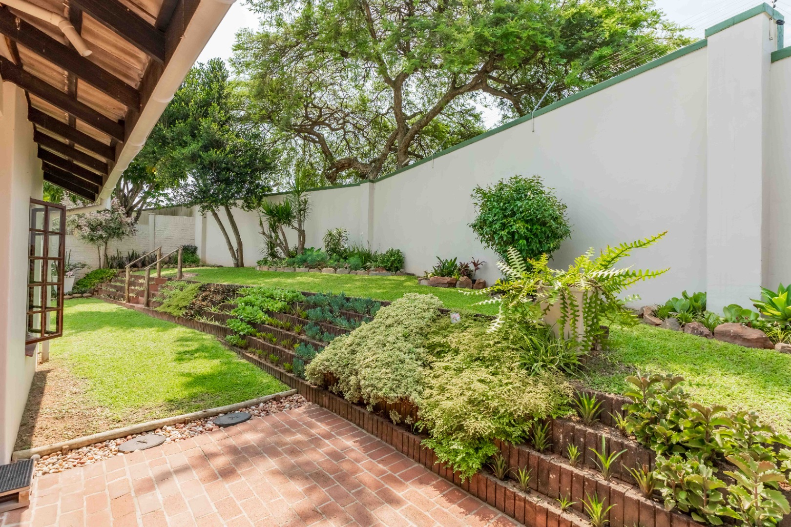 Step out onto a covered, red-brick patio overlooking a beautifully landscaped, terraced garden — privately walled and designed for easy upkeep. Whether you love entertaining, gardening, or simply enjoying quiet outdoor moments, this space is a standout feature.