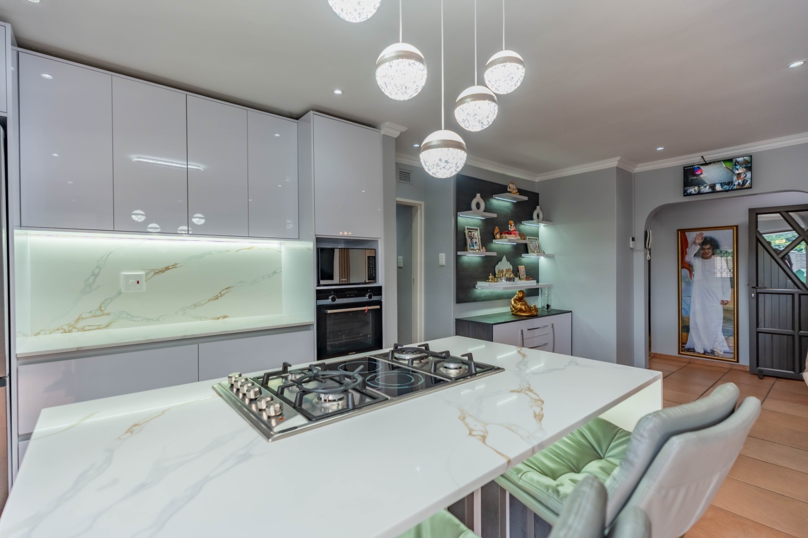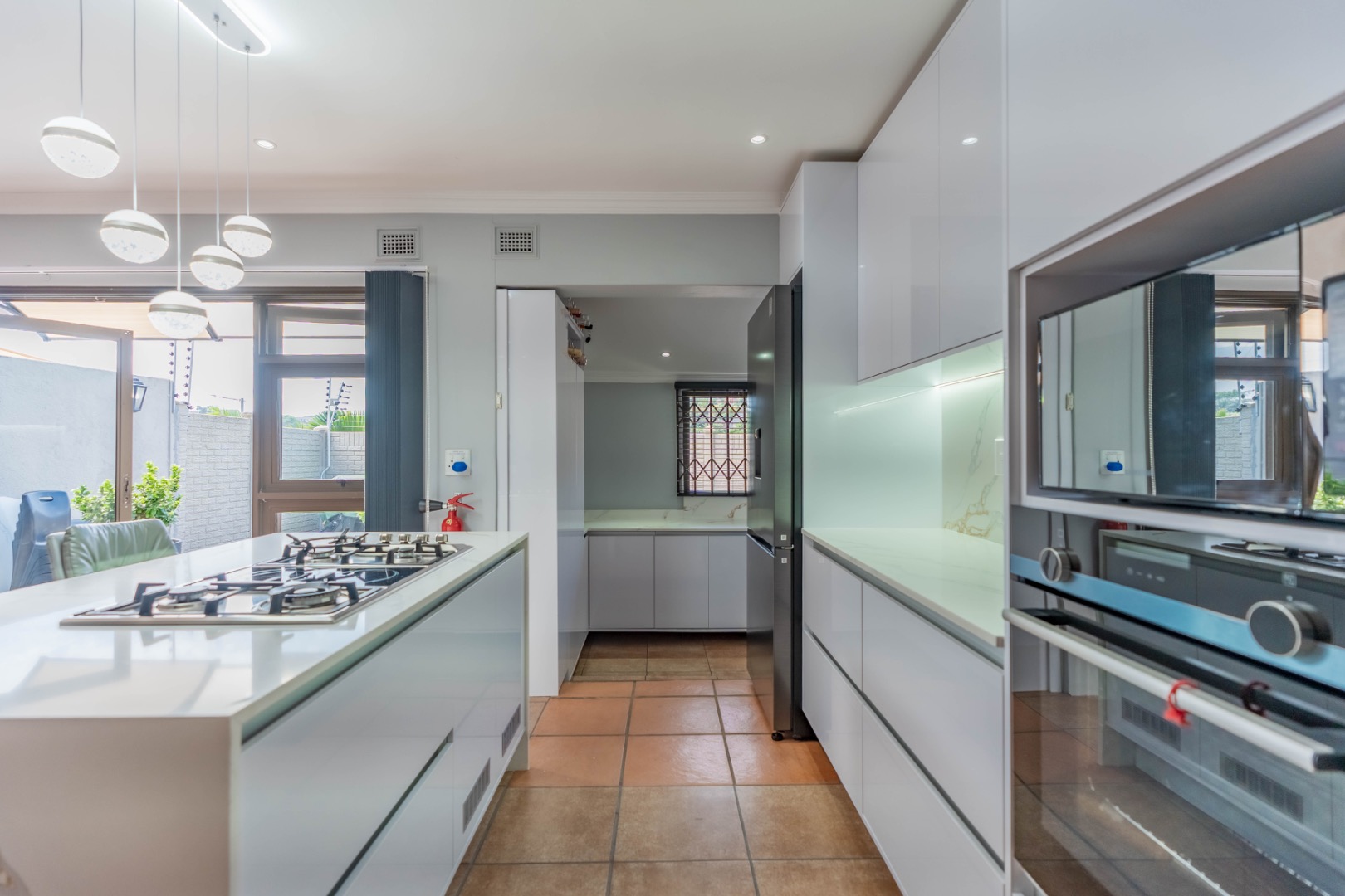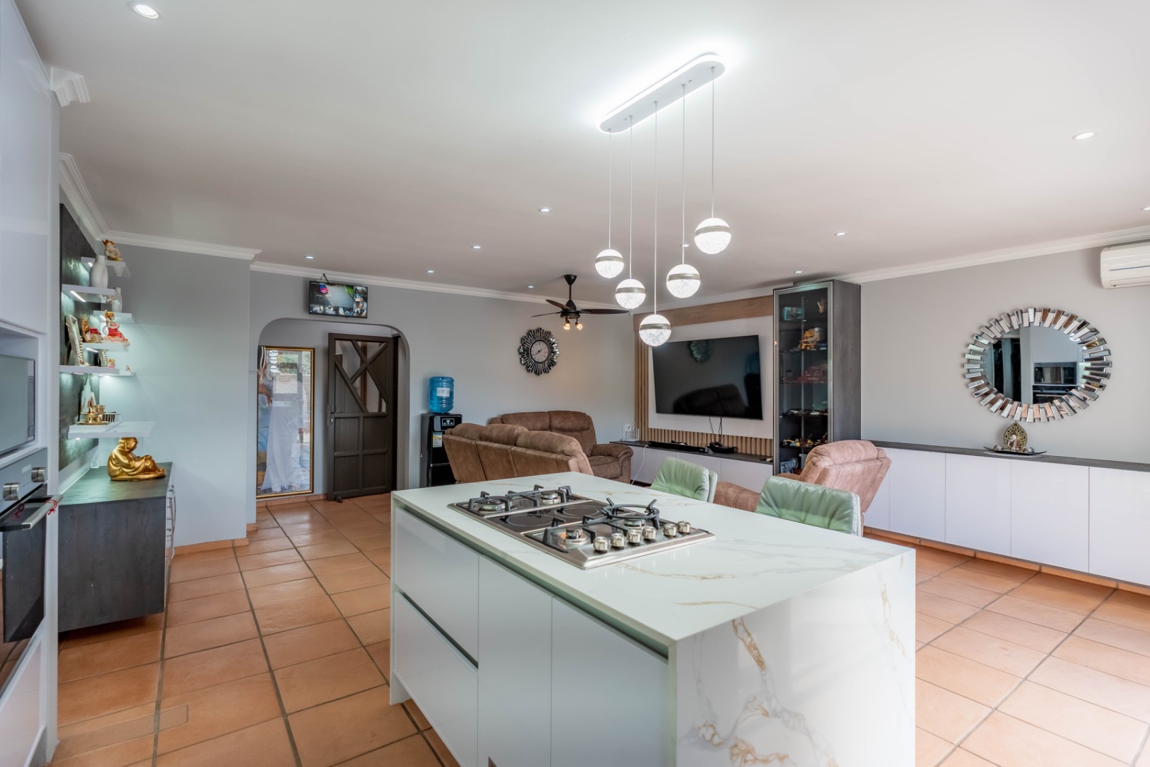 The sleek, contemporary kitchen is truly the heart of the home, featuring quartz countertops, an eye-level oven, and a gas hob with electric oven set within a stylish centre island. This is complemented by a spacious separate scullery with loads of built-in cupboards, plumbing for appliances, and additional storage—an absolute winner in a home! The dining and lounge areas are enhanced by modern built-in server/display units and shelving, while carefully designed lighting creates the perfect ambiance for any occasion.