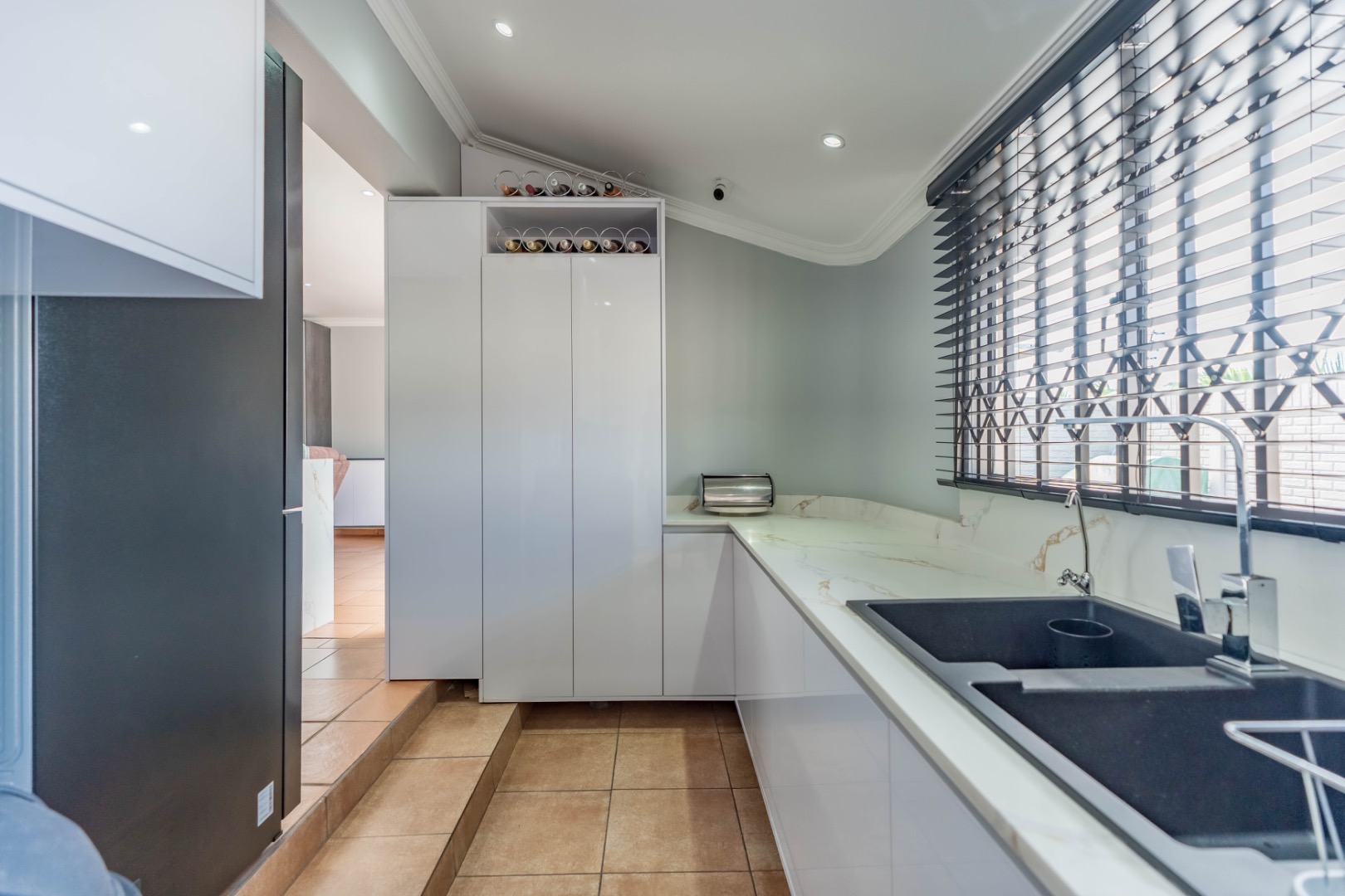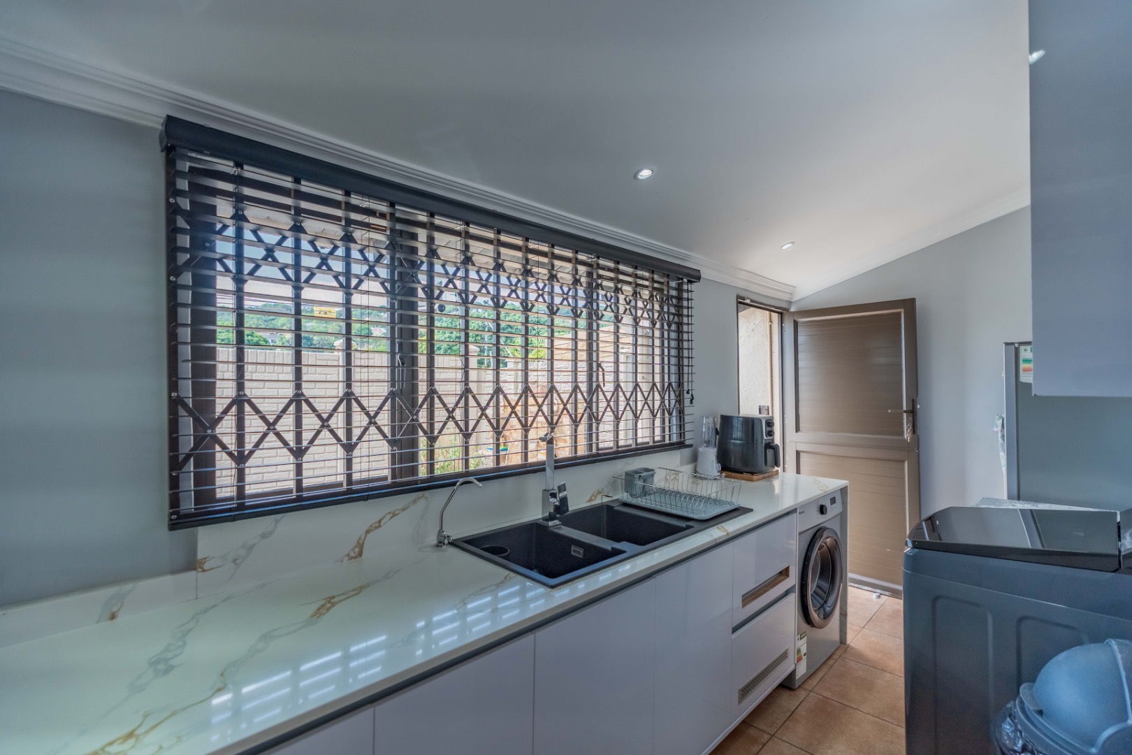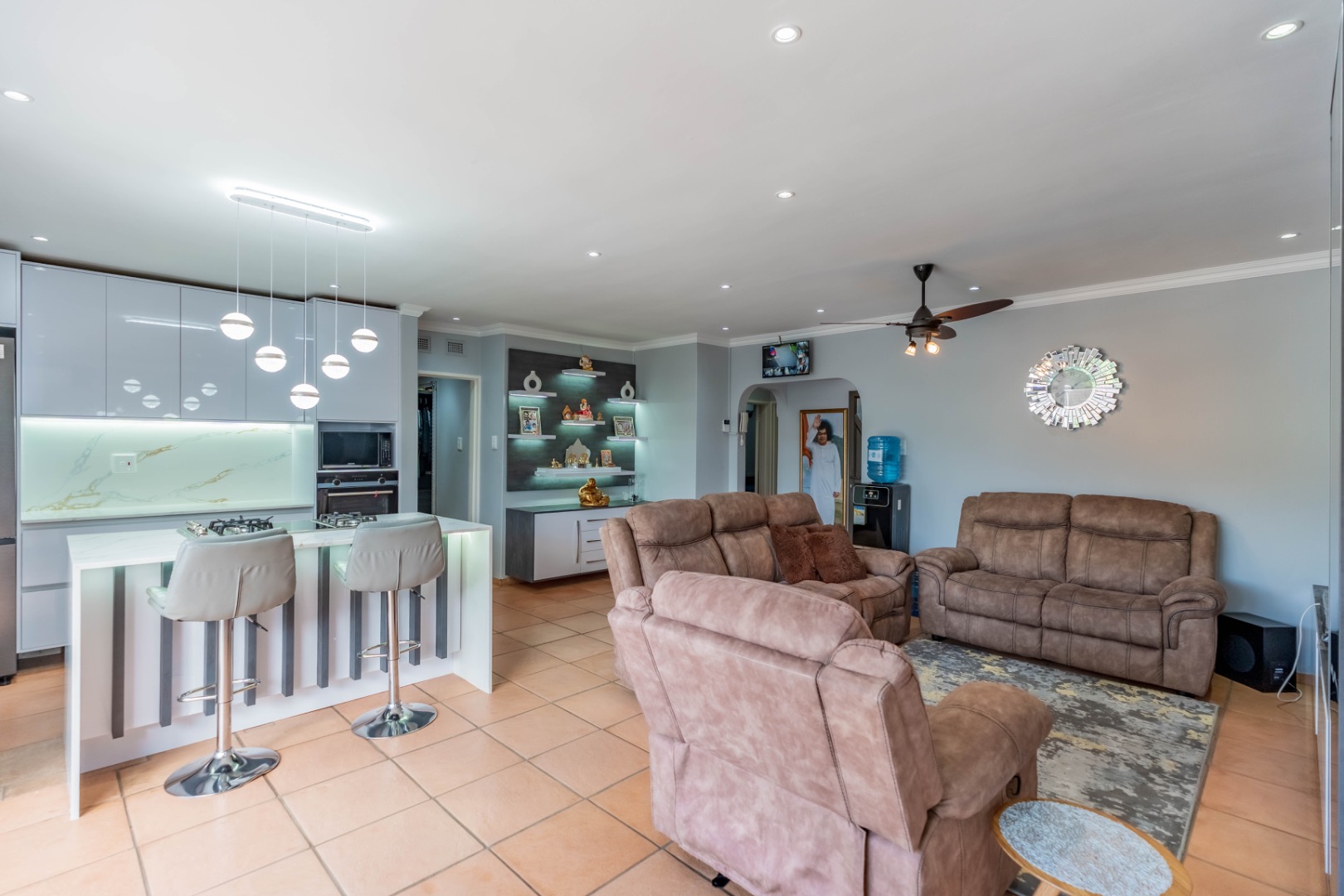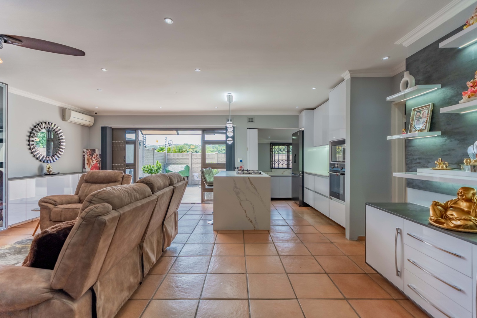 The sleek, contemporary kitchen is truly the heart of the home, featuring quartz countertops, an eye-level oven, and a gas hob with electric oven set within a stylish centre island. This is complemented by a spacious separate scullery with loads of built-in cupboards, plumbing for appliances, and additional storage—an absolute winner in a home! The dining and lounge areas are enhanced by modern built-in server/display units and shelving, while carefully designed lighting creates the perfect ambiance for any occasion.