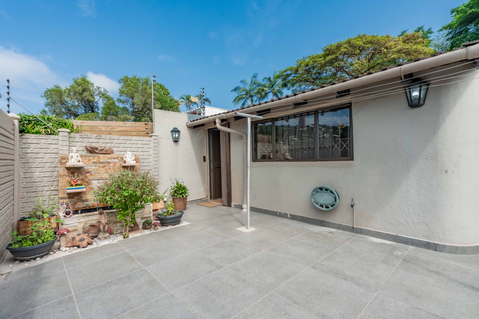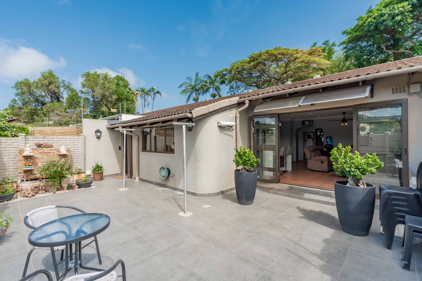 Natural light floods the open-plan living area, thoughtfully designed for comfort and flow, complete with air-conditioning and a ceiling fan—perfect for those summer days. Glass doors lead seamlessly to a private tiled courtyard with a tranquil water feature, creating an ideal space for entertaining or relaxing.