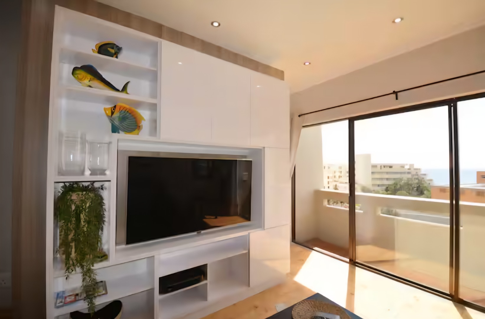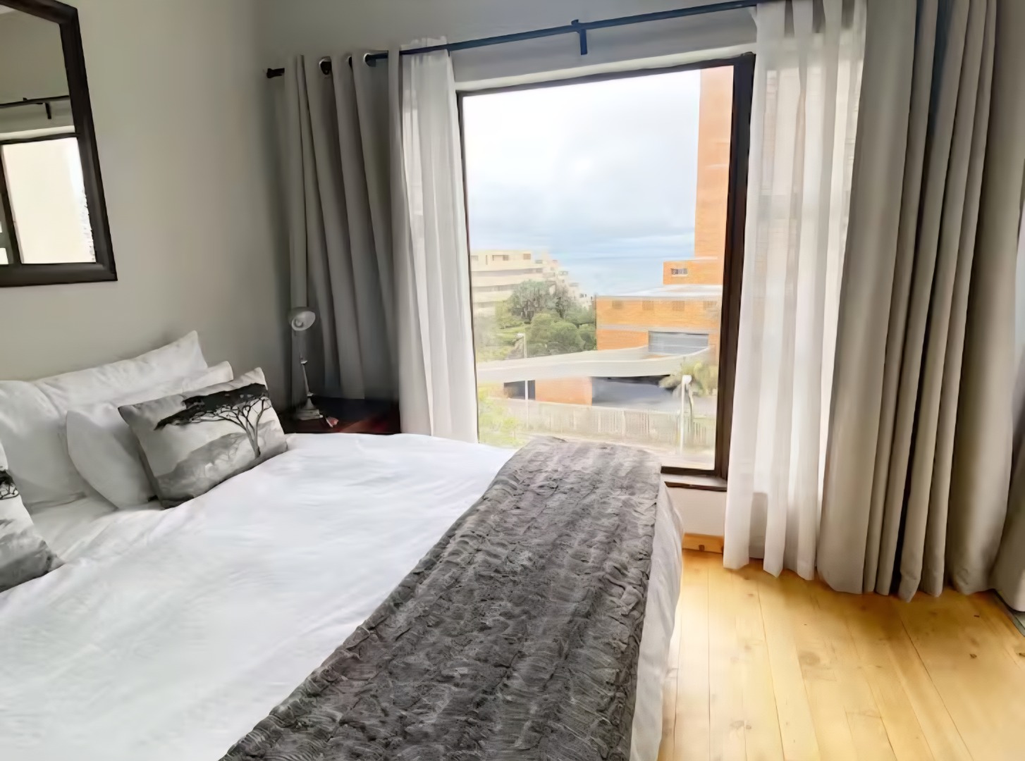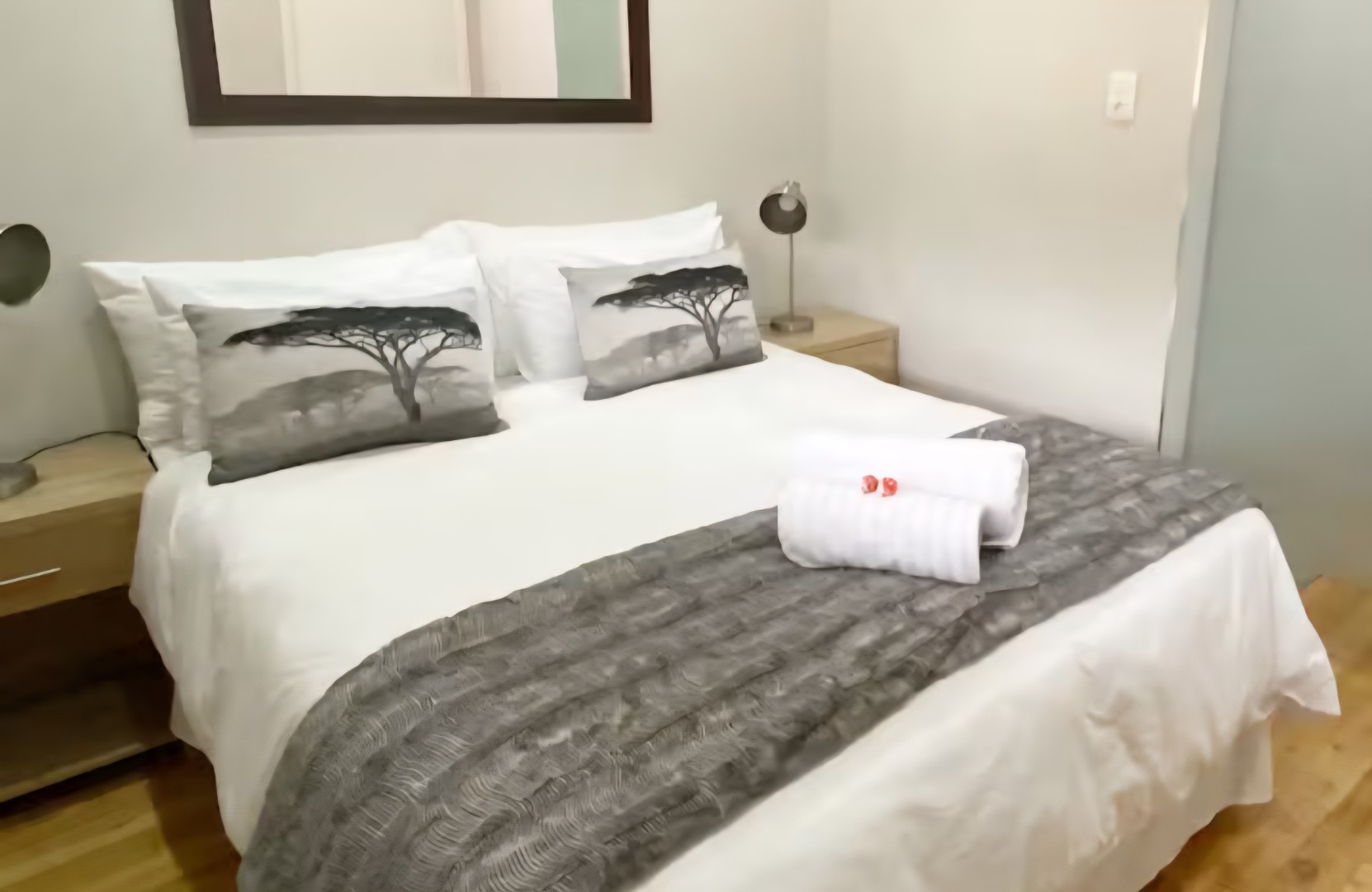This residence offers two comfortable bedrooms and two bathrooms, including one en-suite for added privacy. Each bedroom is clean and well-maintained, featuring warm wooden flooring and neutral decor. Large windows in the main bedroom provide ample natural light and glimpses of the ocean. Thematic safari-inspired accents add a touch of character, while functional bedside tables and lamps enhance comfort. The en-suite bathroom is accessible via a stylish frosted glass door.