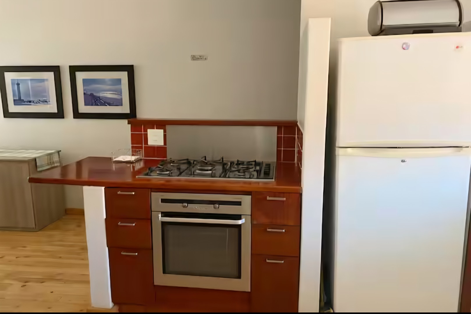 Step into a bright and functional open-concept living space, featuring consistent light wood flooring and neutral walls that create a versatile foundation. The lounge area boasts a sleek, white built-in media center and shelving, providing ample storage and a modern aesthetic. Large sliding glass doors invite abundant natural light and offer access to a private balcony. The integrated dining area flows seamlessly into the compact yet equipped kitchen, which includes a built-in gas stove and oven, along with a refrigerator and microwave. While functional, the kitchen maintains a traditional design with wooden cabinetry and a red tiled backsplash.