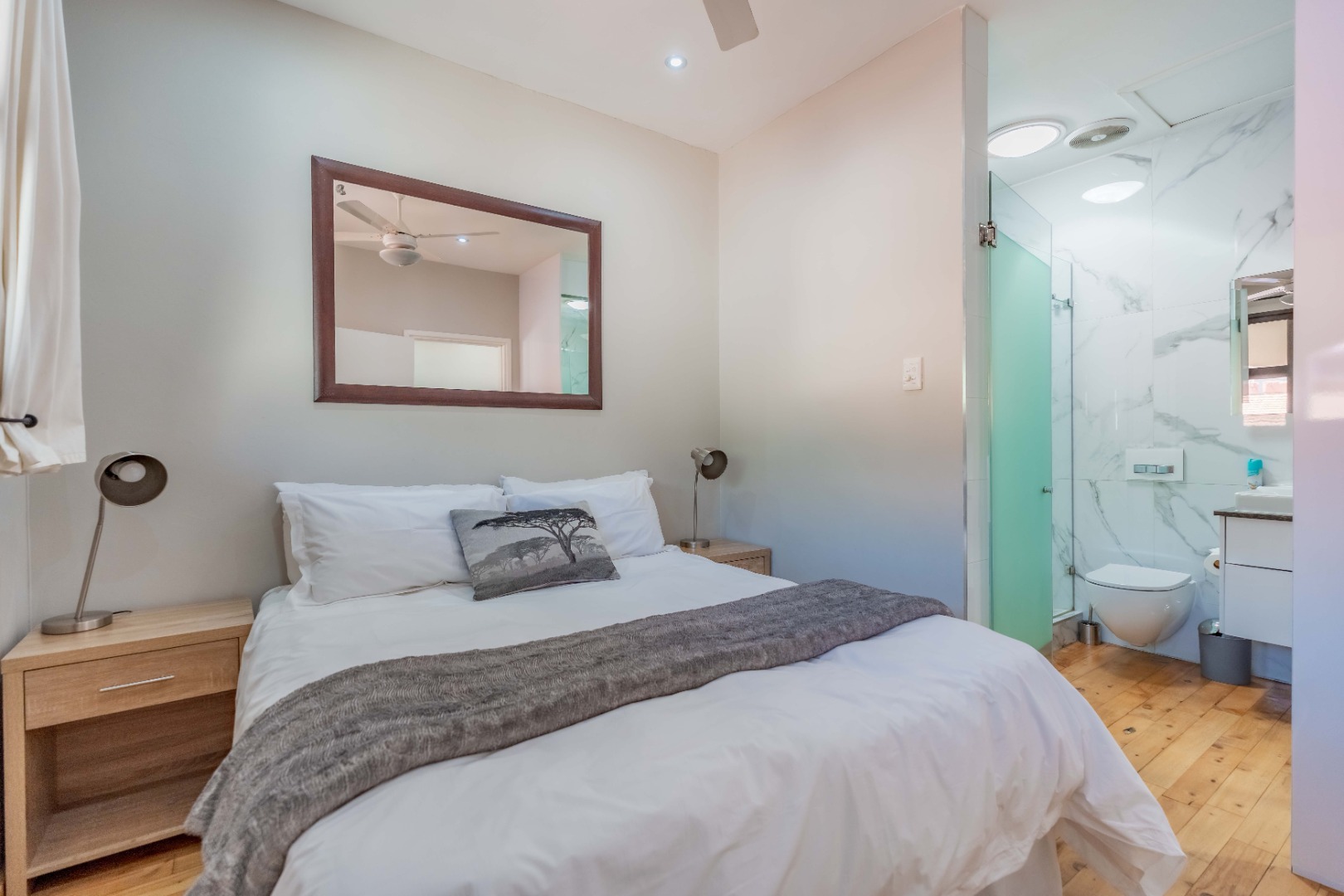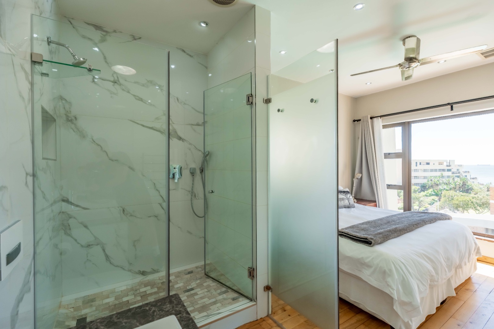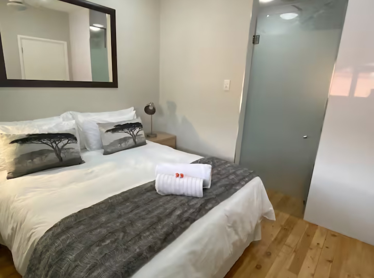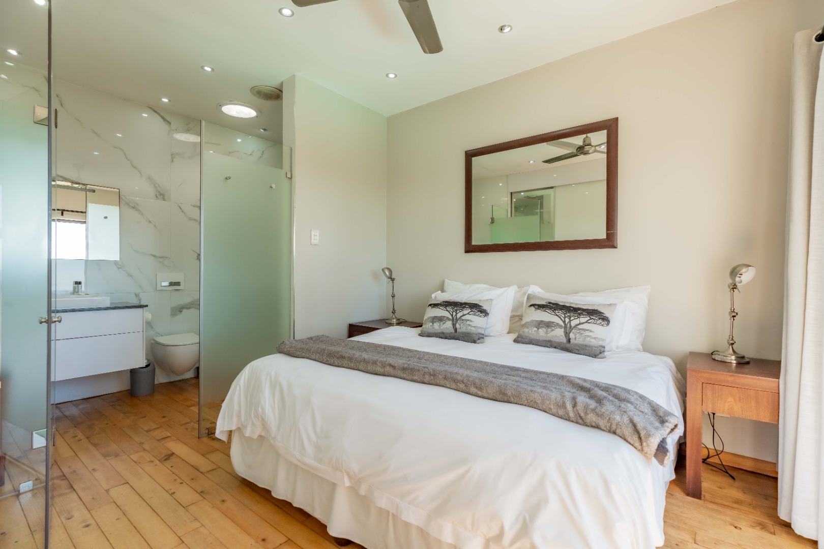 This residence offers two comfortable bedrooms and two bathrooms, including one en-suite for added privacy. Each bedroom is clean and well-maintained, featuring warm wooden flooring and neutral decor. Large windows in the main bedroom provide ample natural light and glimpses of the ocean. Thematic safari-inspired accents add a touch of character, while functional bedside tables and lamps enhance comfort. The en-suite bathroom is accessible via a stylish frosted glass door.