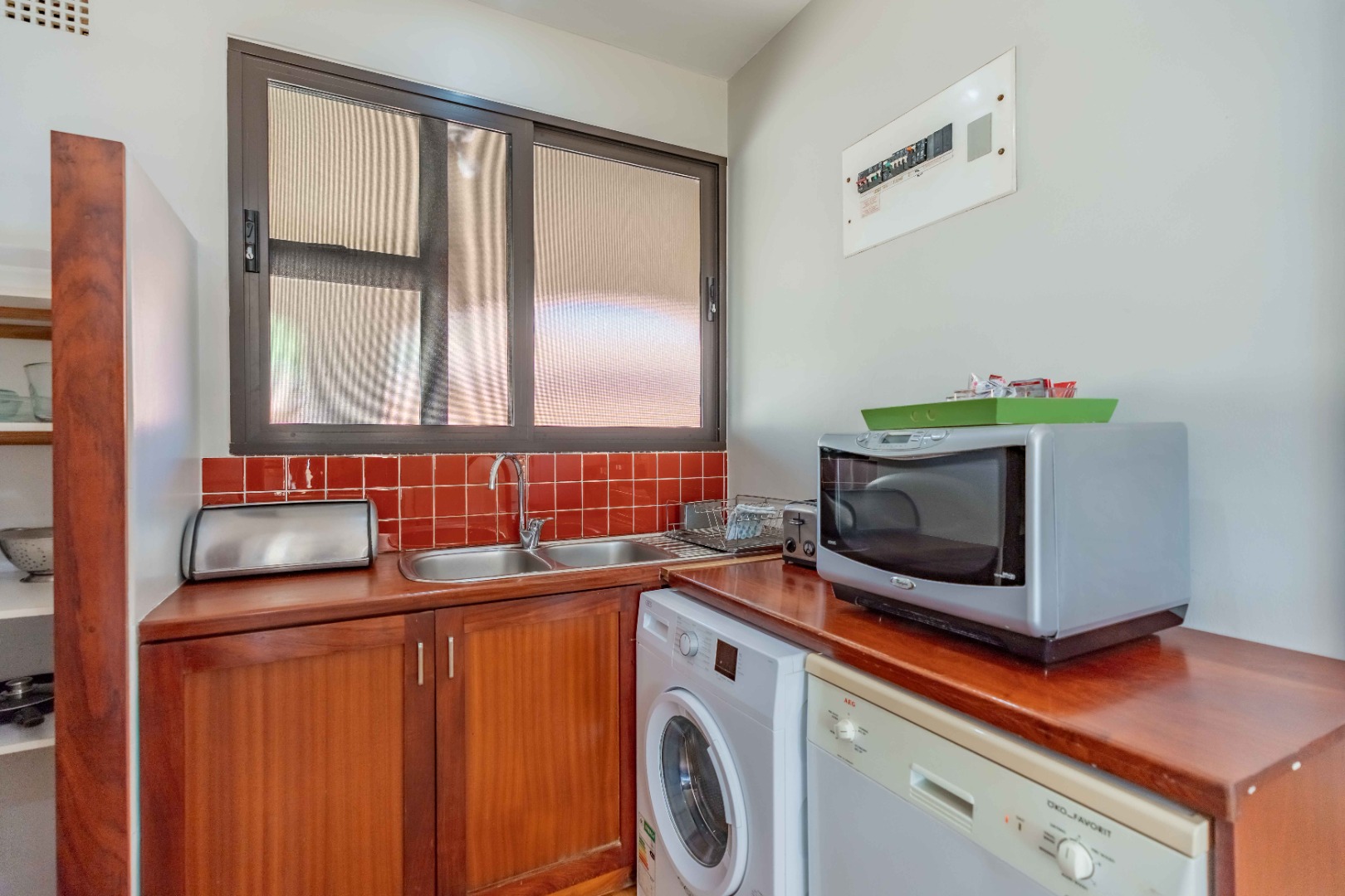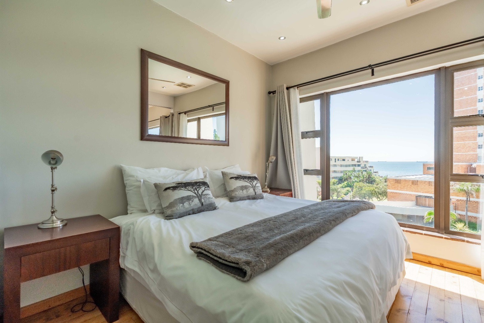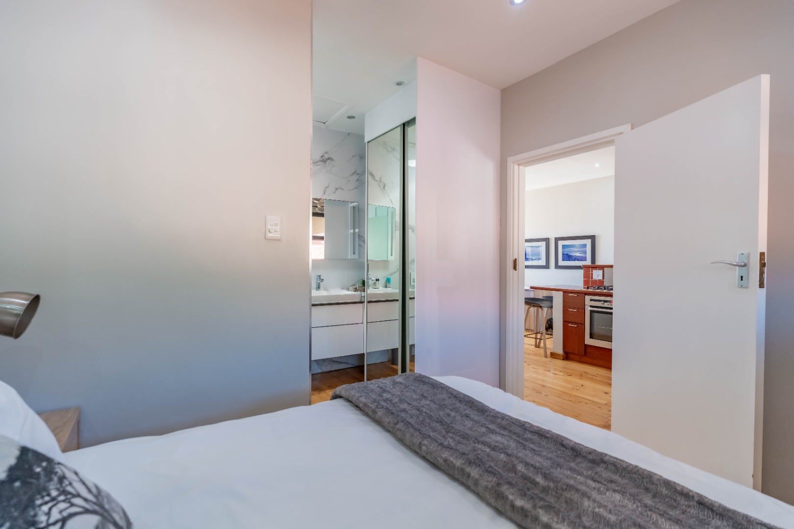 This residence offers two comfortable bedrooms and two bathrooms, including one en-suite for added privacy. Each bedroom is clean and well-maintained, featuring warm wooden flooring and neutral decor. Large windows in the main bedroom provide ample natural light and glimpses of the ocean. Thematic safari-inspired accents add a touch of character, while functional bedside tables and lamps enhance comfort. The en-suite bathroom is accessible via a stylish frosted glass door.
