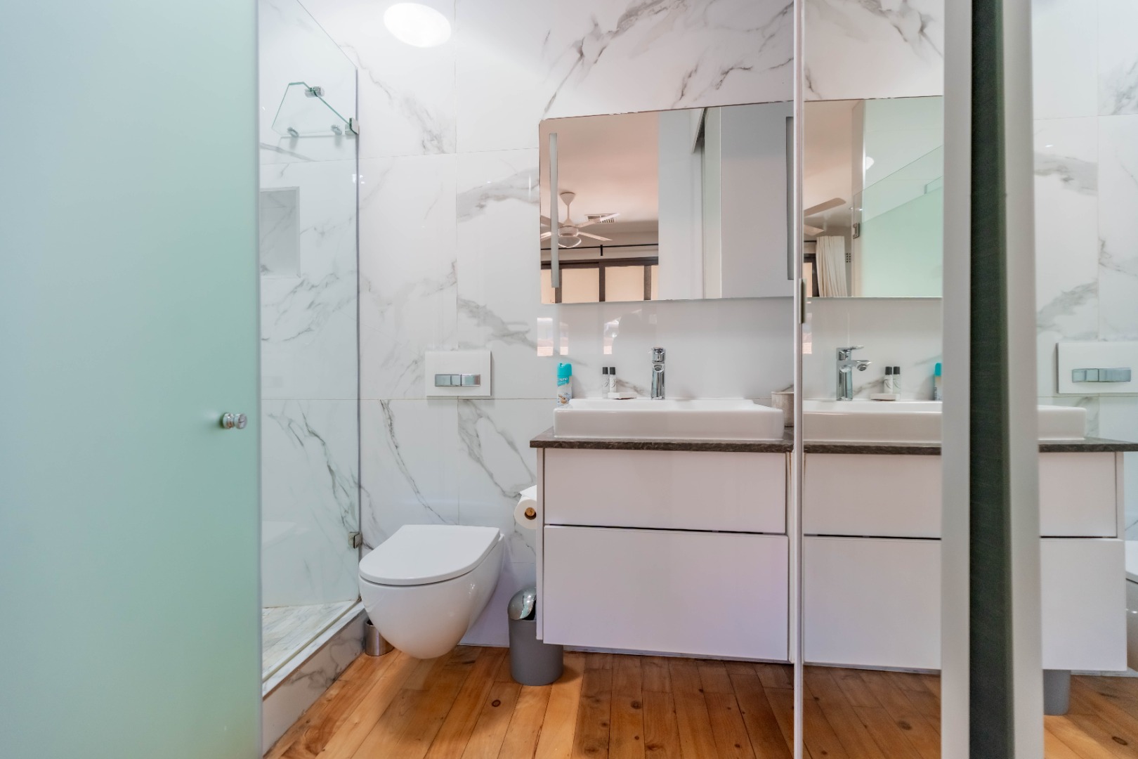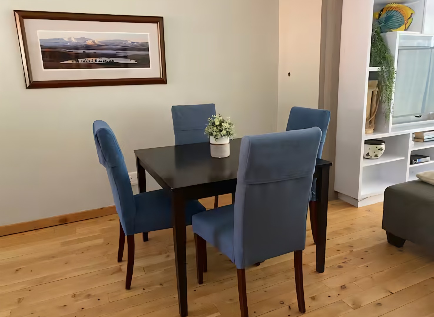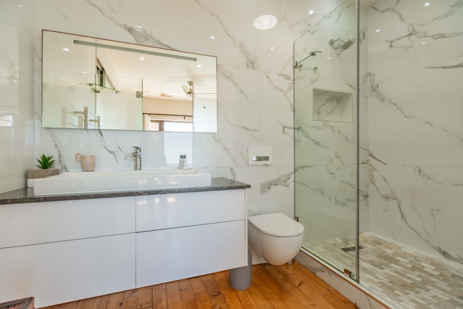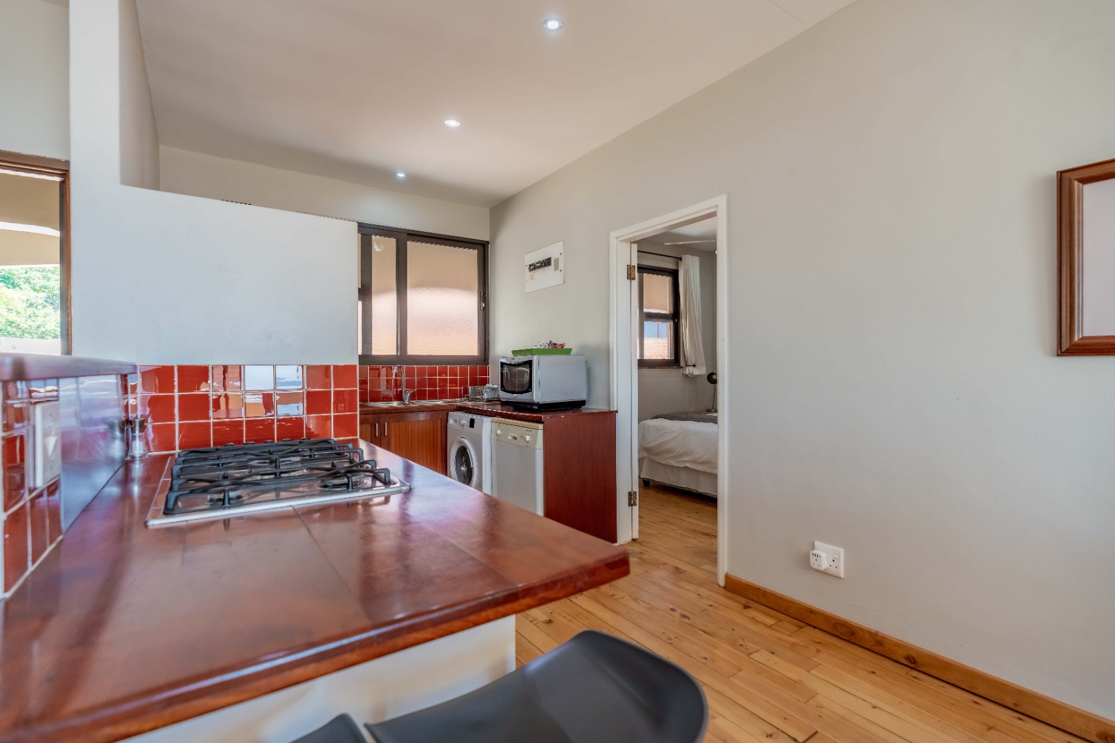 This residence offers two comfortable bedrooms and two bathrooms, including one en-suite for added privacy. Each bedroom is clean and well-maintained, featuring warm wooden flooring and neutral decor. Large windows in the main bedroom provide ample natural light and glimpses of the ocean. Thematic safari-inspired accents add a touch of character, while functional bedside tables and lamps enhance comfort. The en-suite bathroom is accessible via a stylish frosted glass door.