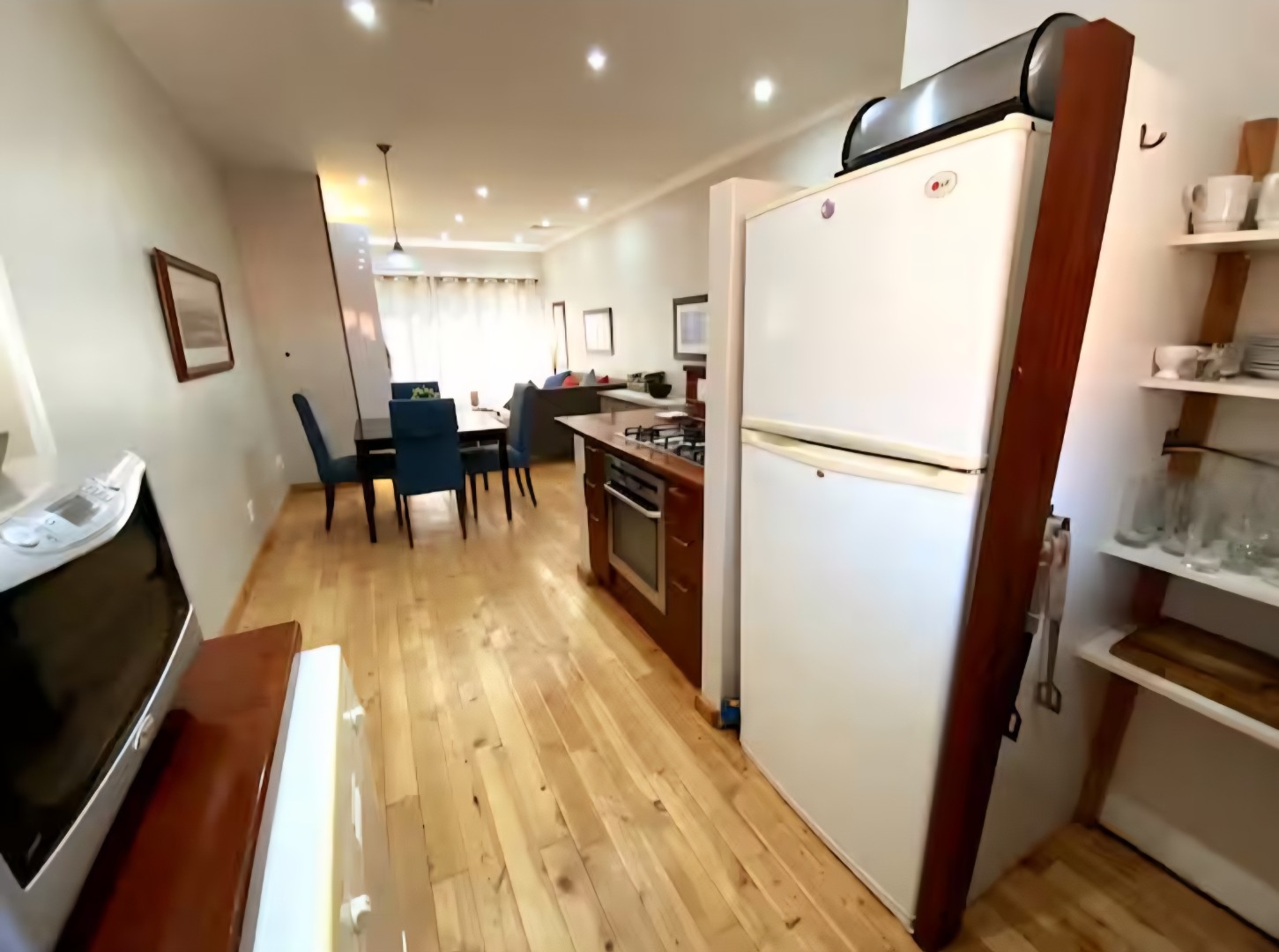 Step into a bright and functional open-concept living space, featuring consistent light wood flooring and neutral walls that create a versatile foundation. The lounge area boasts a sleek, white built-in media center and shelving, providing ample storage and a modern aesthetic. Large sliding glass doors invite abundant natural light and offer access to a private balcony. The integrated dining area flows seamlessly into the compact yet equipped kitchen, which includes a built-in gas stove and oven, along with a refrigerator and microwave. While functional, the kitchen maintains a traditional design with wooden cabinetry and a red tiled backsplash.