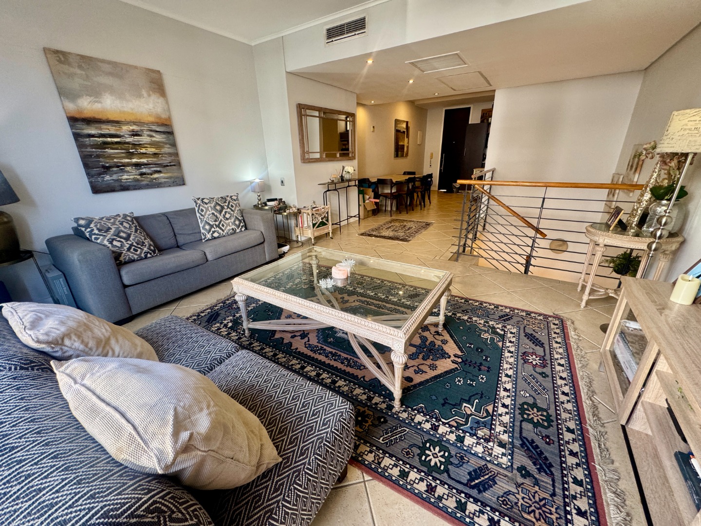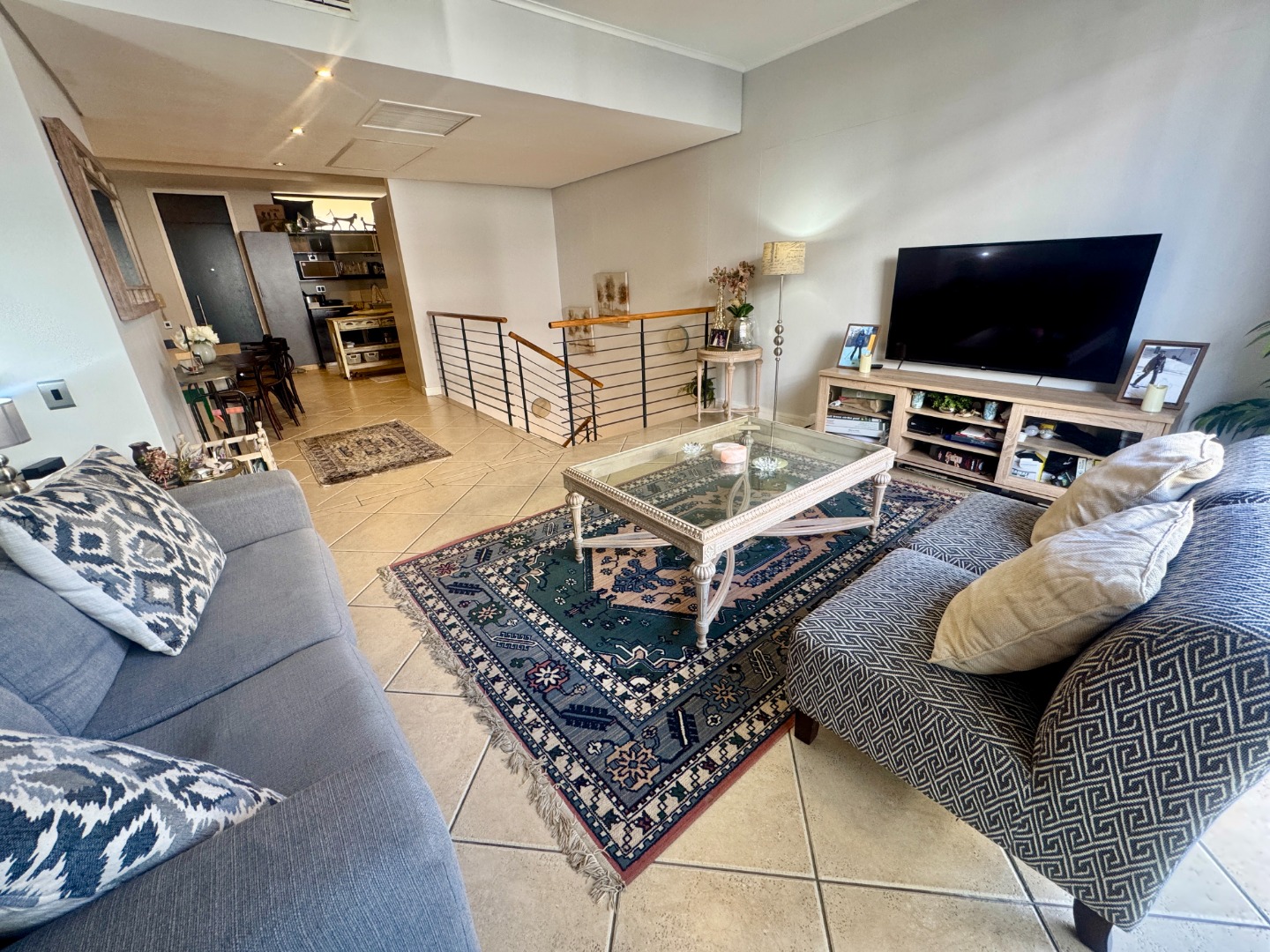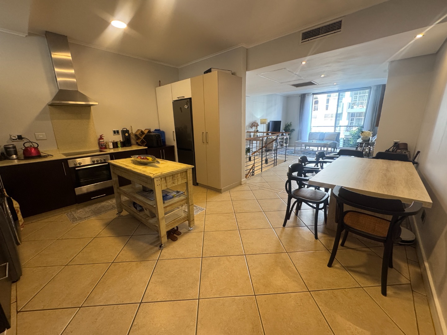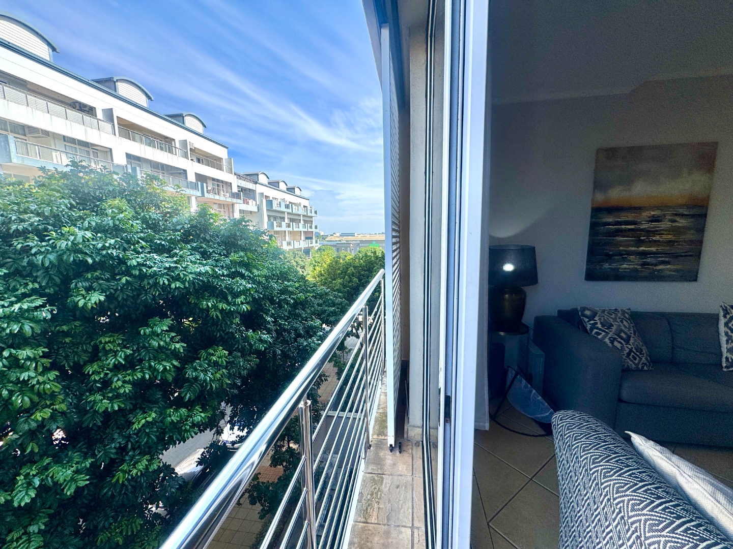 The spacious kitchen, dining and lounge areas spill onto a narrow balcony overlooking lush trees. The light-filled main en-suite bedroom has a dressing room area and flows onto a lovely balcony. The bathroom has a bath and shower. The second bedroom has a bathroom with shower and there is a study area next to the staircase.