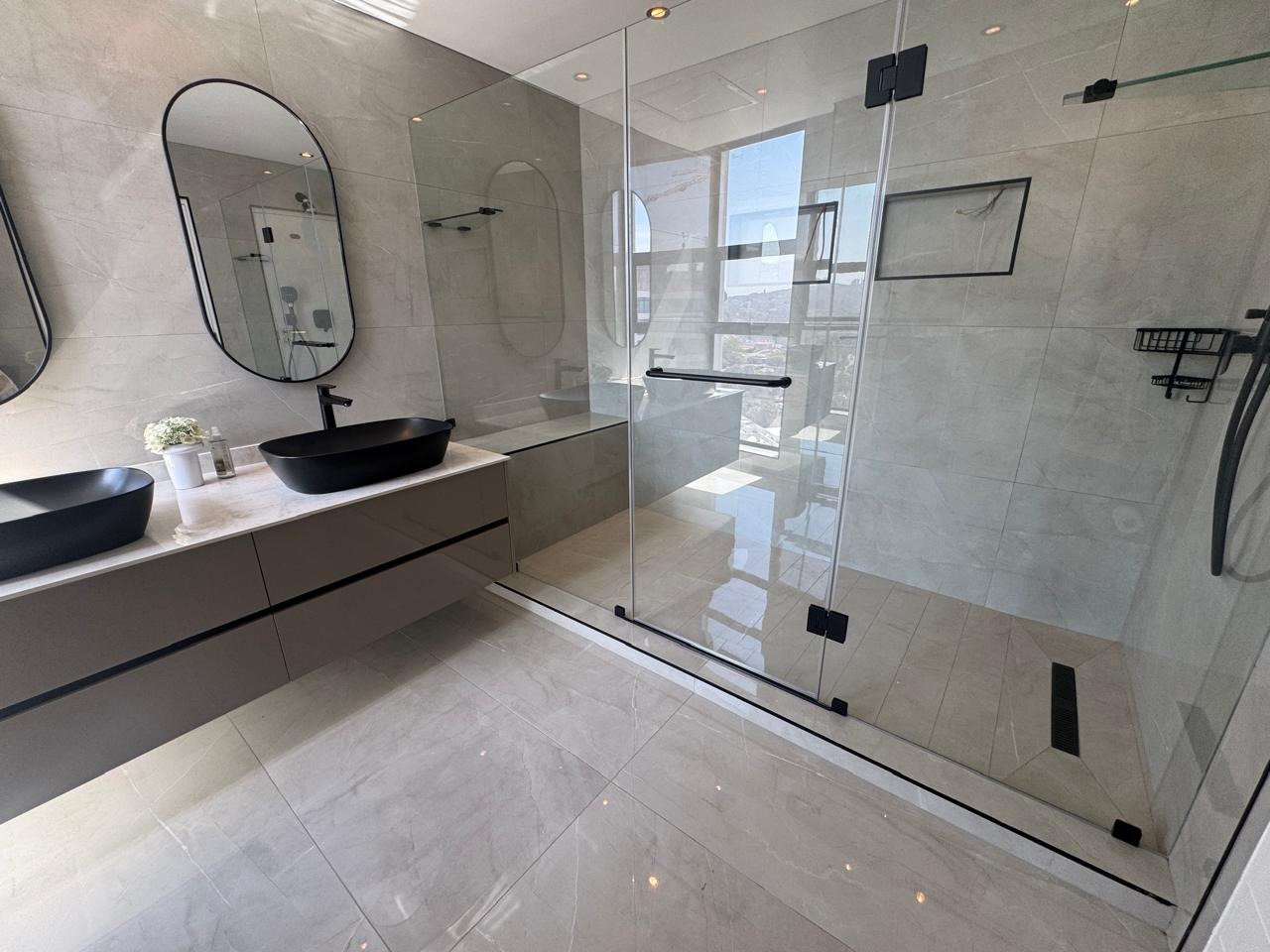 The contemporary, New York feel is offset by breathtaking ocean views and views of the swimming pool. The open plan kitchen, dining room and lounge flow onto the patio with ocean views. The main en-suite bedroom, with sea and inland views, has a dressing room and bathroom with bath and shower and trendy finishes.