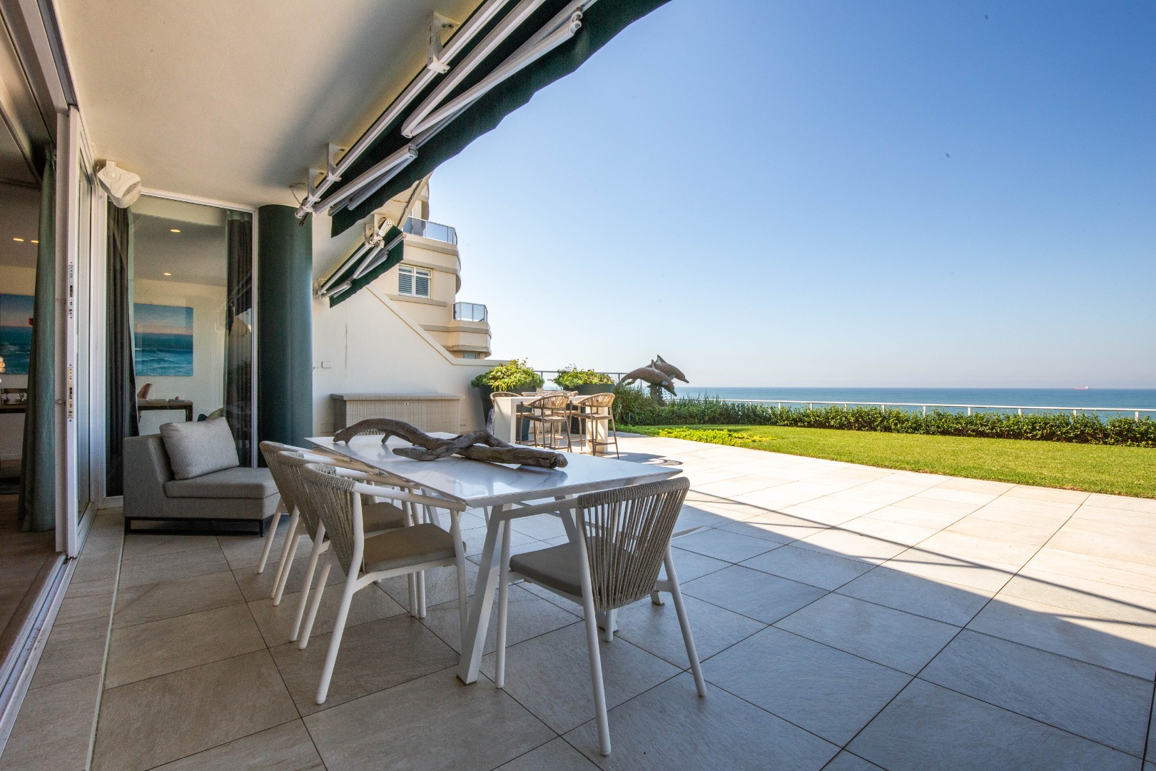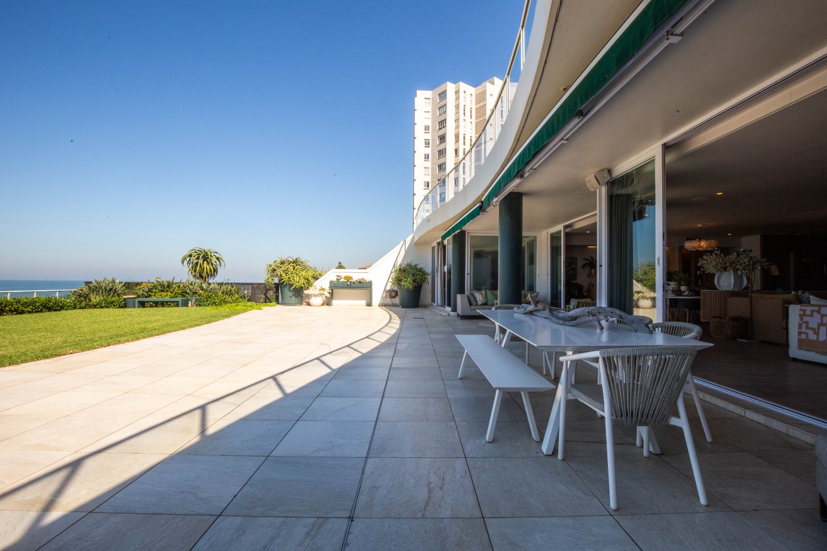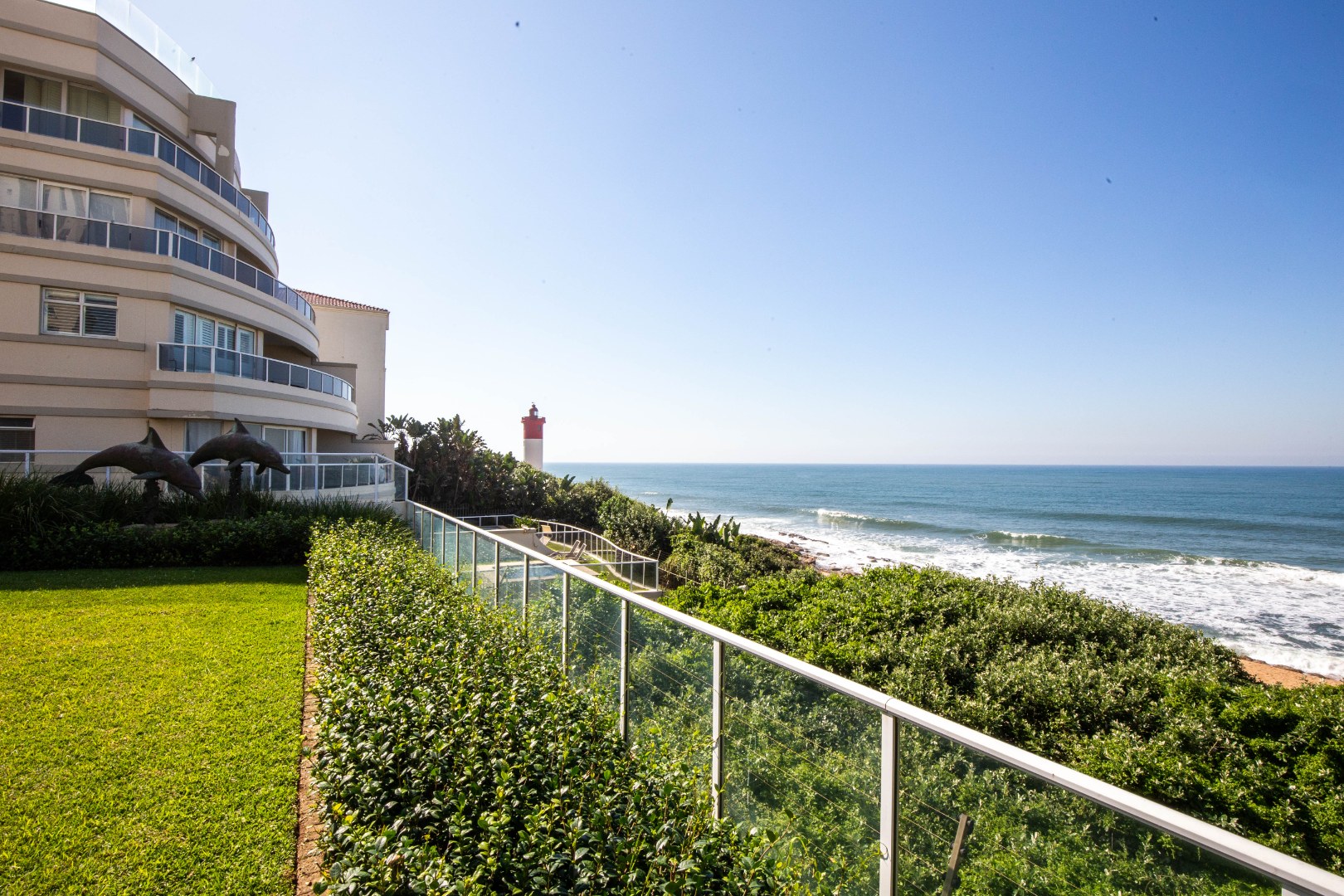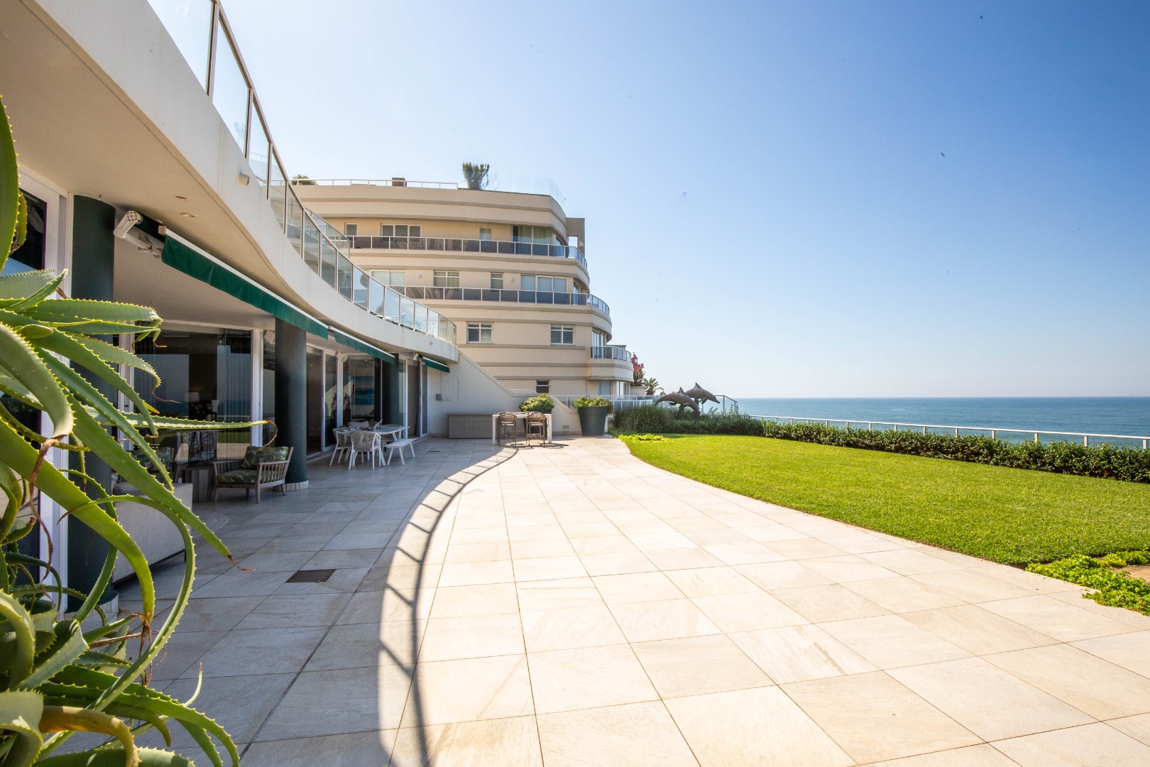 Frontline beach front renovated designer apartment totalling 974m2 – breaker and beach views from the expansive level garden – only a few steps onto Umhlanga’s famous promenade and to Umhlanga’s beaches and the village.