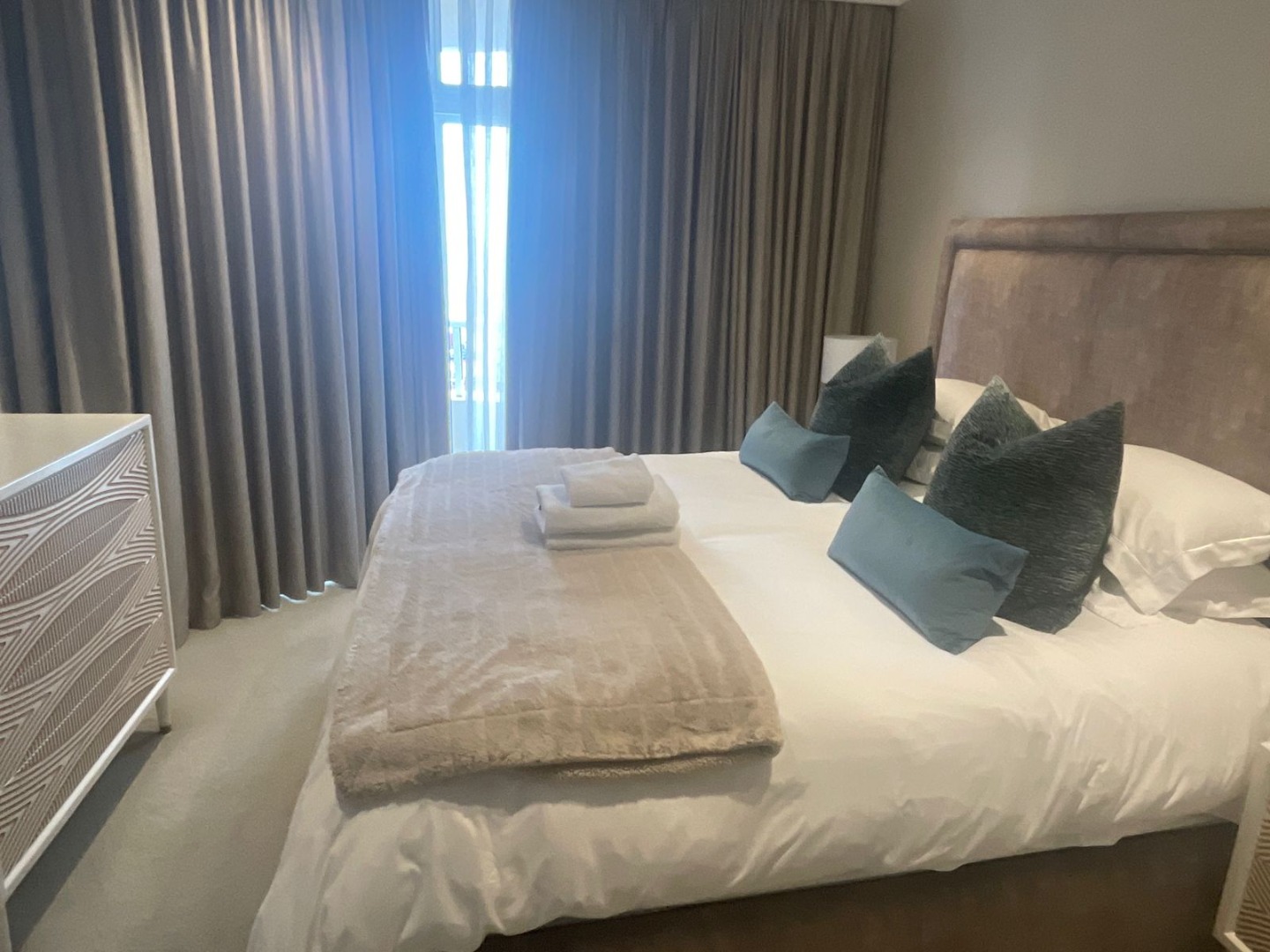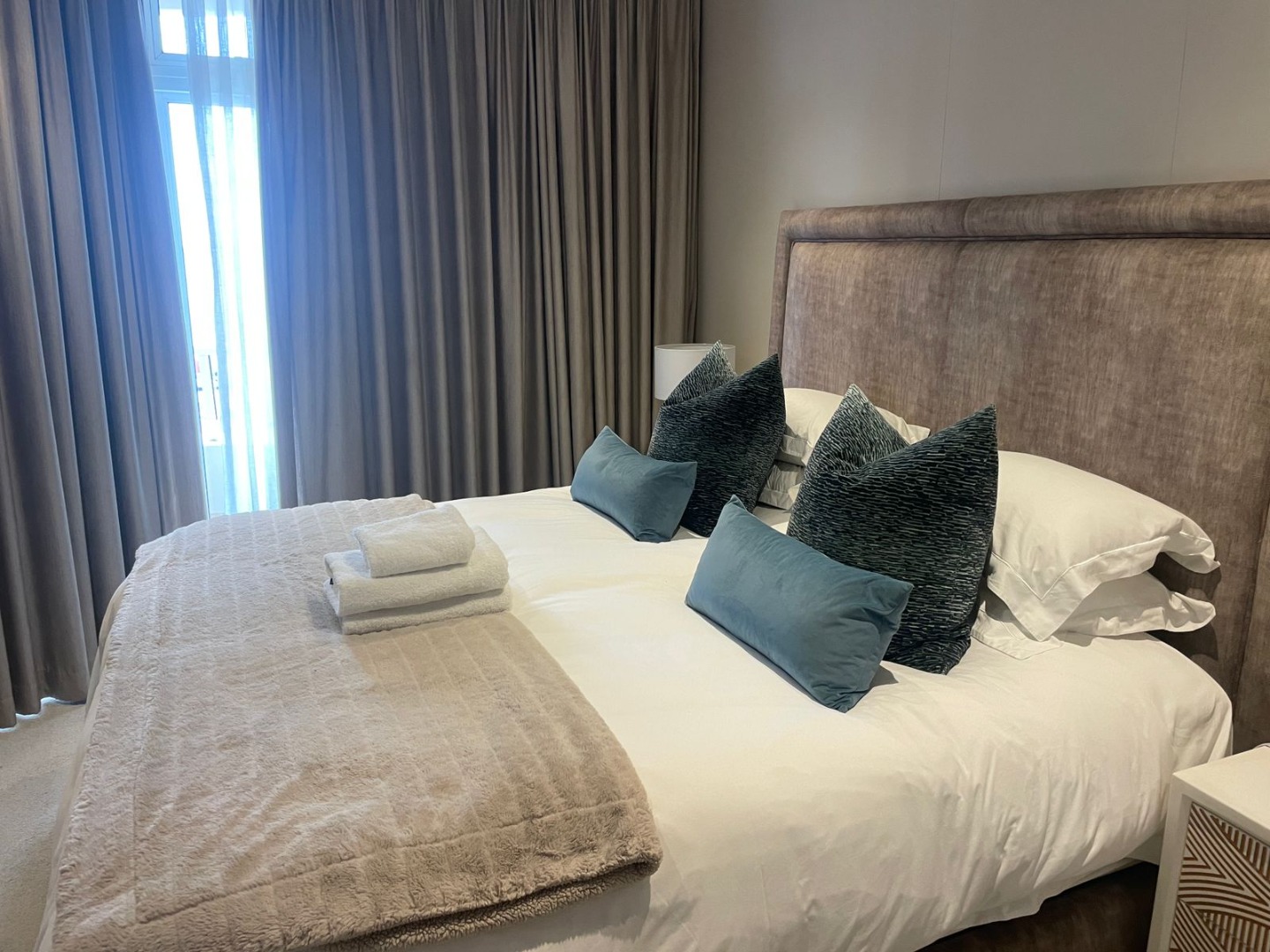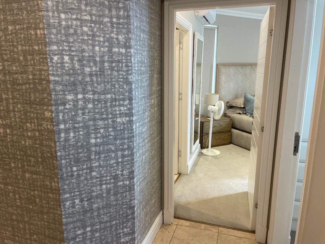 Each of the three bedrooms provides a sanctuary of comfort, featuring plush bedding, stylish upholstered headboards, and a neutral colour palette. One bathroom is en-suite, enhancing privacy. Climate control is efficiently managed with air conditioning units, complemented by ample natural light filtering through large windows. Hallways are adorned with tasteful textured wallpaper, adding a touch of modern elegance throughout the residence.