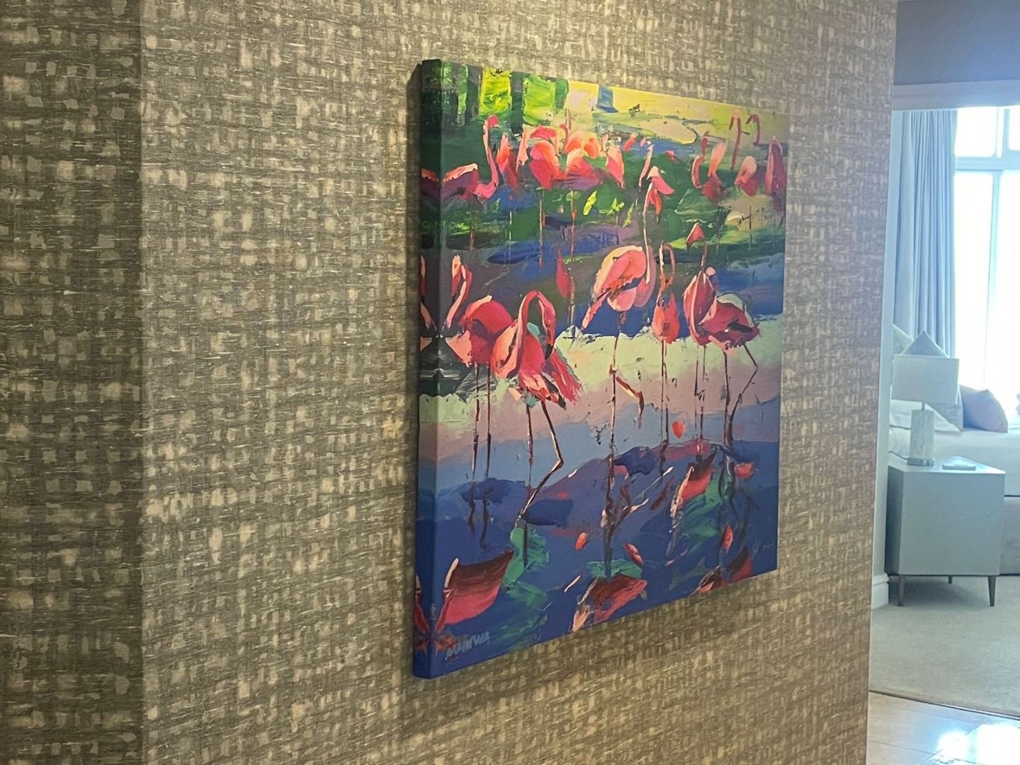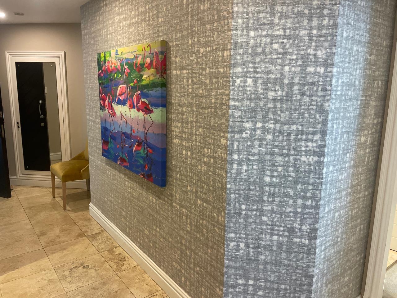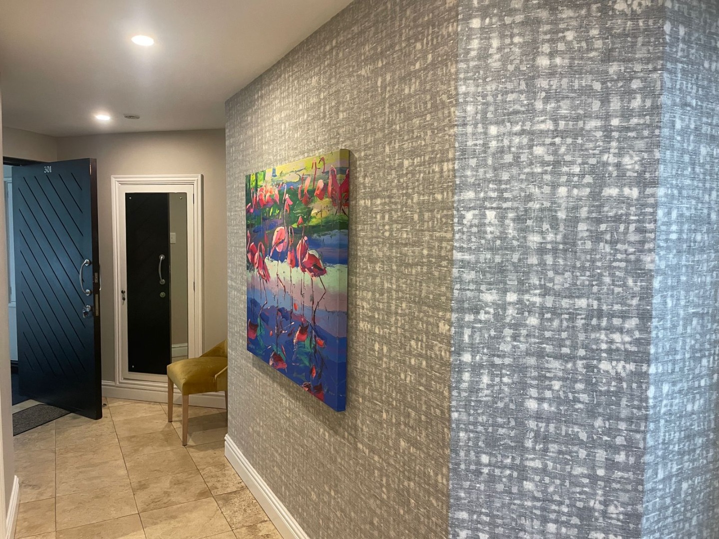 Each of the three bedrooms provides a sanctuary of comfort, featuring plush bedding, stylish upholstered headboards, and a neutral colour palette. One bathroom is en-suite, enhancing privacy. Climate control is efficiently managed with air conditioning units, complemented by ample natural light filtering through large windows. Hallways are adorned with tasteful textured wallpaper, adding a touch of modern elegance throughout the residence.
