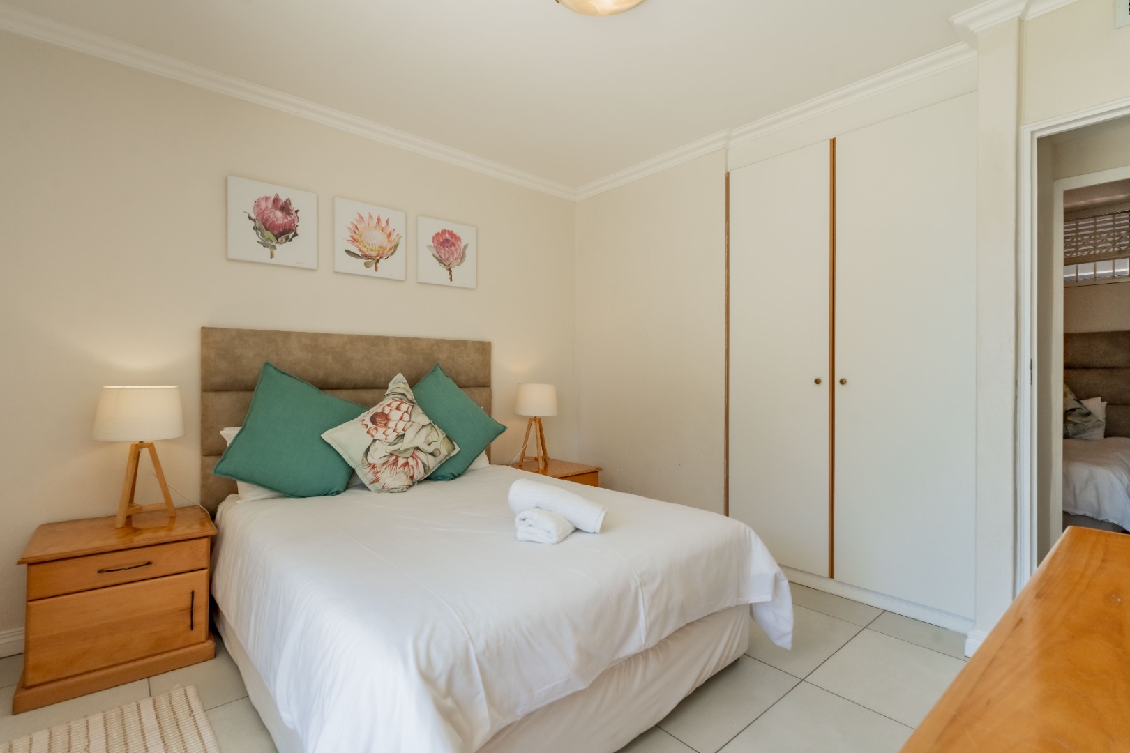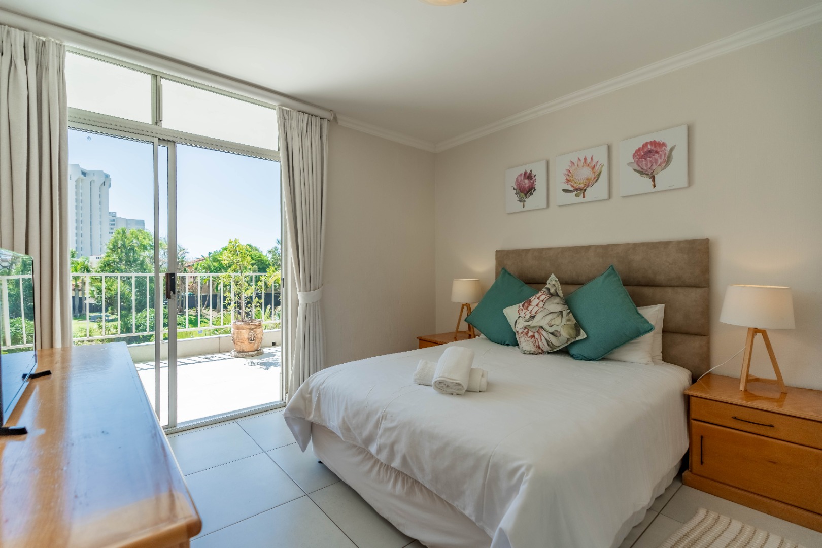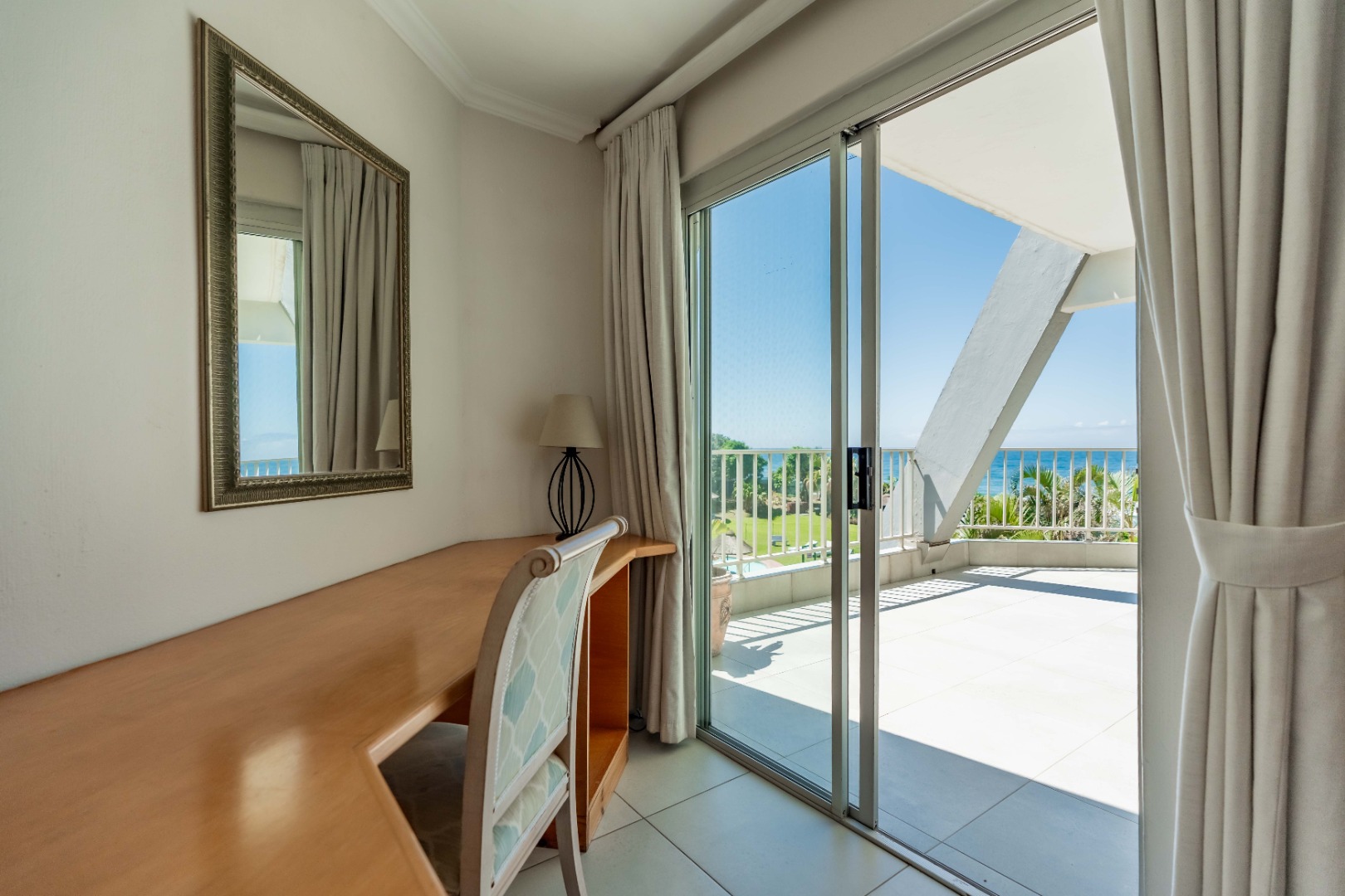 There are three generously sized bedrooms, and two well-appointed bathrooms, including a private en-suite for added comfort and privacy. The master en-suite bedroom, features a study nook and leads out onto the large balcony, which overlooks the lovely communal garden and pool area, plus exquisite ocean views.