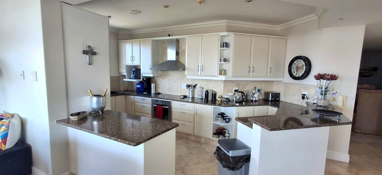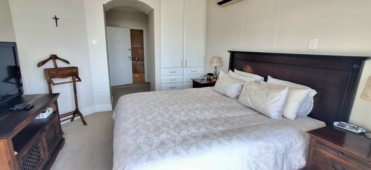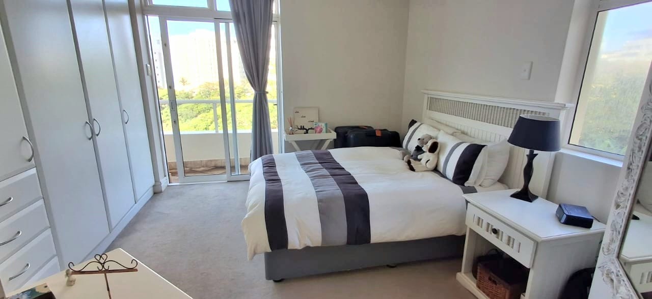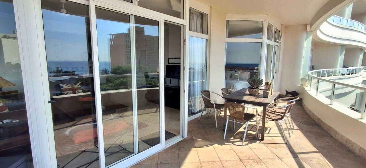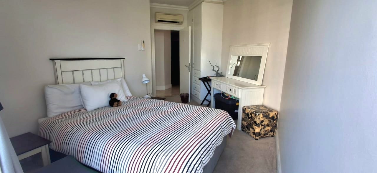 Each of the two main bathrooms is an en-suite, ensuring privacy and convenience, complemented by an additional guest toilet. The apartment boasts air conditioning throughout for year-round comfort. Step out onto the large, curved private balcony, accessible via expansive sliding doors, and immerse yourself in the panoramic sea views that stretch across the horizon. This outdoor space is ideal for enjoying morning coffee or evening sunsets. Residents also benefit from a communal swimming pool and braai area, enhancing the lifestyle offerings within the complex.