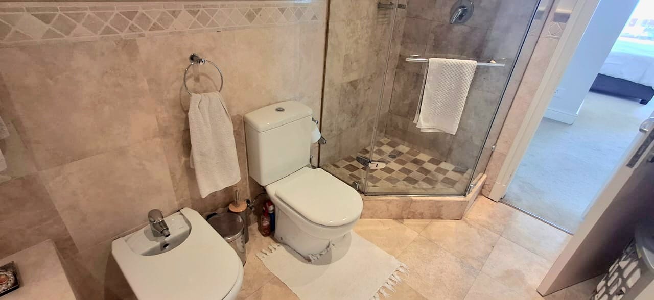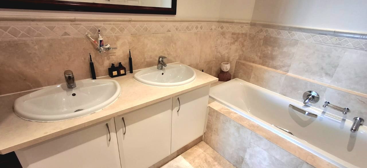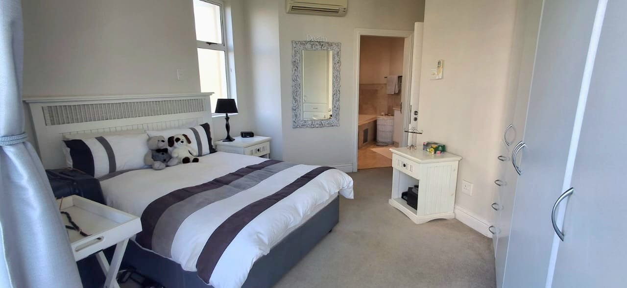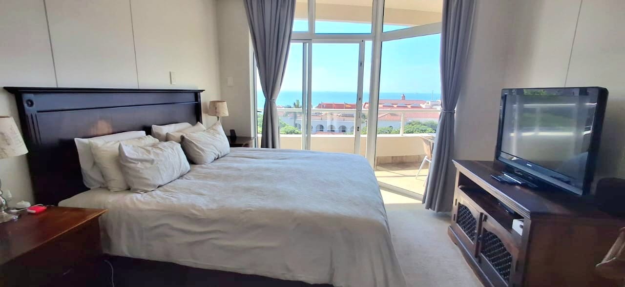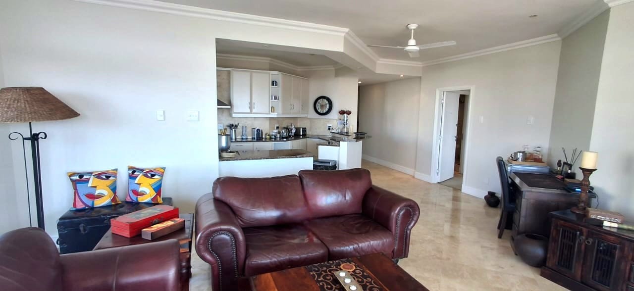 Each of the two main bathrooms is an en-suite, ensuring privacy and convenience, complemented by an additional guest toilet. The apartment boasts air conditioning throughout for year-round comfort. Step out onto the large, curved private balcony, accessible via expansive sliding doors, and immerse yourself in the panoramic sea views that stretch across the horizon. This outdoor space is ideal for enjoying morning coffee or evening sunsets. Residents also benefit from a communal swimming pool and braai area, enhancing the lifestyle offerings within the complex.