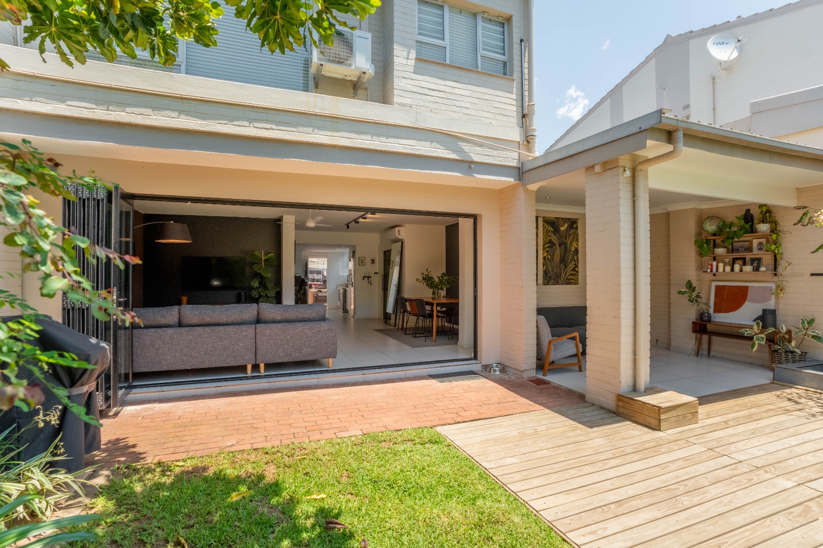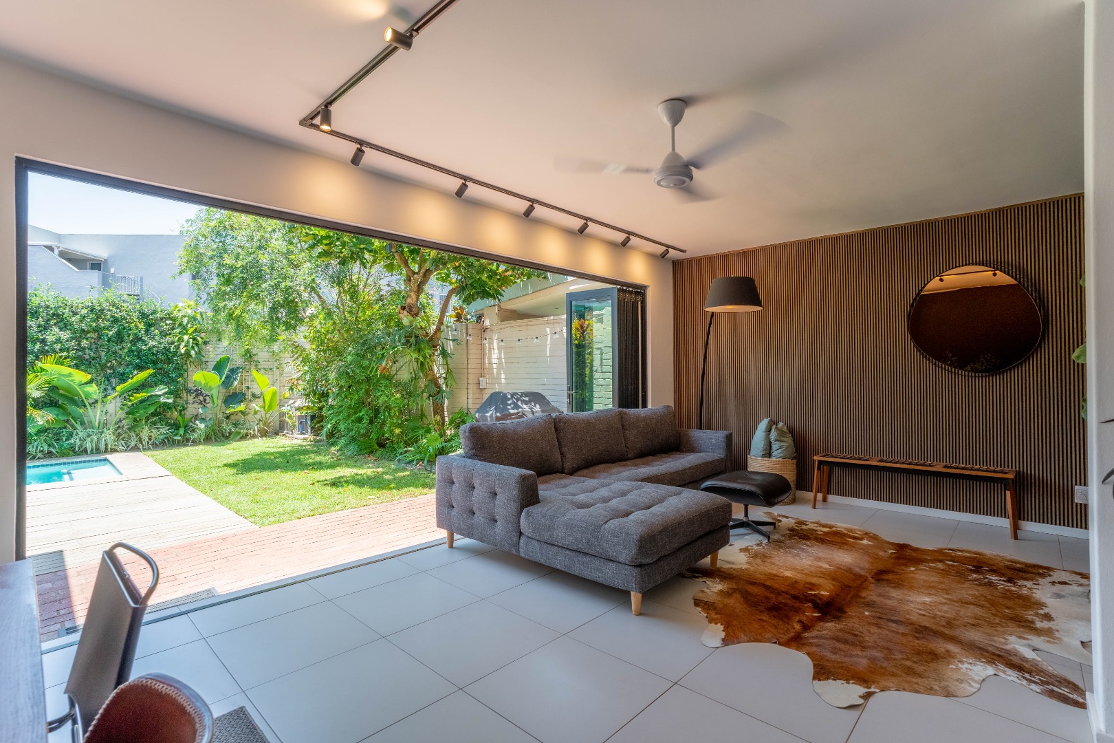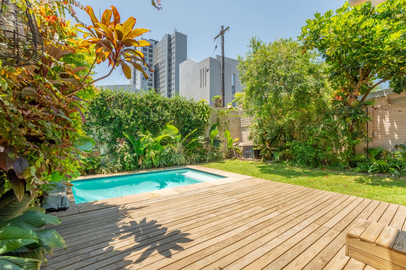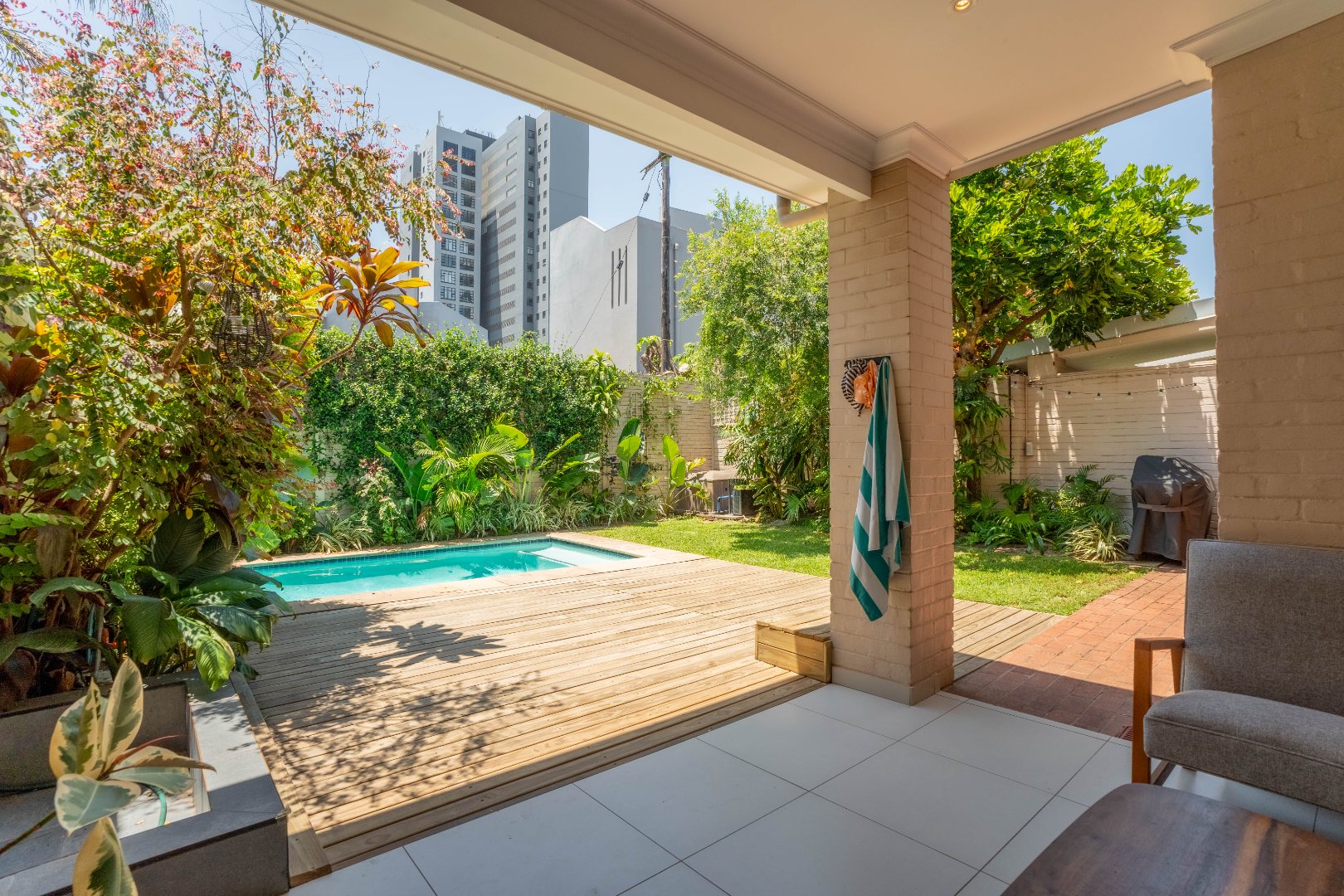 Welcome to this lovely 3-bedroom, 3-bathroom home nestled in a secure complex in Umhlanga Rocks! This place is all about modern living with a super inviting open-plan layout that just feels right. You'll love how the living, dining, and kitchen areas flow seamlessly, making it perfect for chilling out or entertaining friends. The kitchen is sleek with white cabinetry and stainless steel appliances, and the whole space is brightened by cool track lighting and kept comfy with air conditioning. Plus, those big sliding doors really bring the outside in! Upstairs, you'll find three comfy bedrooms and three bathrooms, including a main en-suite, offering plenty of space and privacy for everyone. There's also a handy guest toilet downstairs. The modern design continues throughout, with stylish finishes and thoughtful touches like a unique slatted accent wall in the living area, adding a bit of character to your everyday space. Step outside and discover your own private oasis! The large sliding doors open up to a fantastic covered patio, perfect for enjoying your morning coffee or evening sundowners. Beyond that, you'll find a sparkling private swimming pool and a lush, tropical garden – ideal for soaking up the South African sunshine. With an irrigation and sprinkler system, keeping your garden looking great is a breeze. Pets are welcome too, so your furry friends can enjoy the garden life! Living here means peace of mind, thanks to the security complex with an access gate, alarm system, and intercom. You've also got burglar bars for extra safety. With 133 sqm of floor space, there's plenty of room to make this house your home. Plus, there's some extra storage space, which is always a bonus! Umhlanga Rocks is a fantastic suburban spot, known for its vibrant lifestyle and beautiful coastline. It’s a great place to live, offering a mix of convenience and relaxation. Key Features: * 3 Bedrooms, 3 Bathrooms (1 en-suite) * Modern Open-Plan Living * Private Swimming Pool & Garden * Covered Outdoor Patio * Air Conditioning & Track Lighting * Secure Complex with Alarm & Access Gate * Pet-Friendly * 133 sqm Floor Size * Irrigation & Sprinkler System * Guest Toilet & Storage