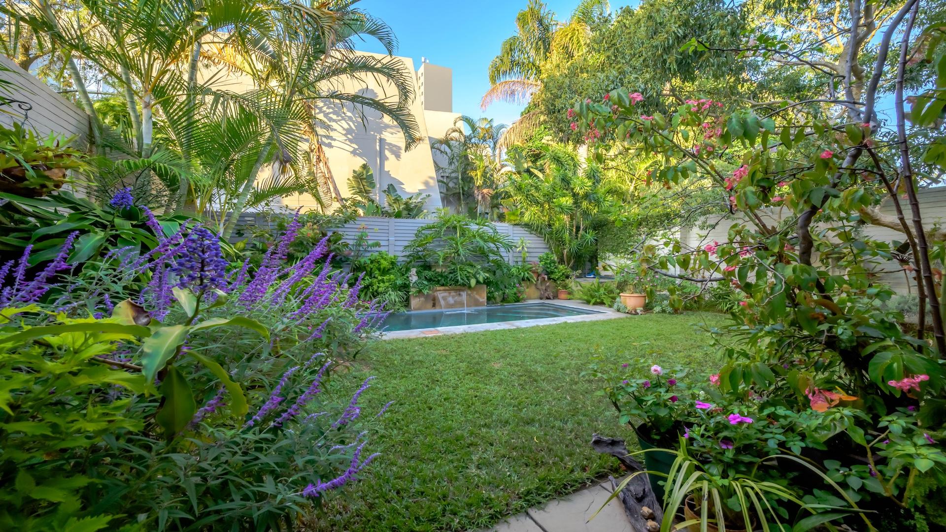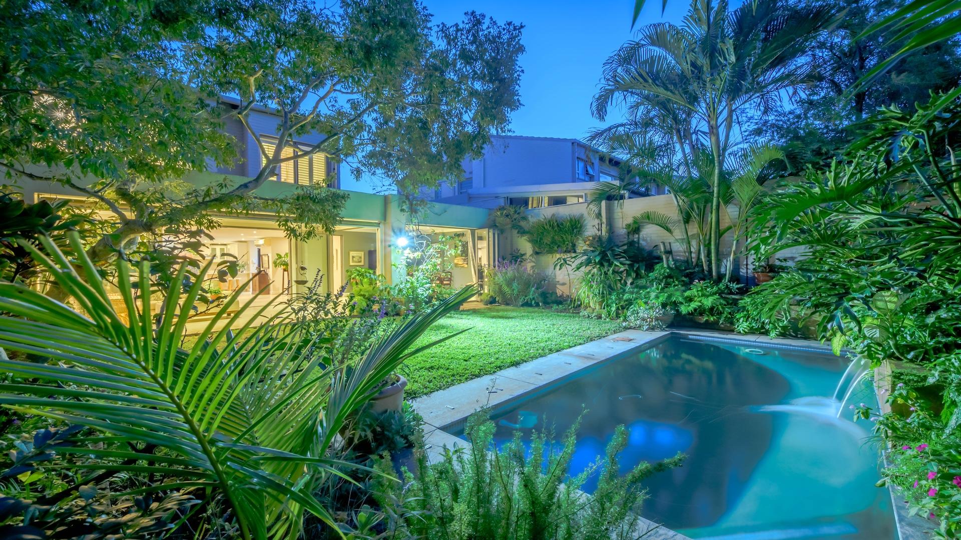 Outdoors, a lush, manicured garden and private pool are enclosed for complete seclusion, offering a serene escape. The property is pet-friendly for