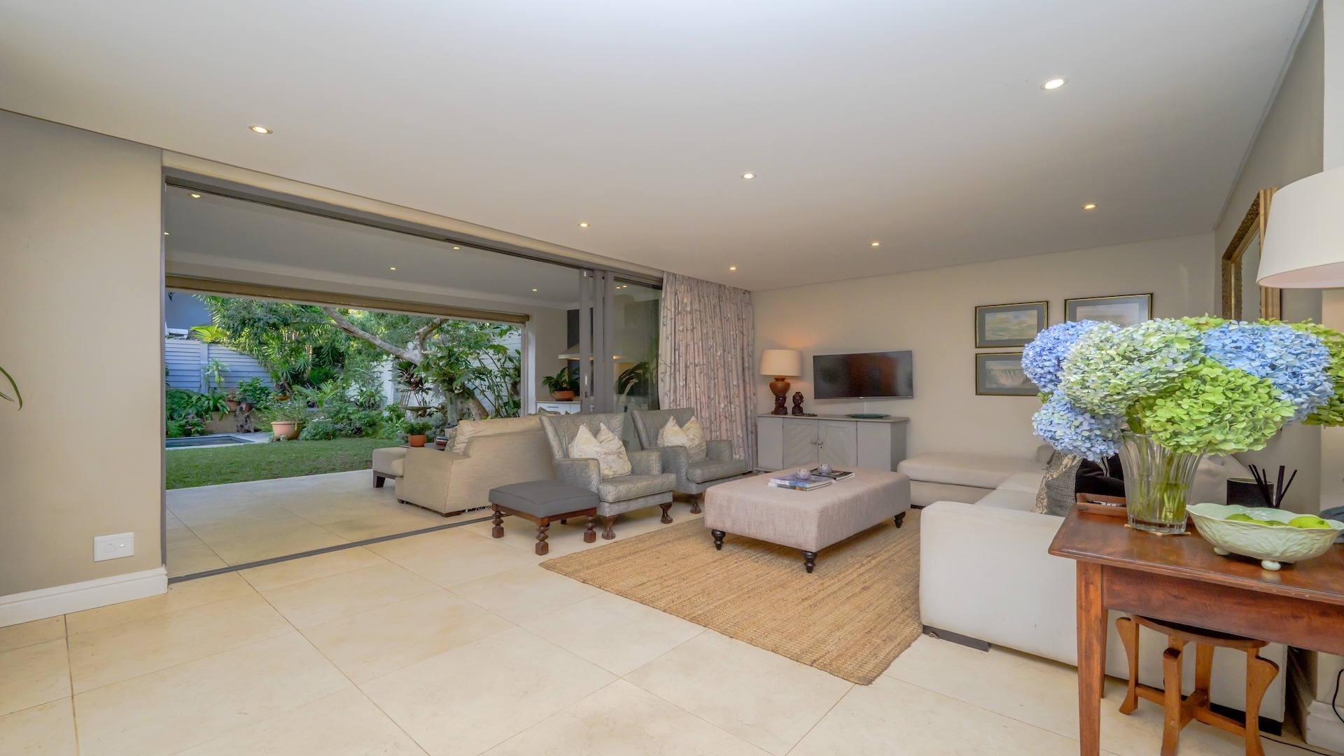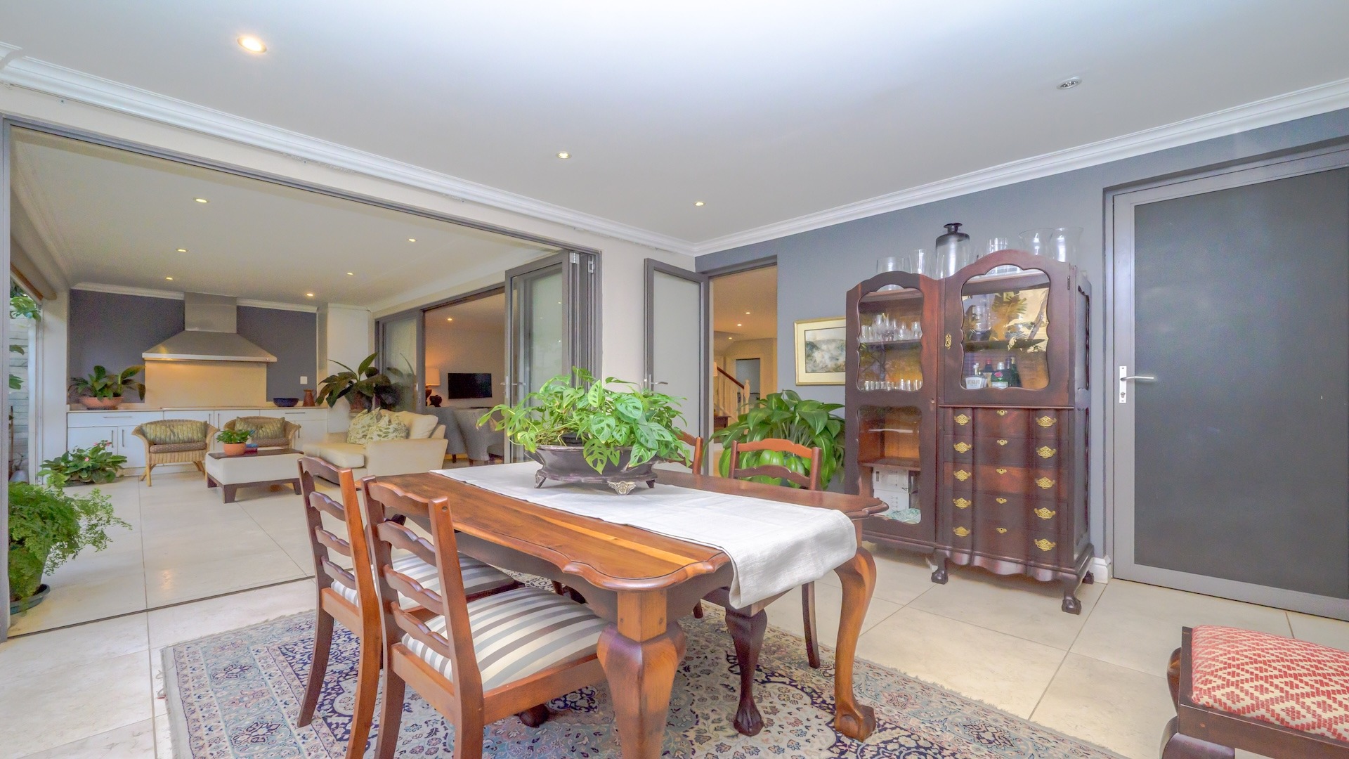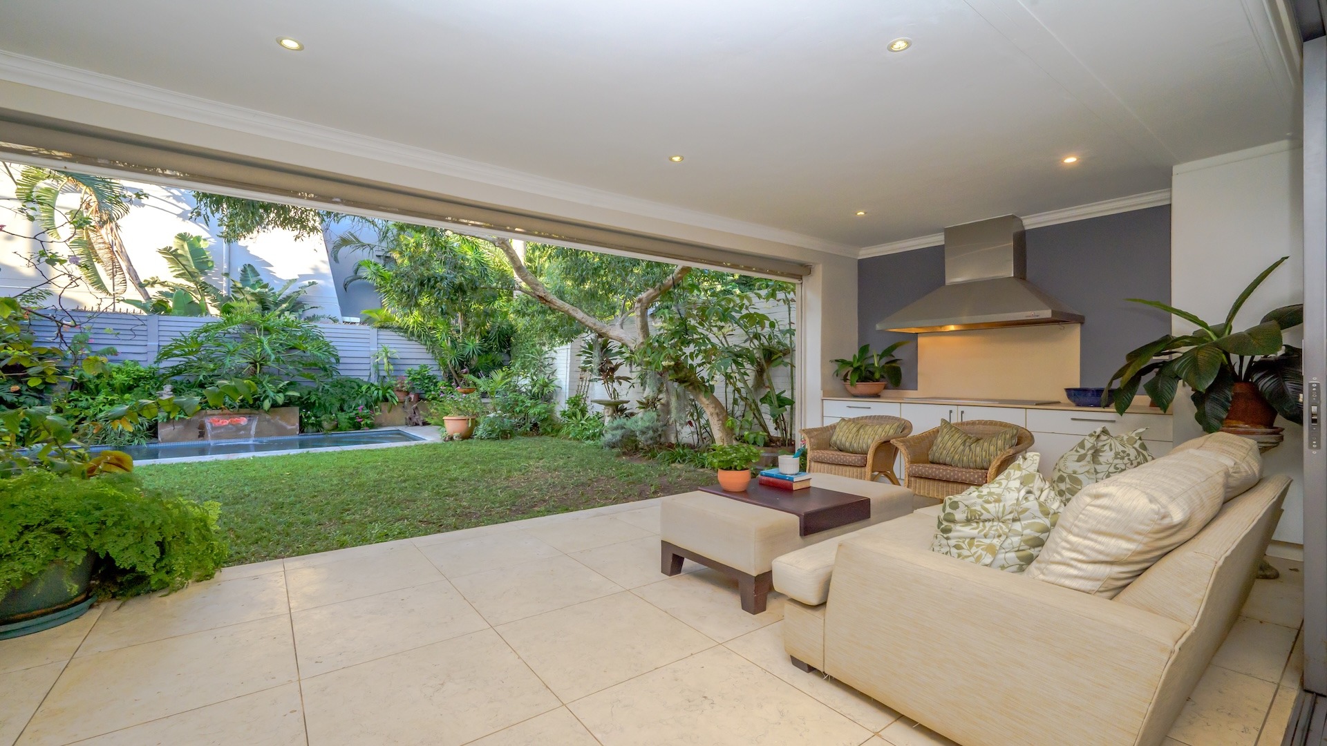 Stack-back doors connect the interiors to a spacious covered patio, ideal for elevated entertaining. Here, a built-in gas braai and weather-protected drop-down blinds create a year-round alfresco setting, perfect for hosting in style.