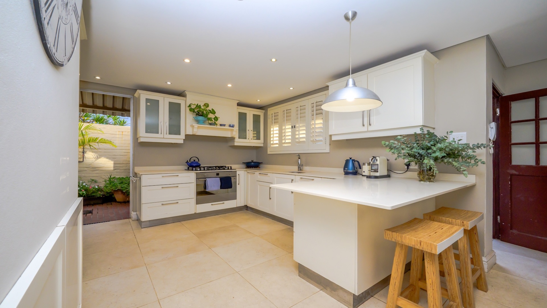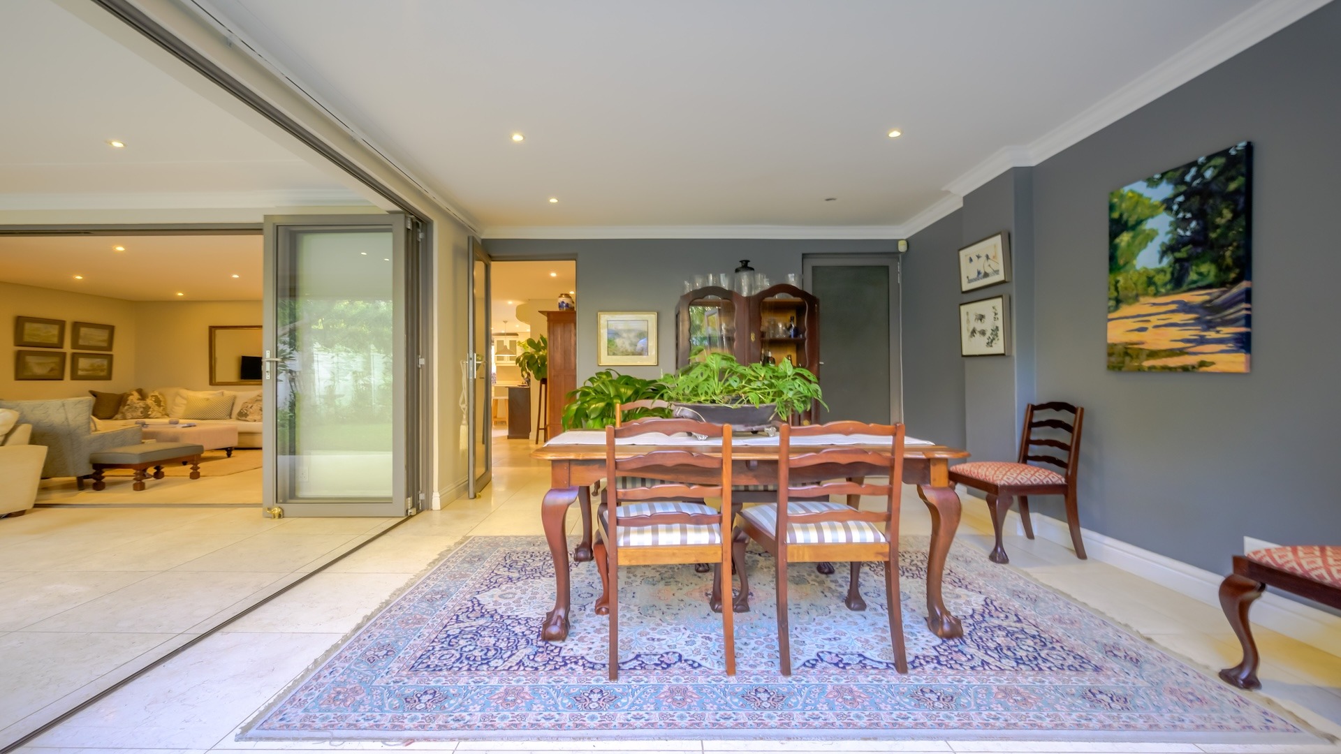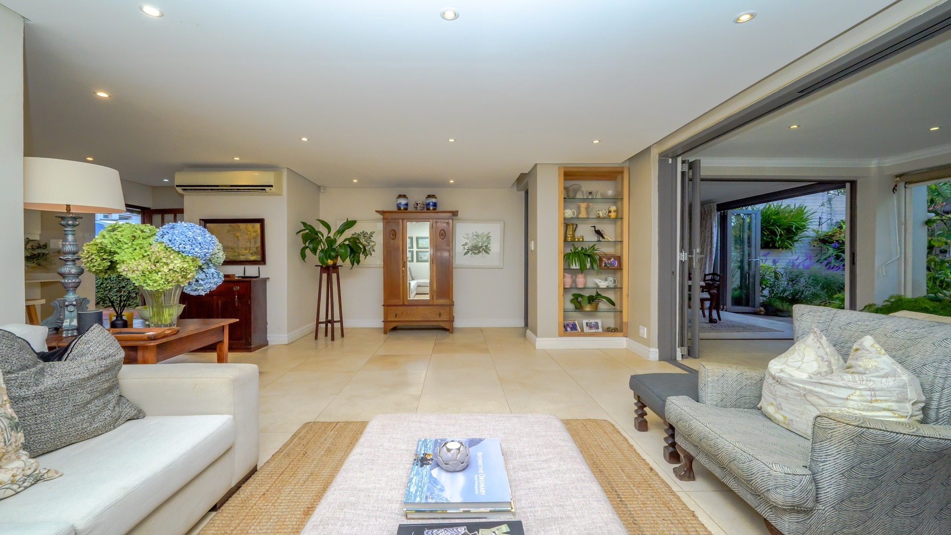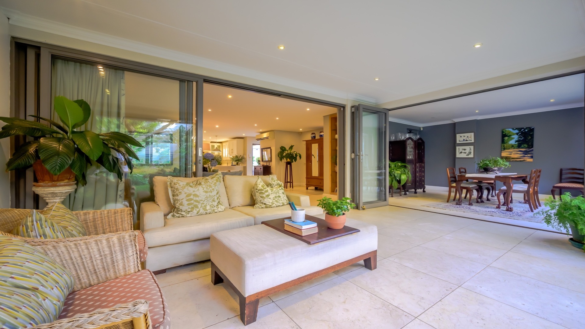 Stack-back doors connect the interiors to a spacious covered patio, ideal for elevated entertaining. Here, a built-in gas braai and weather-protected drop-down blinds create a year-round alfresco setting, perfect for hosting in style.