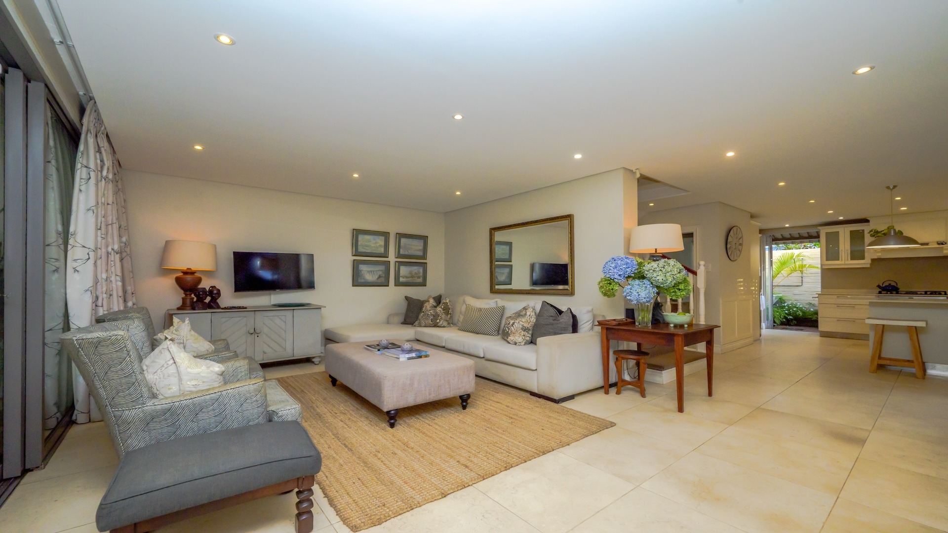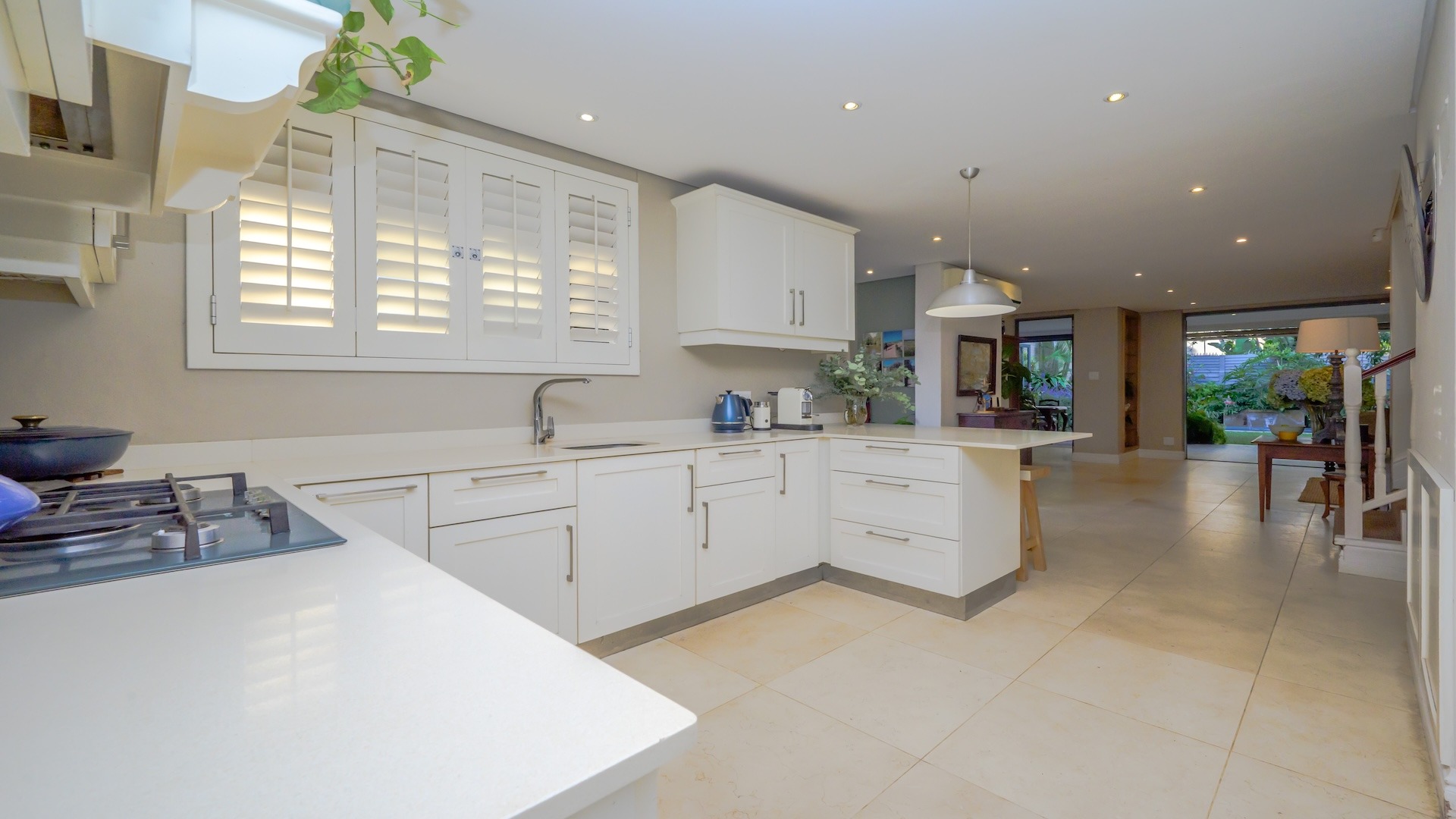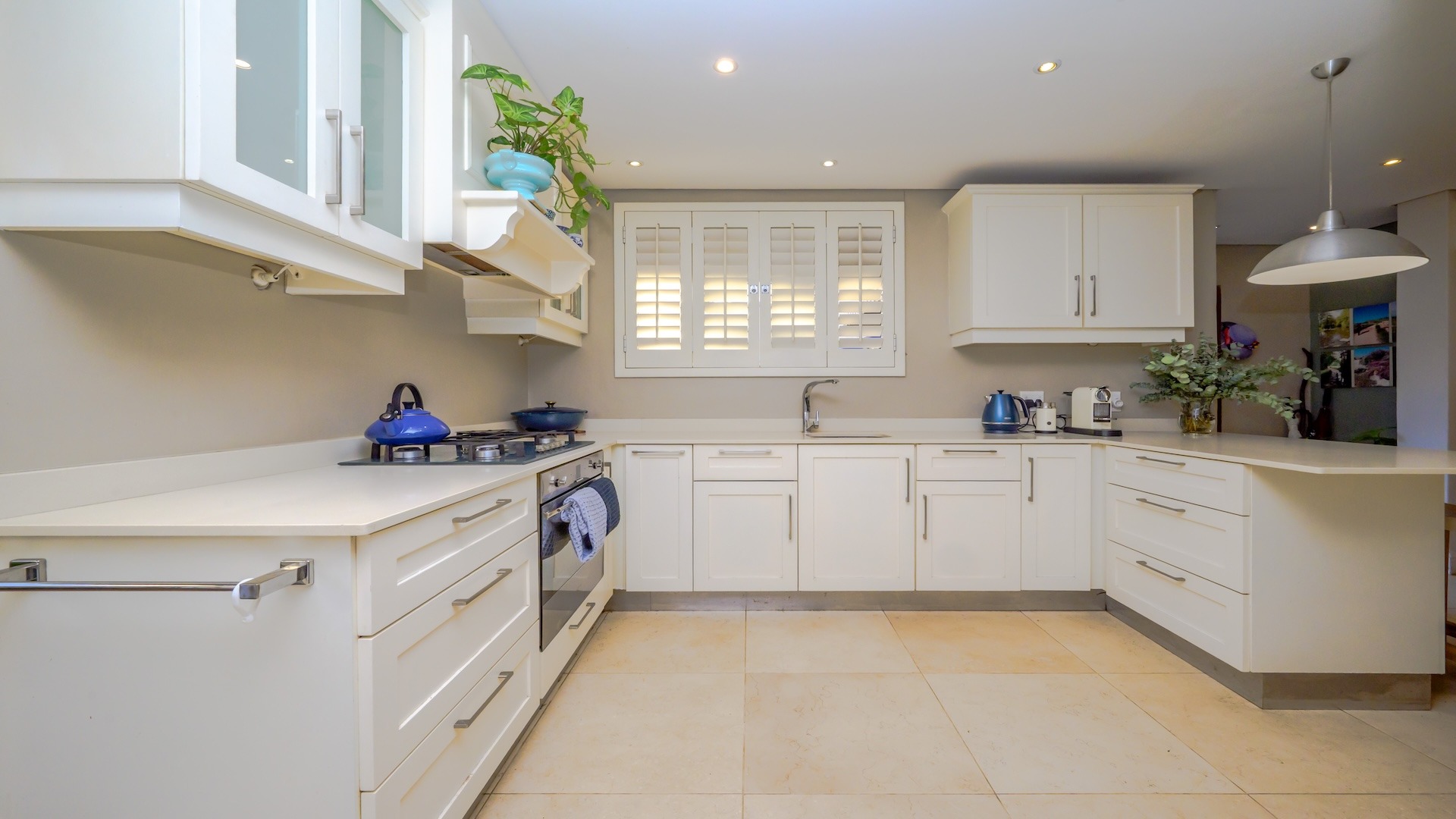 additional appliances, complemented by a gas hob. Striking Egyptian limestone tiles flow seamlessly into the expansive living areas, creating a sophisticated yet inviting atmosphere. The layout is both generous and versatile, allowing for multiple lounging and dining configurations to suit your lifestyle.