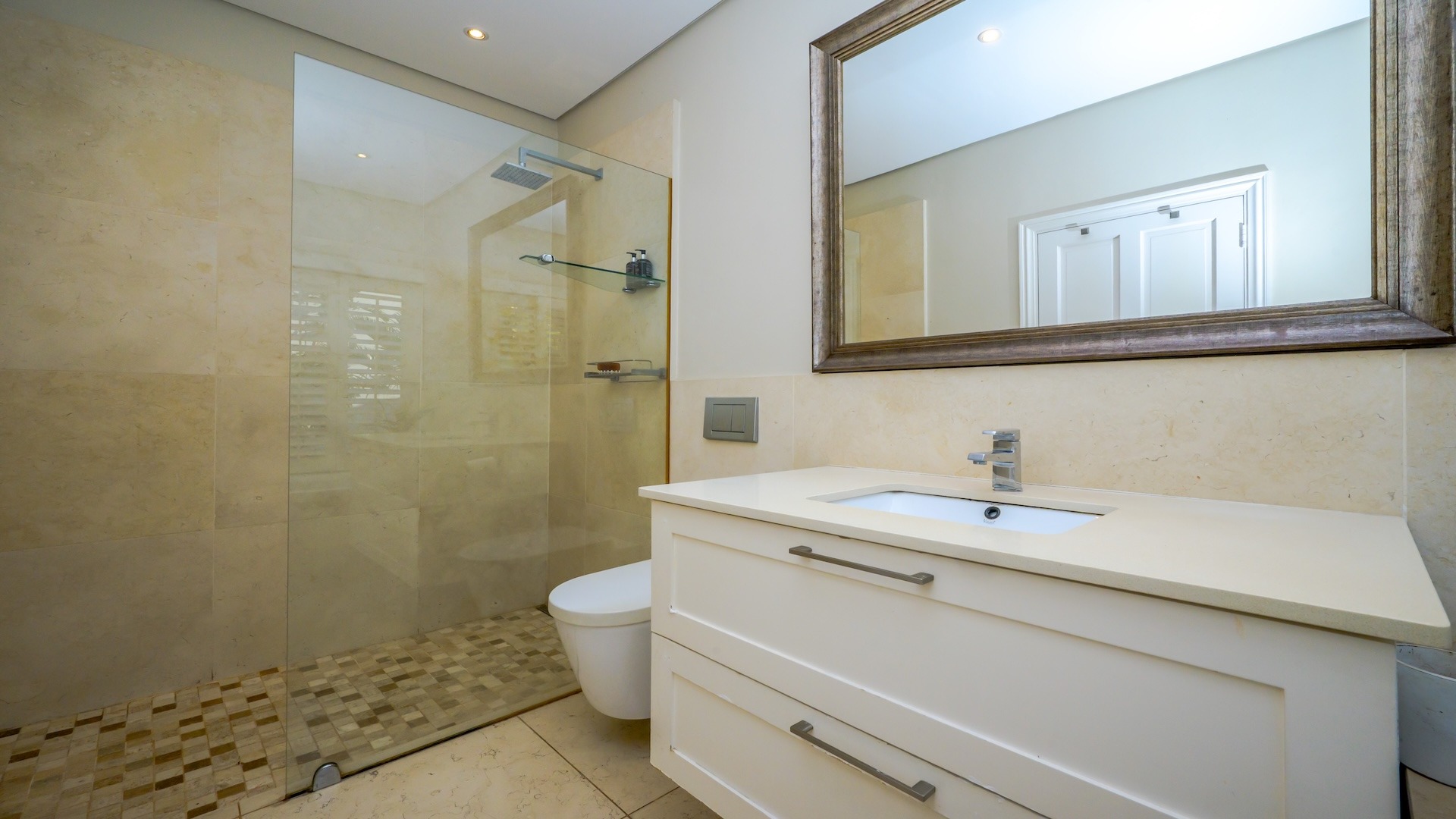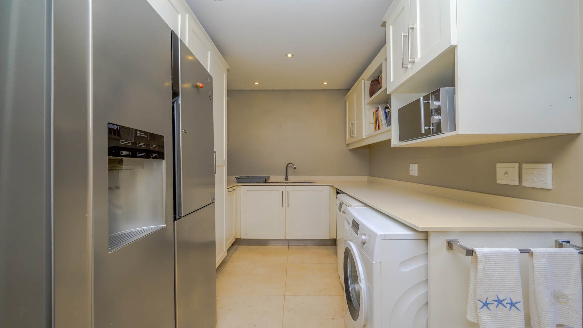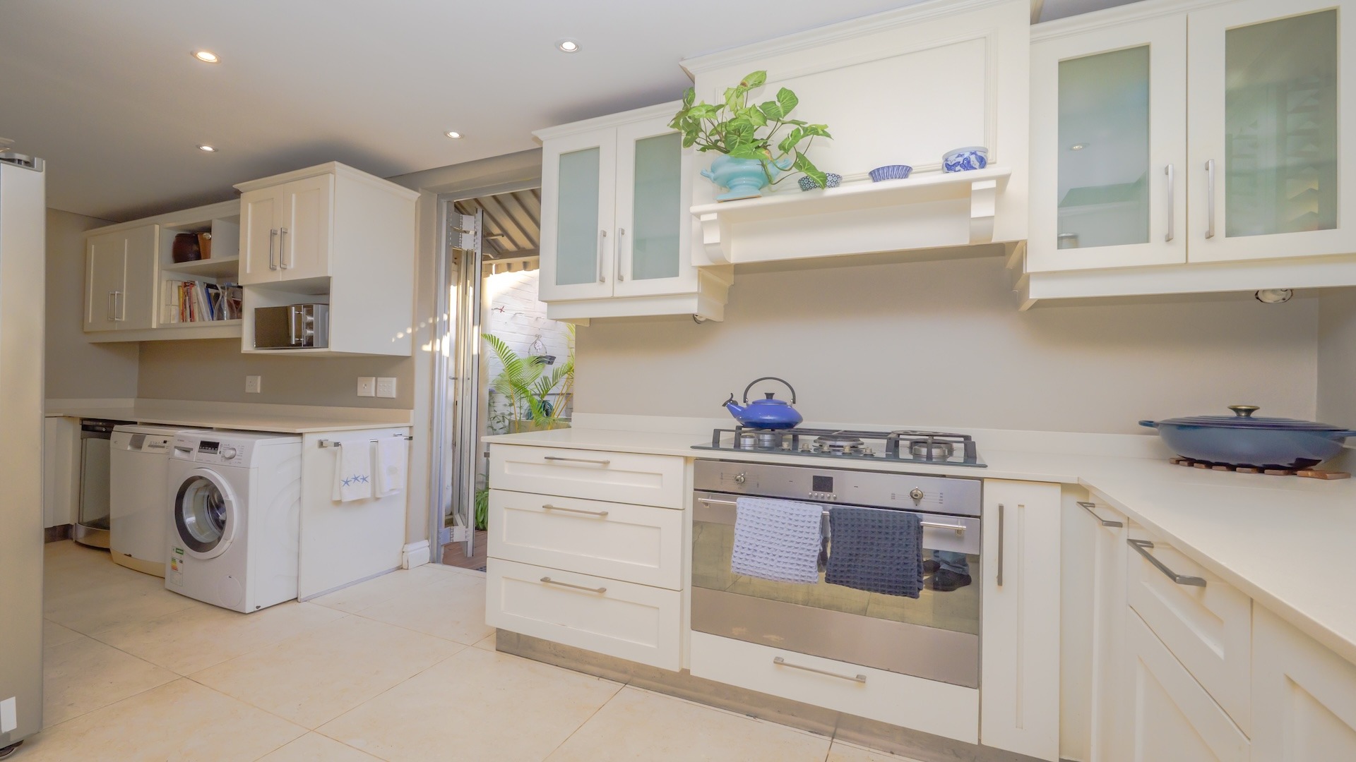additional appliances, complemented by a gas hob. Striking Egyptian limestone tiles flow seamlessly into the expansive living areas, creating a sophisticated yet inviting atmosphere. The layout is both generous and versatile, allowing for multiple lounging and dining configurations to suit your lifestyle.