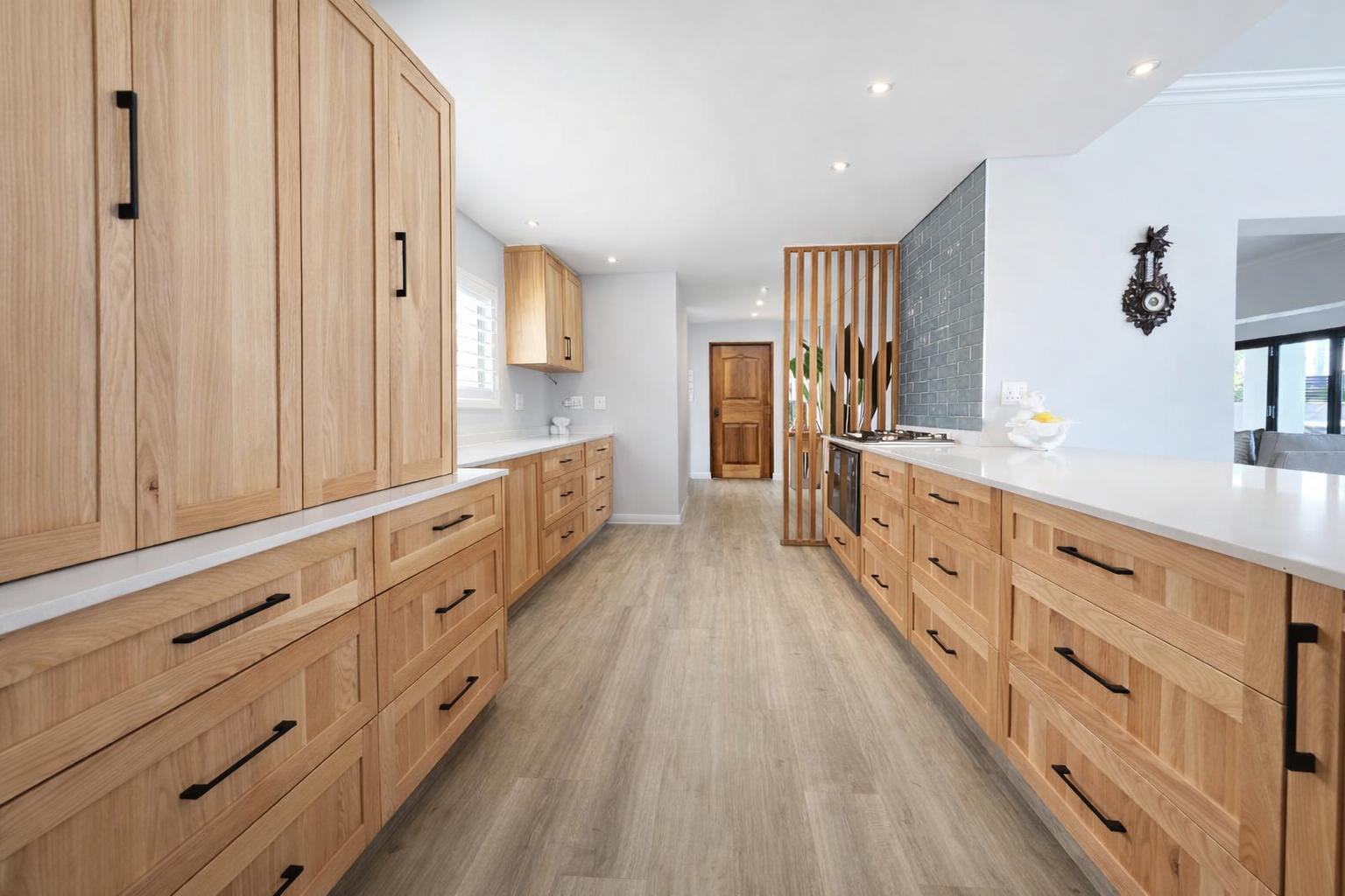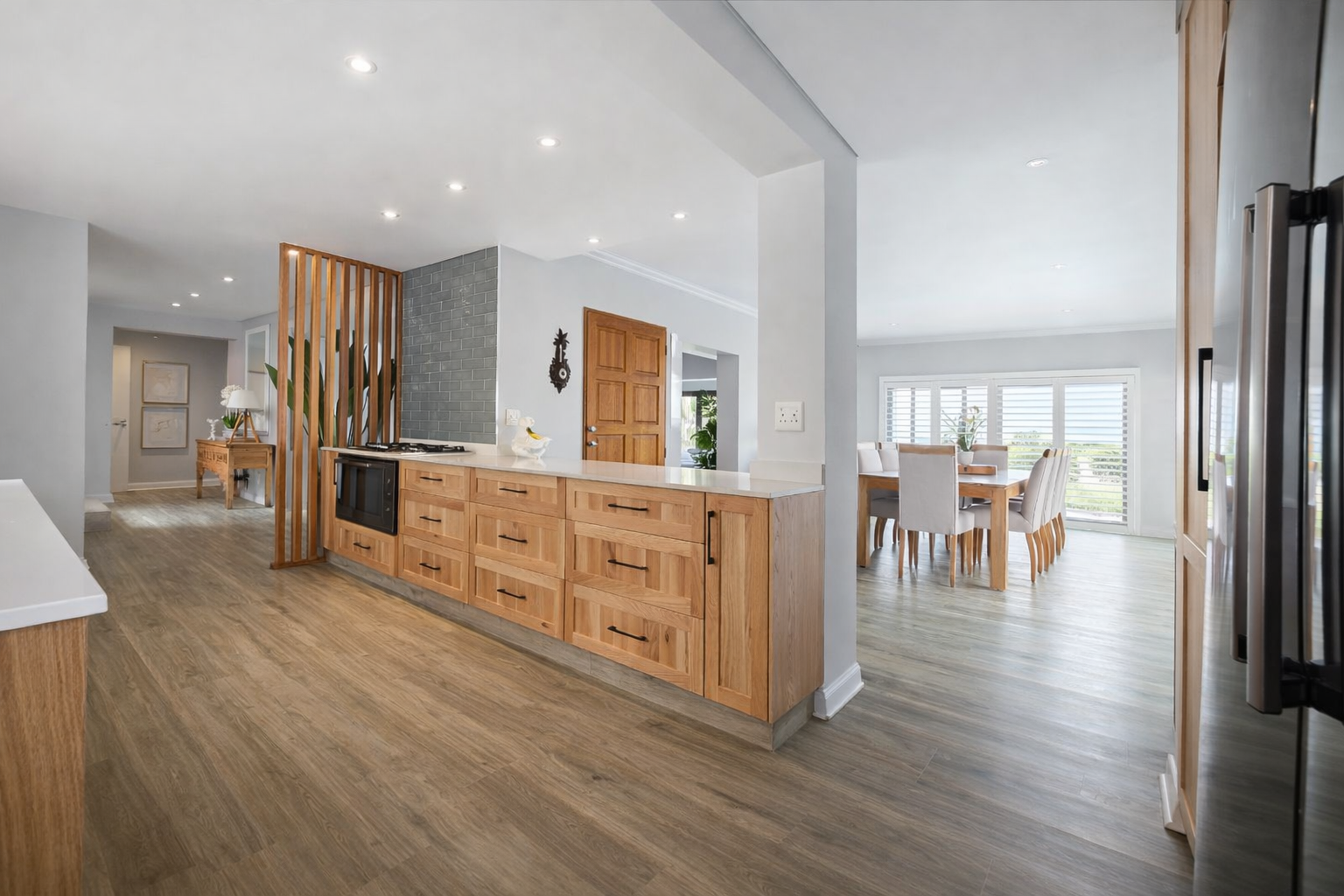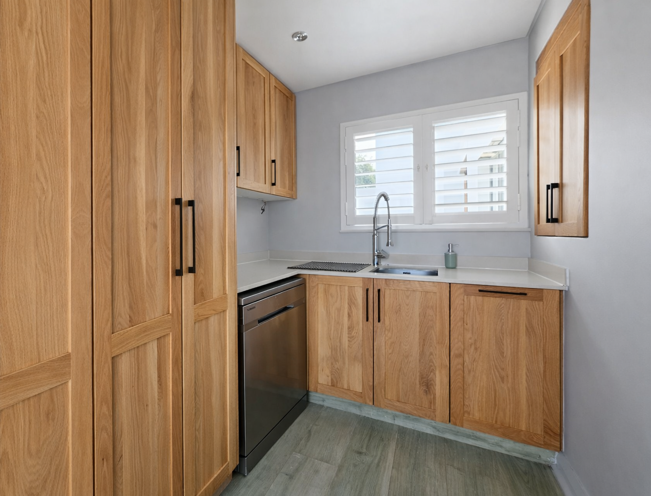 At the heart of the residence lies a beautifully appointed, open-plan bespoke kitchen, complete with refined wooden cabinetry, sleek surfaces, and a considered layout. A separate scullery and laundry ensure seamless functionality, preserving the clean, uncluttered presentation of the main kitchen space.