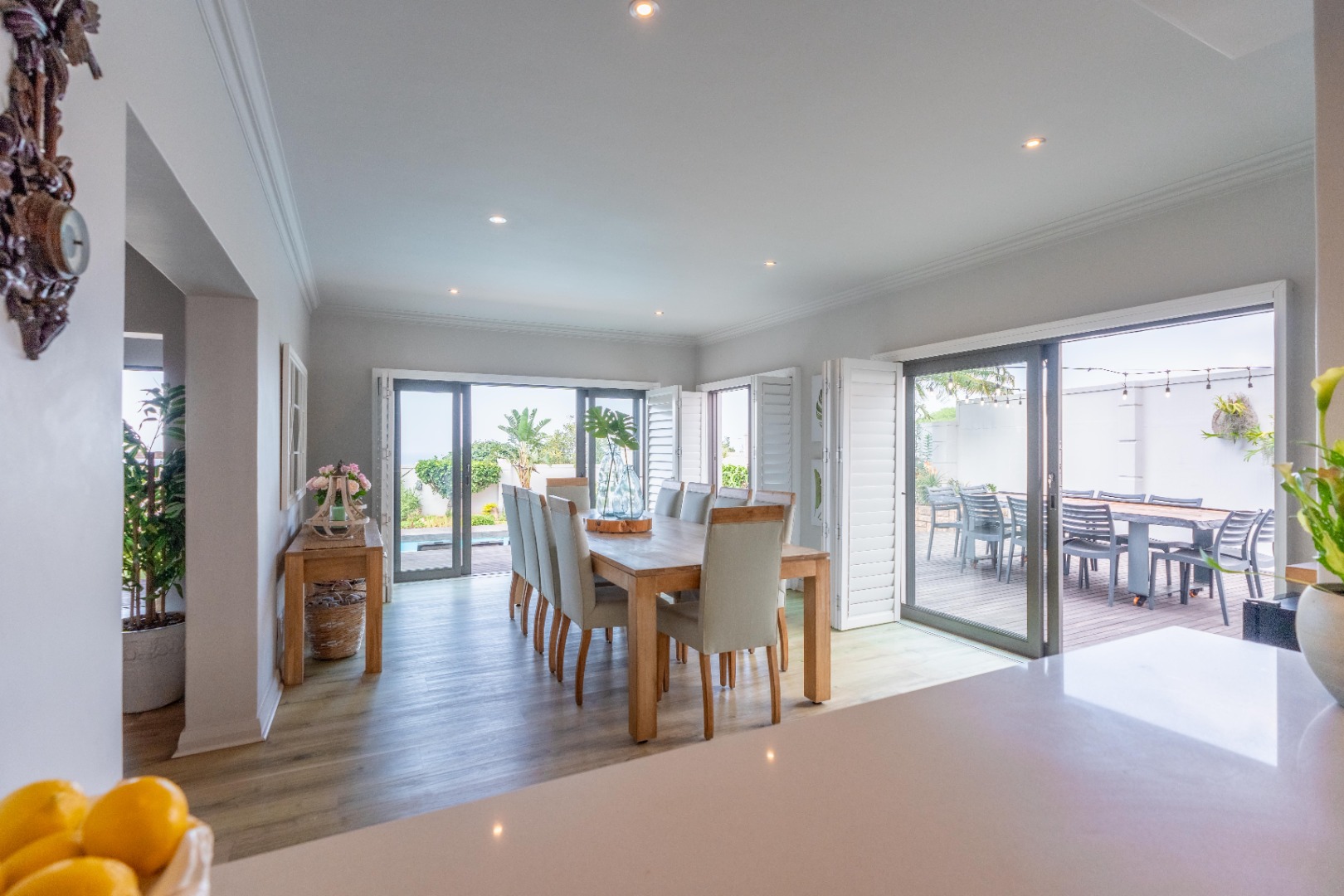 The open plan reception areas unfold with a seamless connection to the outdoors, framed by expansive glazing that invites in natural light and enhances the home’s biophilic integration. Captivating views stretch across the manicured garden, sparkling pool, and out toward the ocean horizon, creating a serene and elevated ambiance.