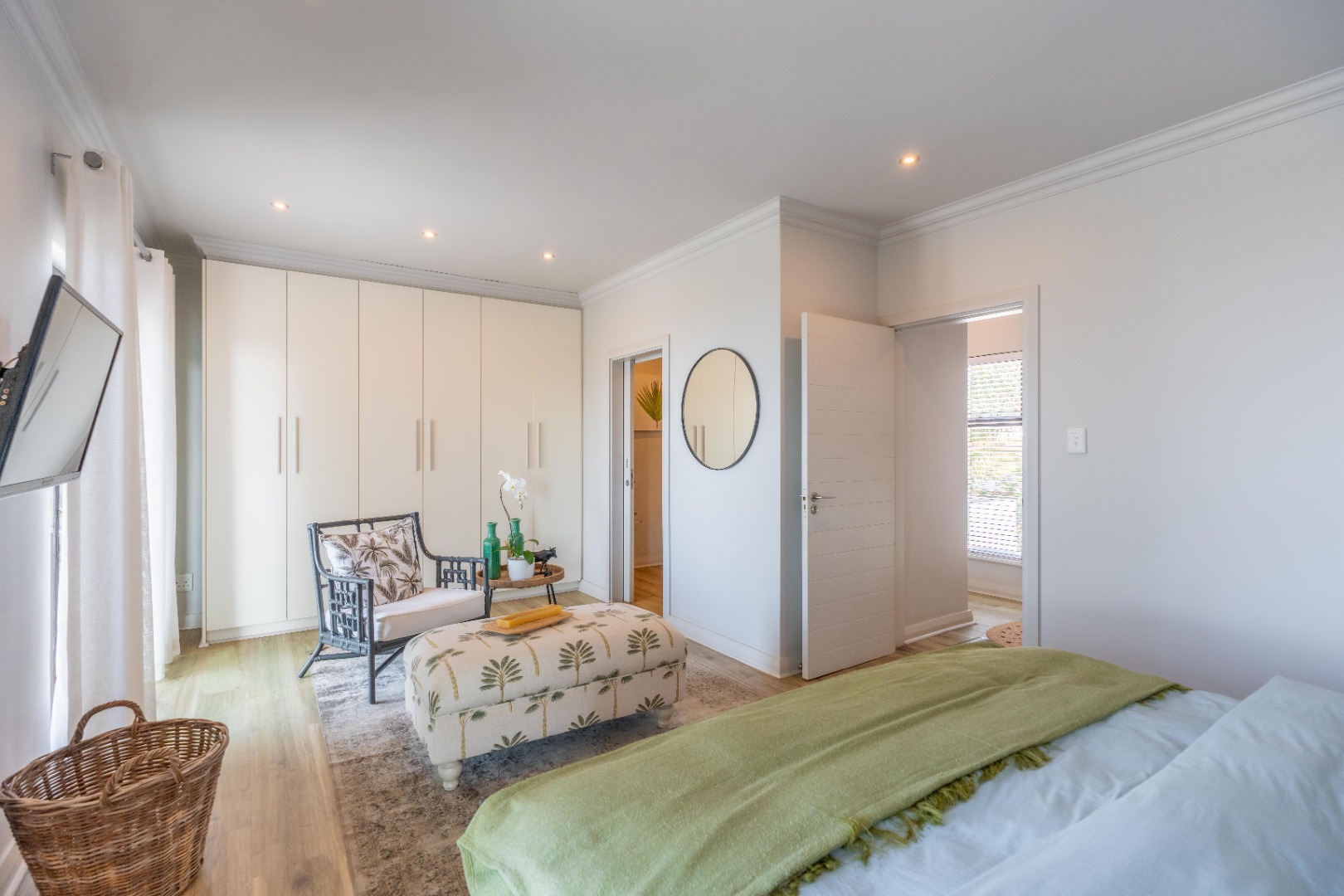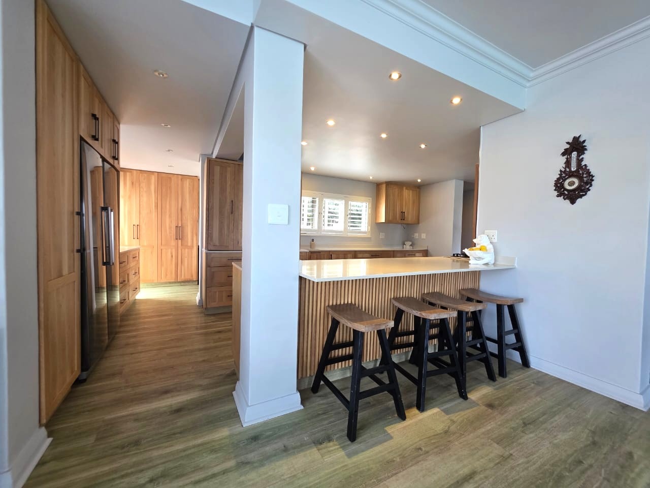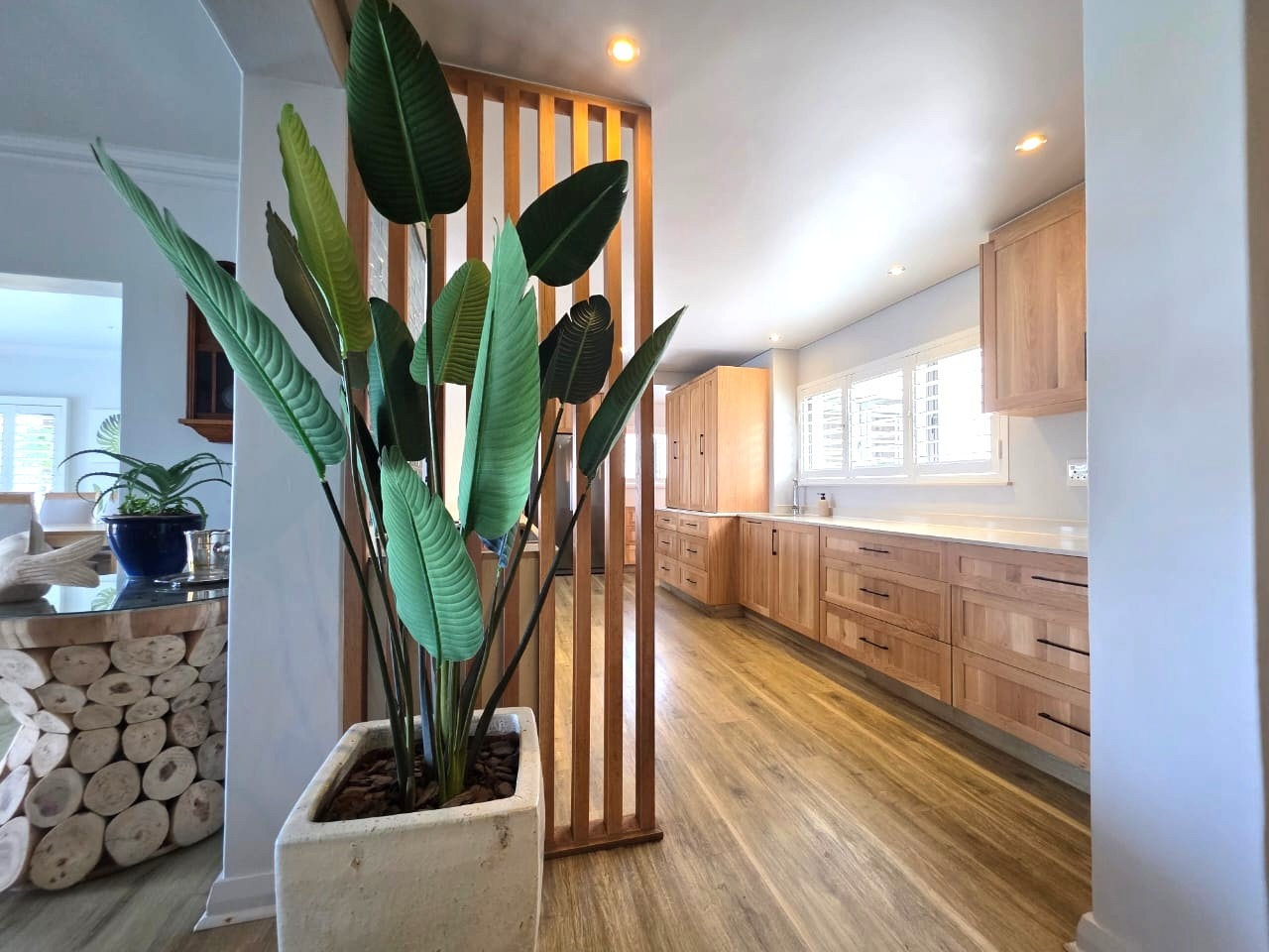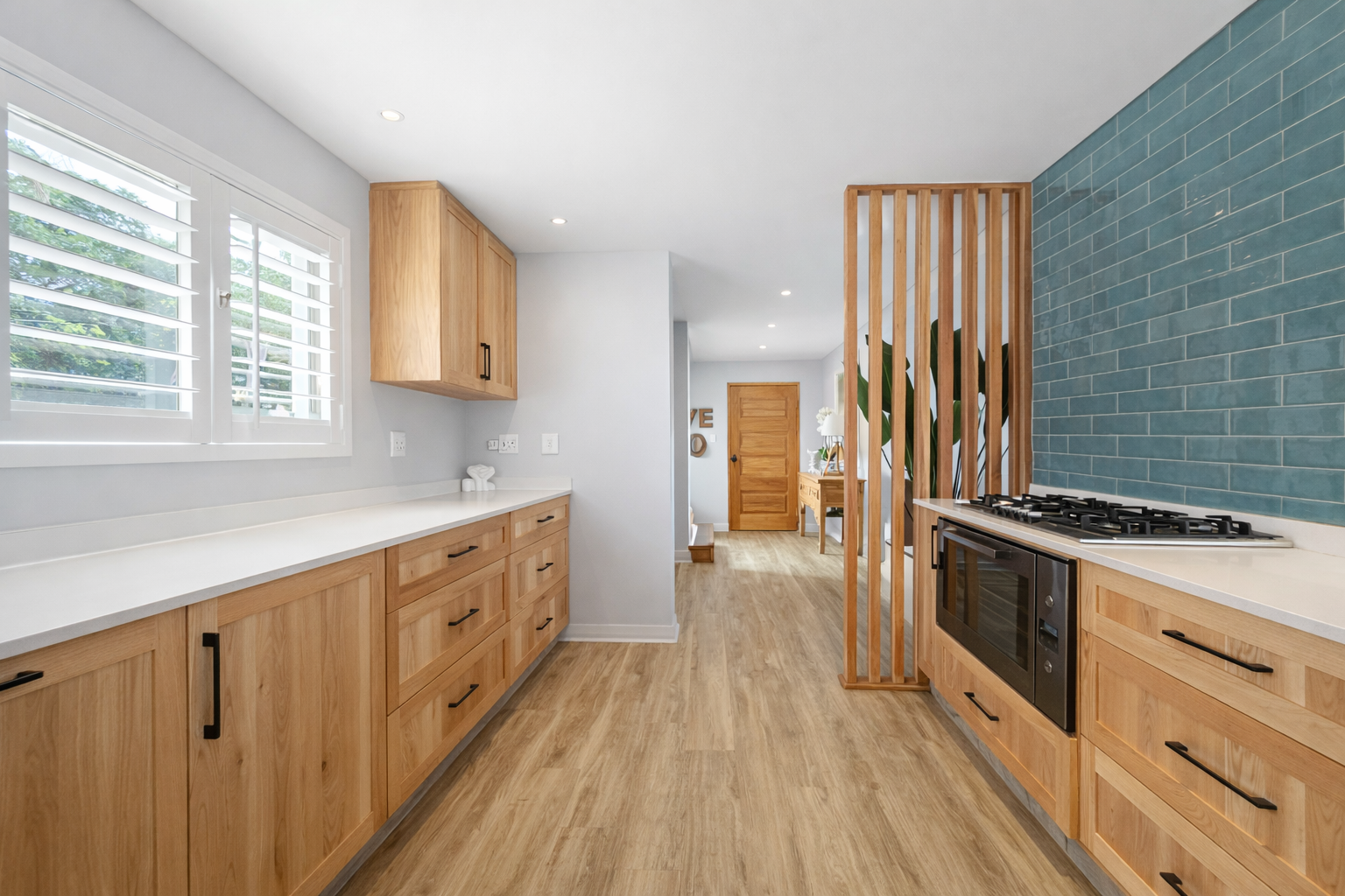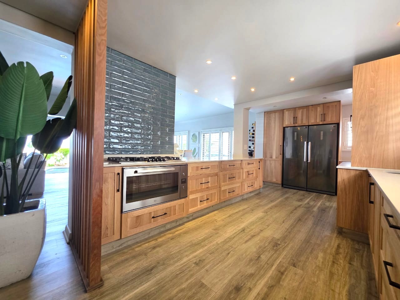At the heart of the residence lies a beautifully appointed, open-plan bespoke kitchen, complete with refined wooden cabinetry, sleek surfaces, and a considered layout. A separate scullery and laundry ensure seamless functionality, preserving the clean, uncluttered presentation of the main kitchen space.