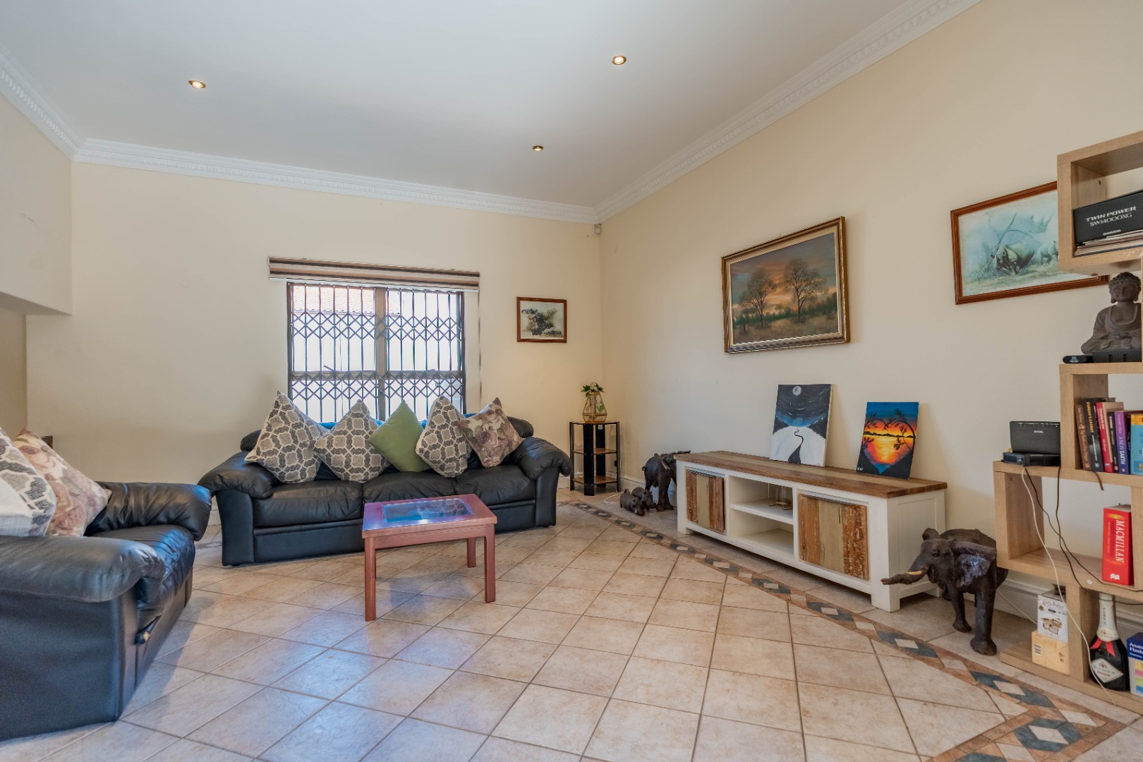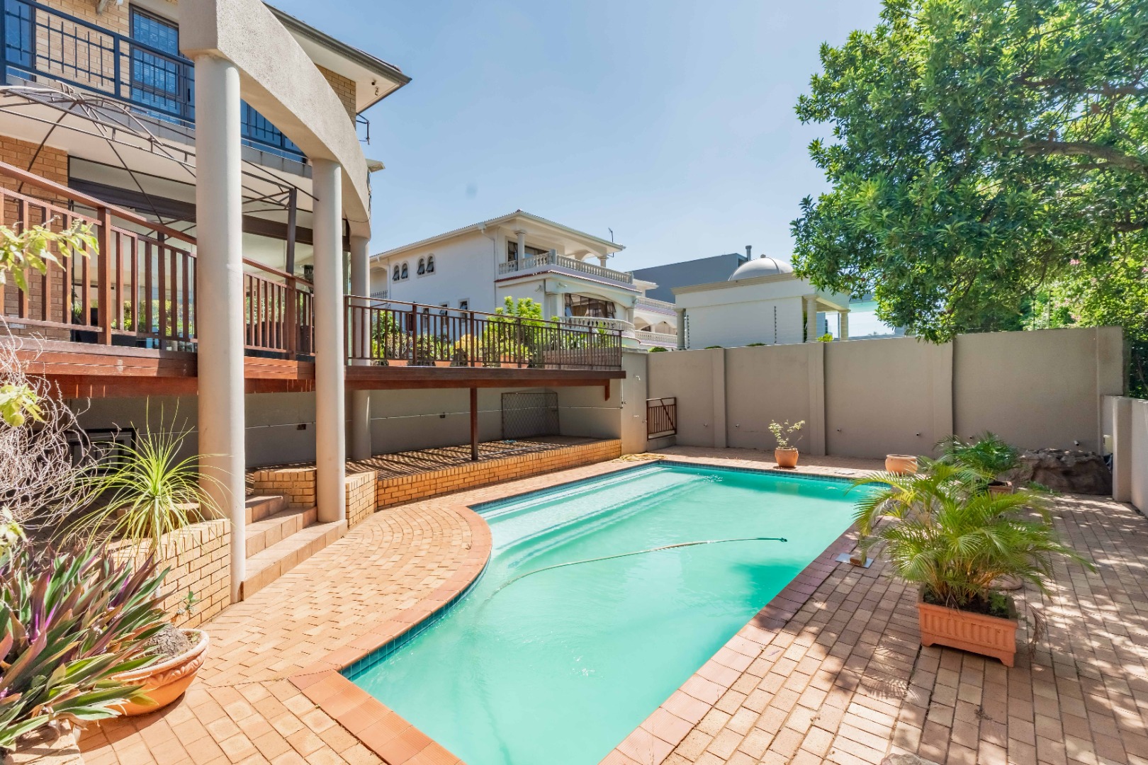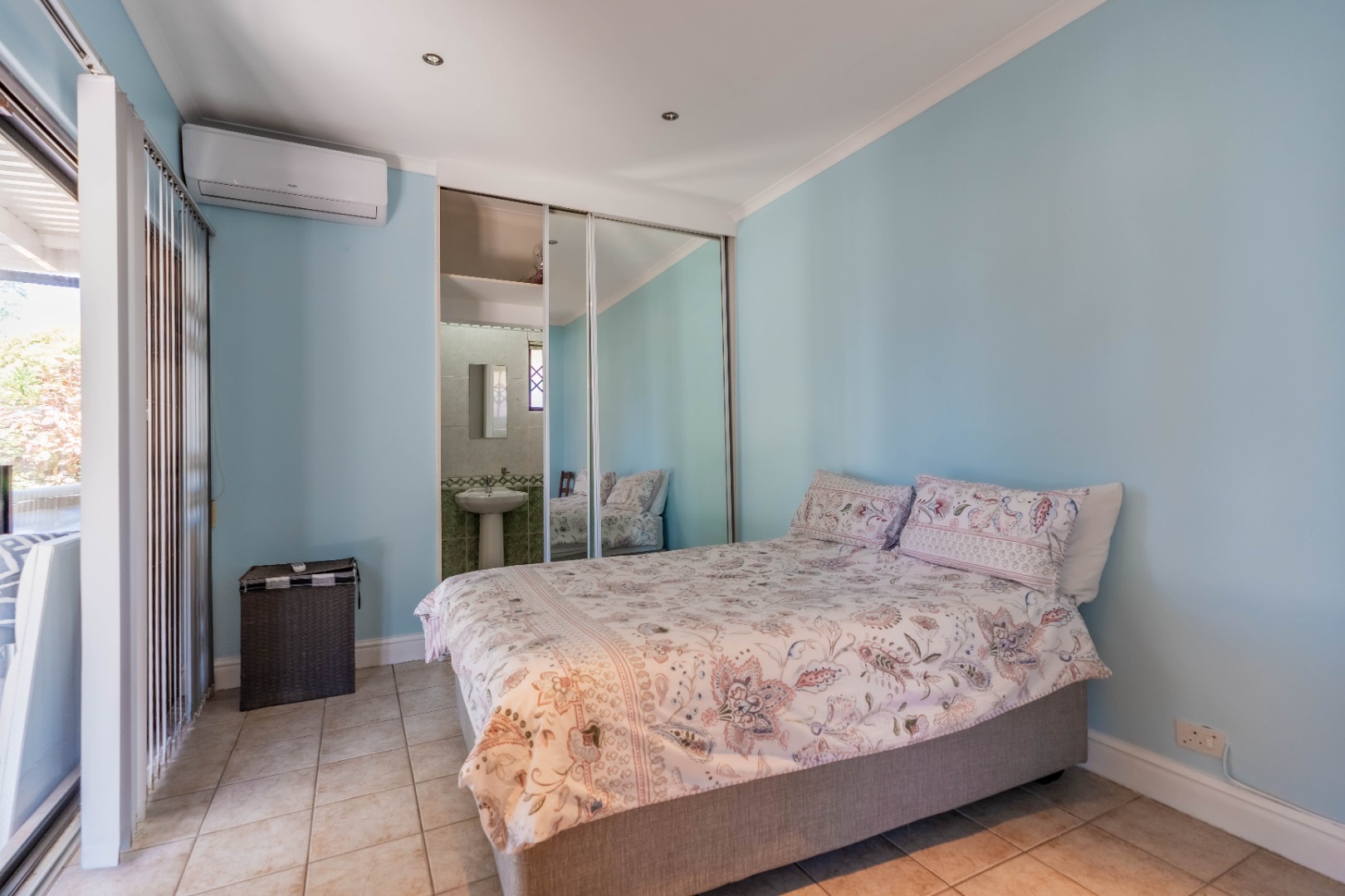 Designed for sophisticated outdoor living, the property boasts a lovely entertainment area that overlooks a sparkling pool, perfect for gatherings. Additional features include a patio, a well-maintained garden, and ample parking with three lock-up garages and space for several additional vehicles on the paved driveway. Modern conveniences such as air conditioning, laundry facilities, and storage are integrated throughout. Security is paramount, with an alarm system, access gate, intercom, and a totally walled perimeter. Pets are also welcome.
