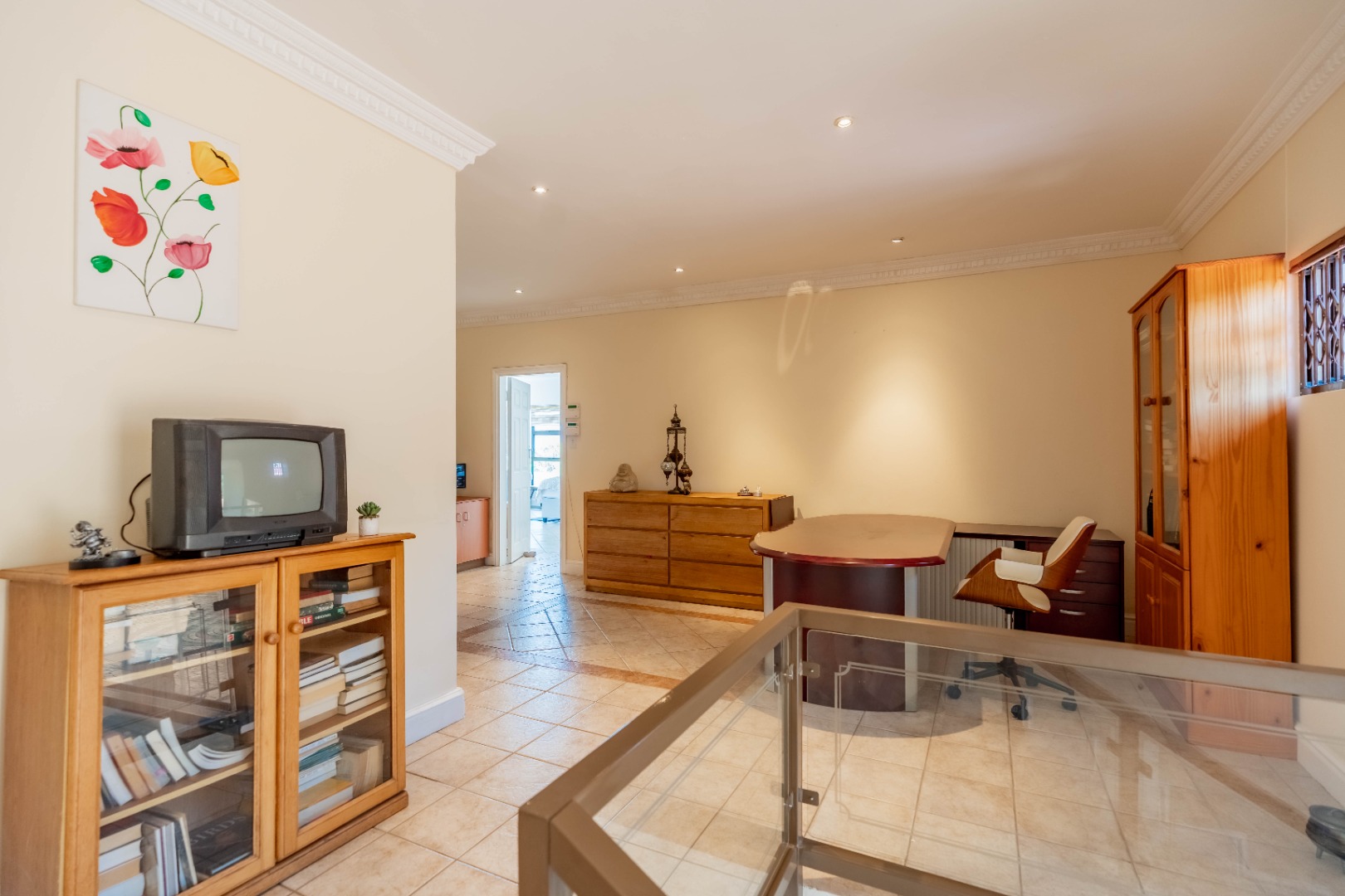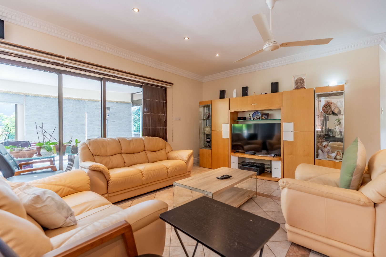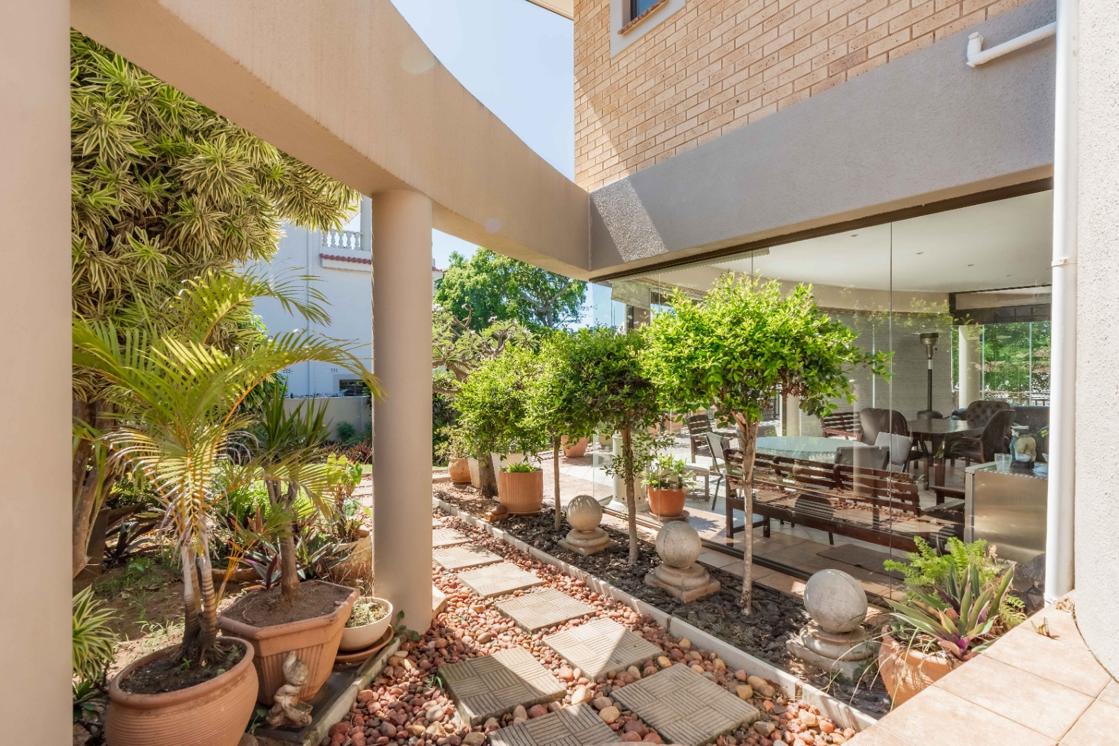 Designed for sophisticated outdoor living, the property boasts a lovely entertainment area that overlooks a sparkling pool, perfect for gatherings. Additional features include a patio, a well-maintained garden, and ample parking with three lock-up garages and space for several additional vehicles on the paved driveway. Modern conveniences such as air conditioning, laundry facilities, and storage are integrated throughout. Security is paramount, with an alarm system, access gate, intercom, and a totally walled perimeter. Pets are also welcome.