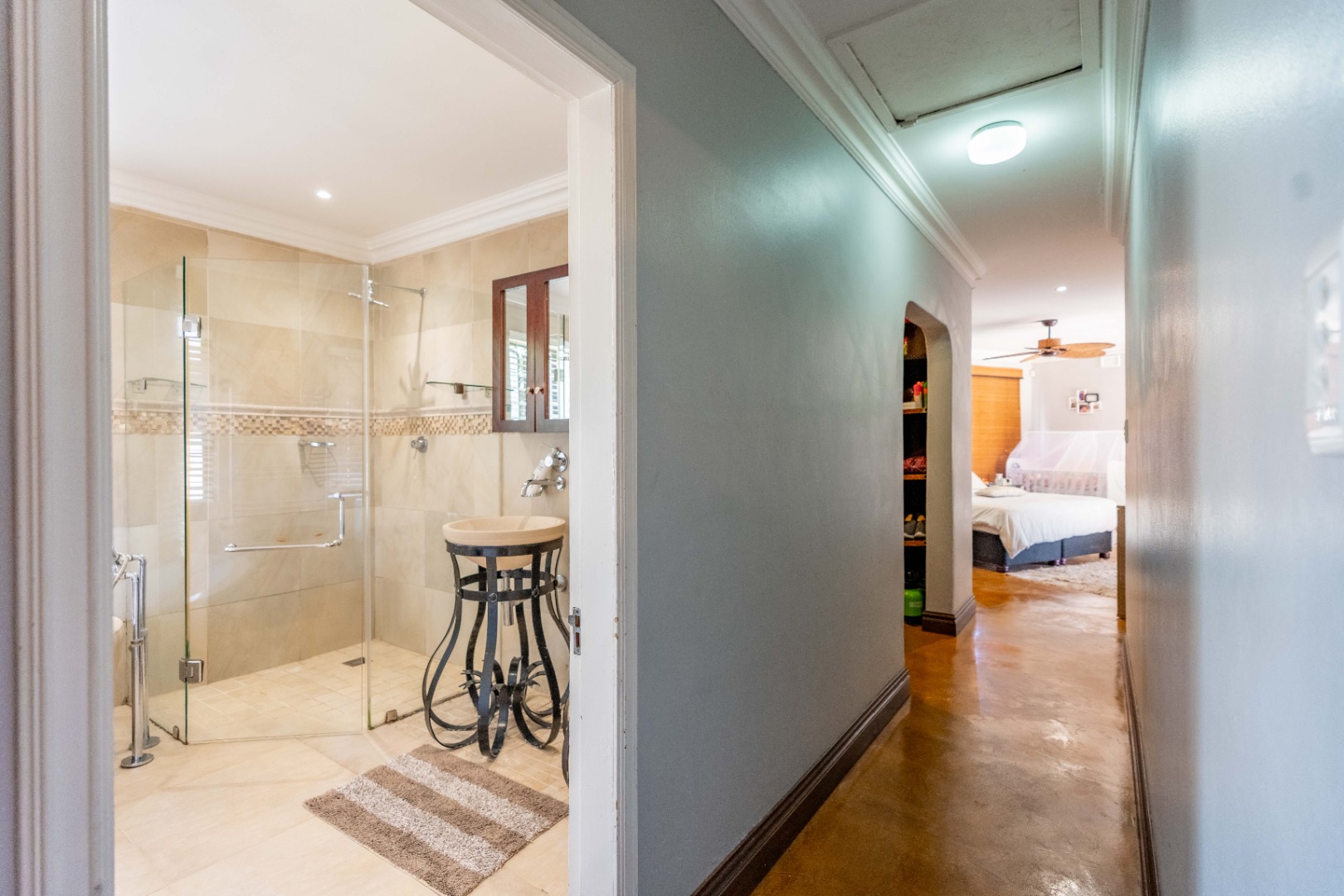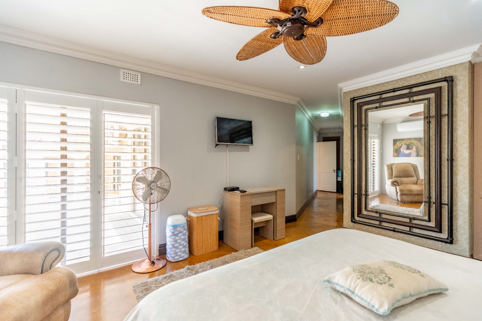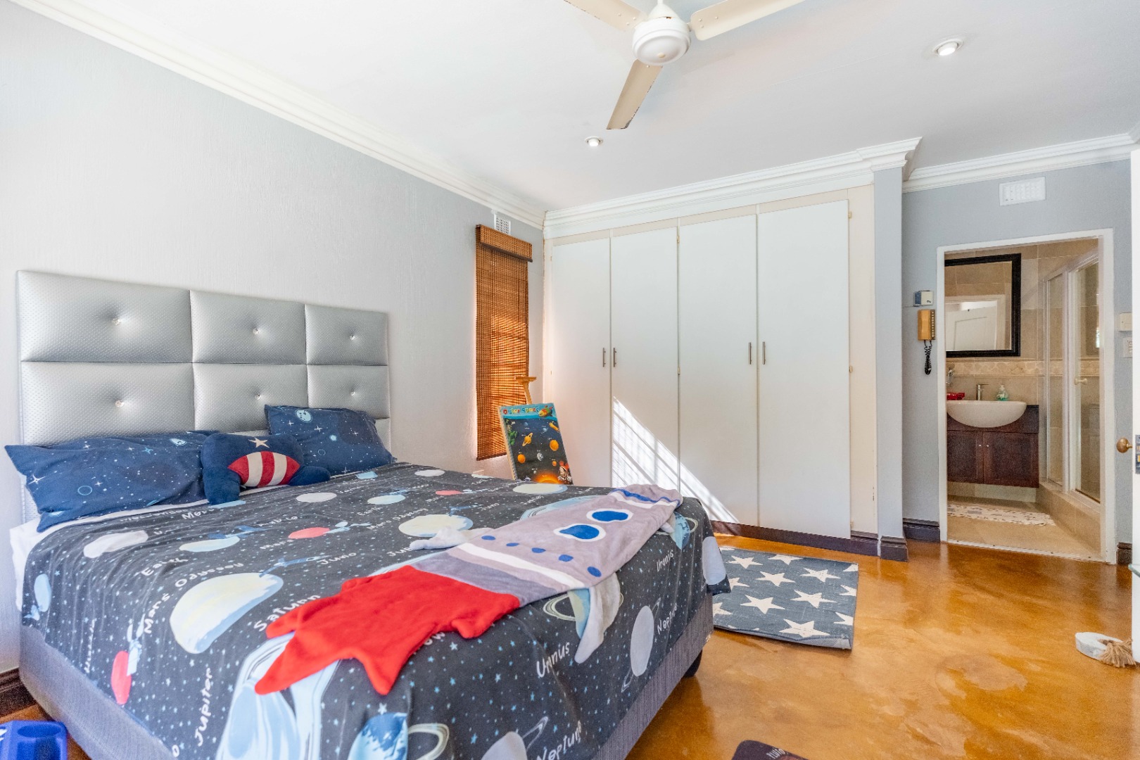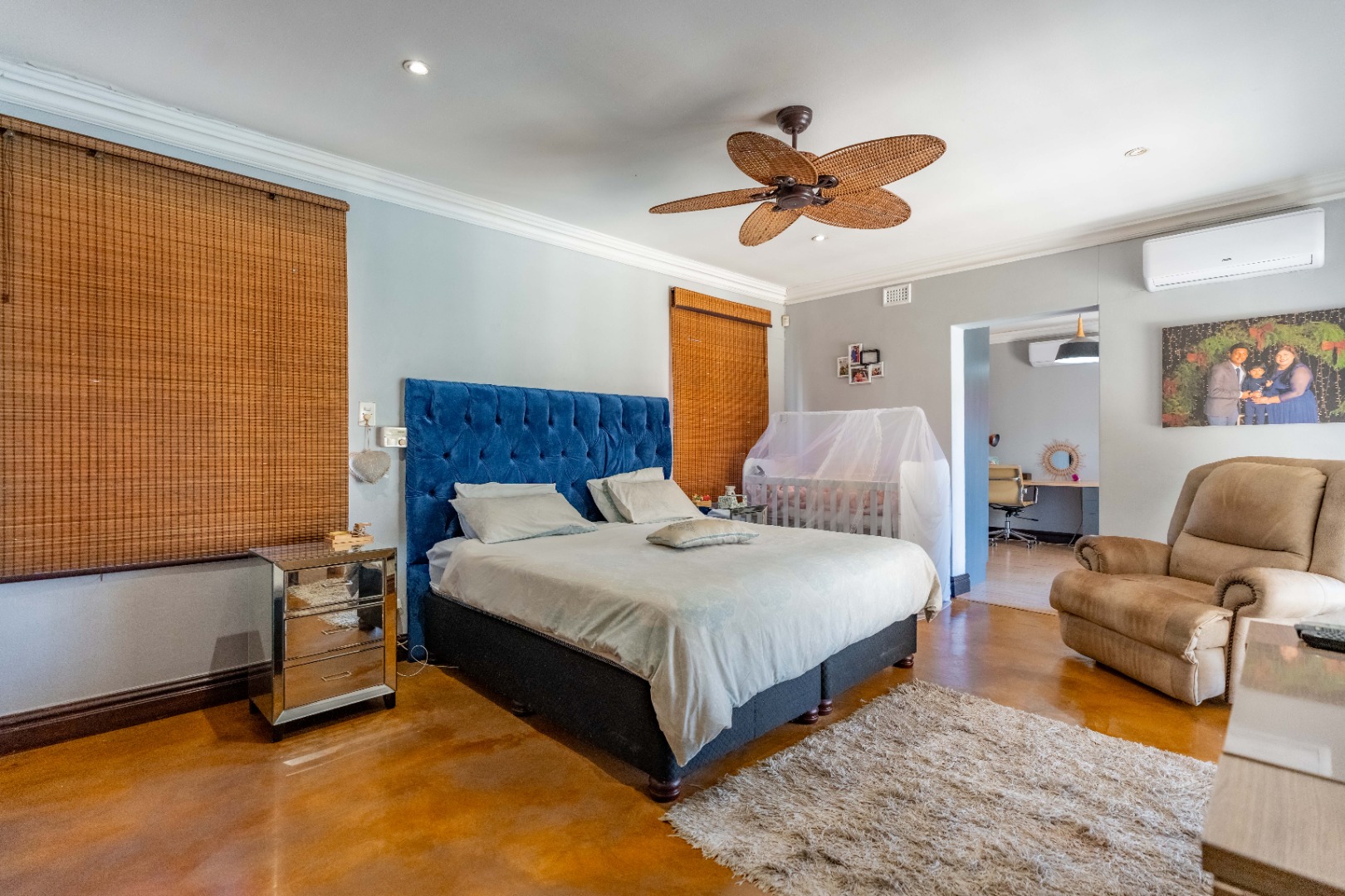 The home offers four well-sized, beautifully finished bedrooms. The main suite is expansive and modern, featuring a full en-suite bathroom with his and hers vanities, a walk-in dressing room, air-conditioning, ceiling fans, and a dedicated study area—providing a private retreat with every comfort considered. The second bedroom also en-suite. The remaining 2 bedrooms share a bathroom.