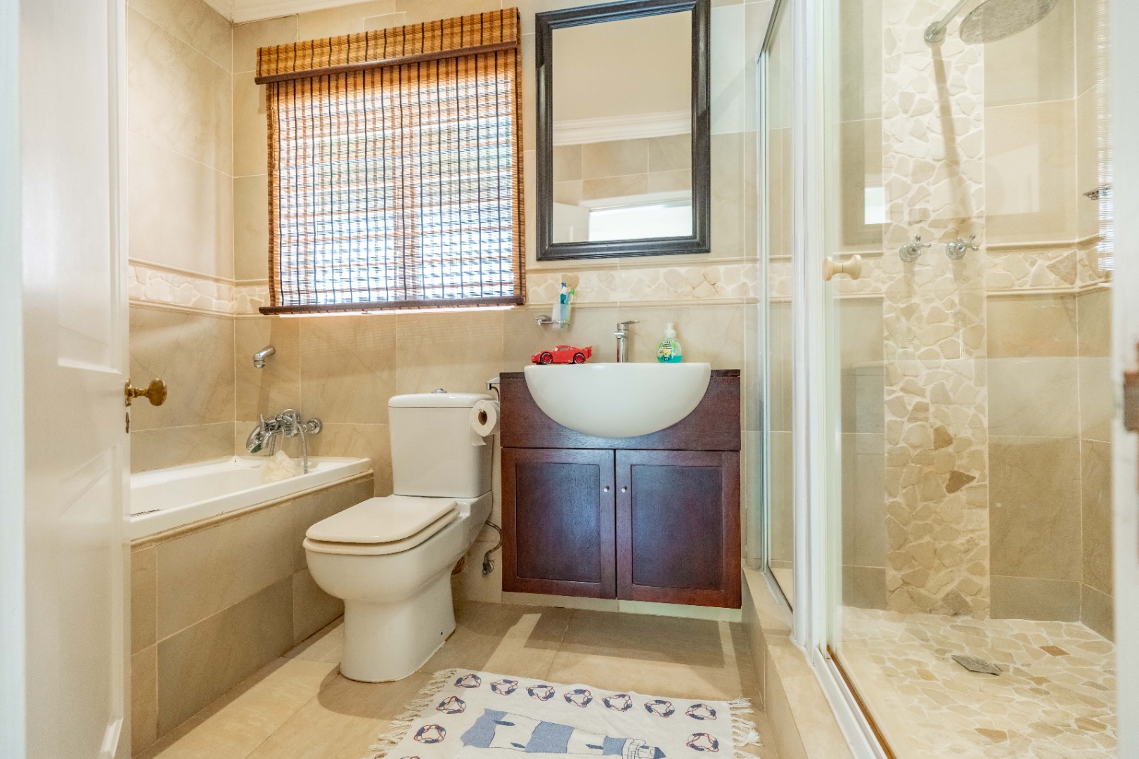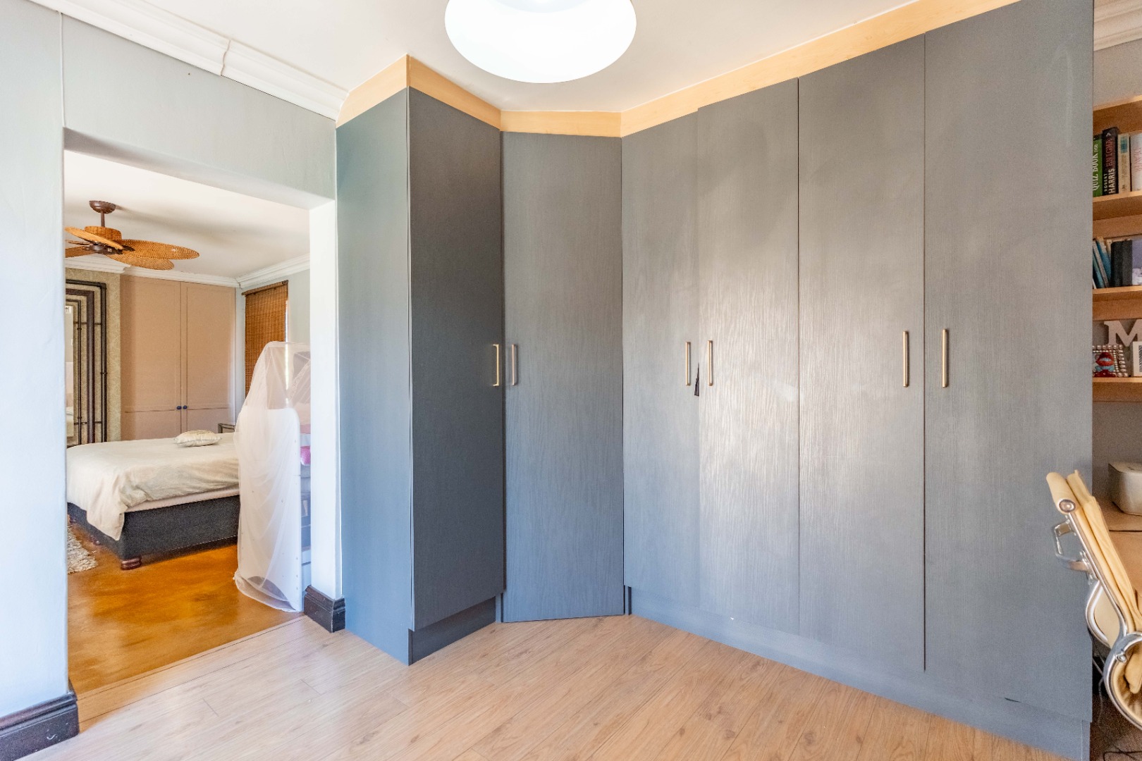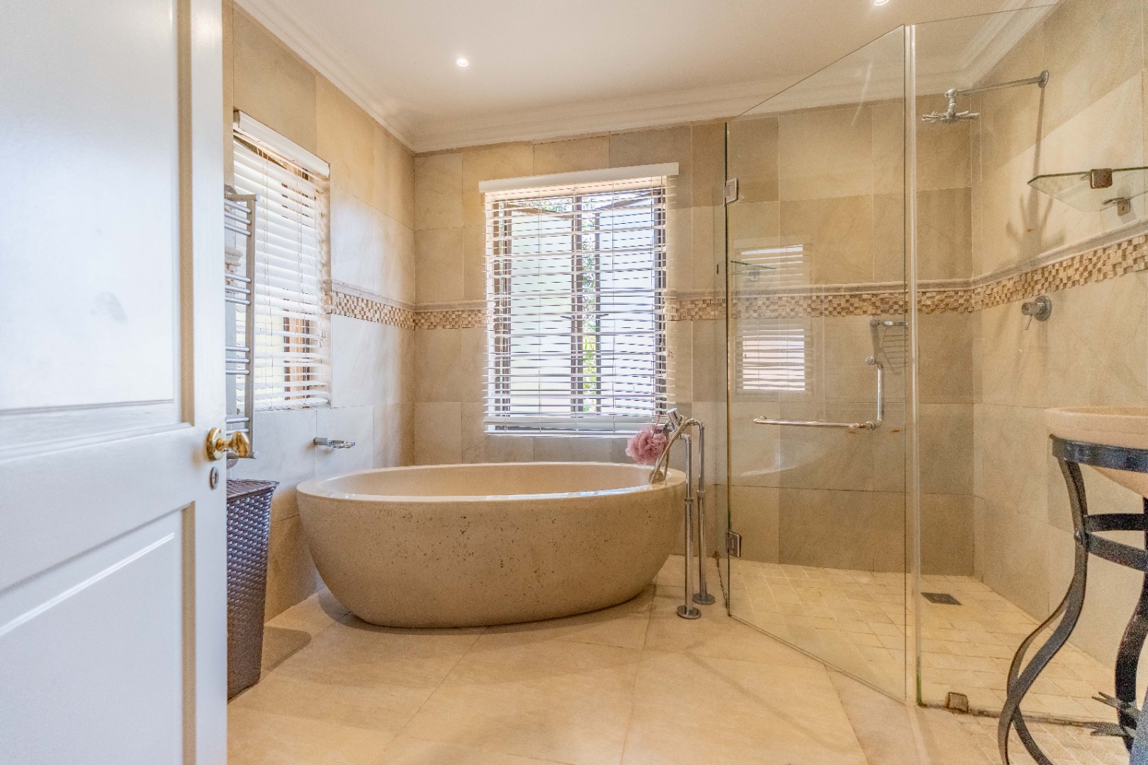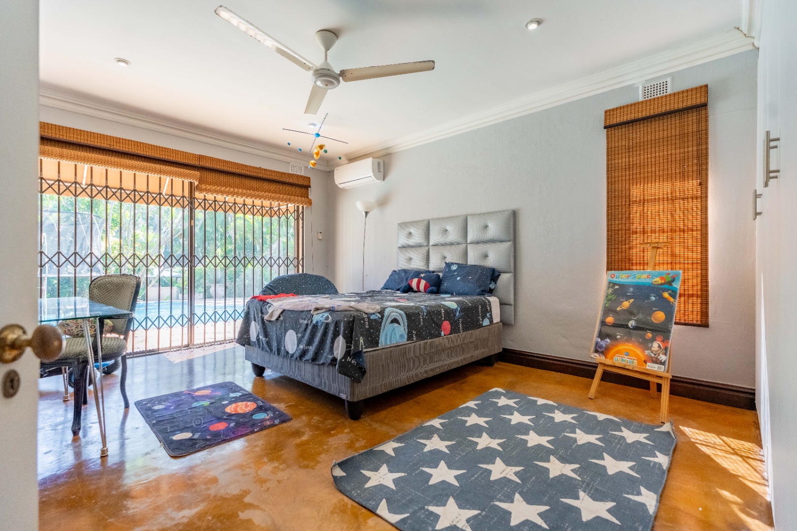 The home offers four well-sized, beautifully finished bedrooms. The main suite is expansive and modern, featuring a full en-suite bathroom with his and hers vanities, a walk-in dressing room, air-conditioning, ceiling fans, and a dedicated study area—providing a private retreat with every comfort considered. The second bedroom also en-suite. The remaining 2 bedrooms share a bathroom.
