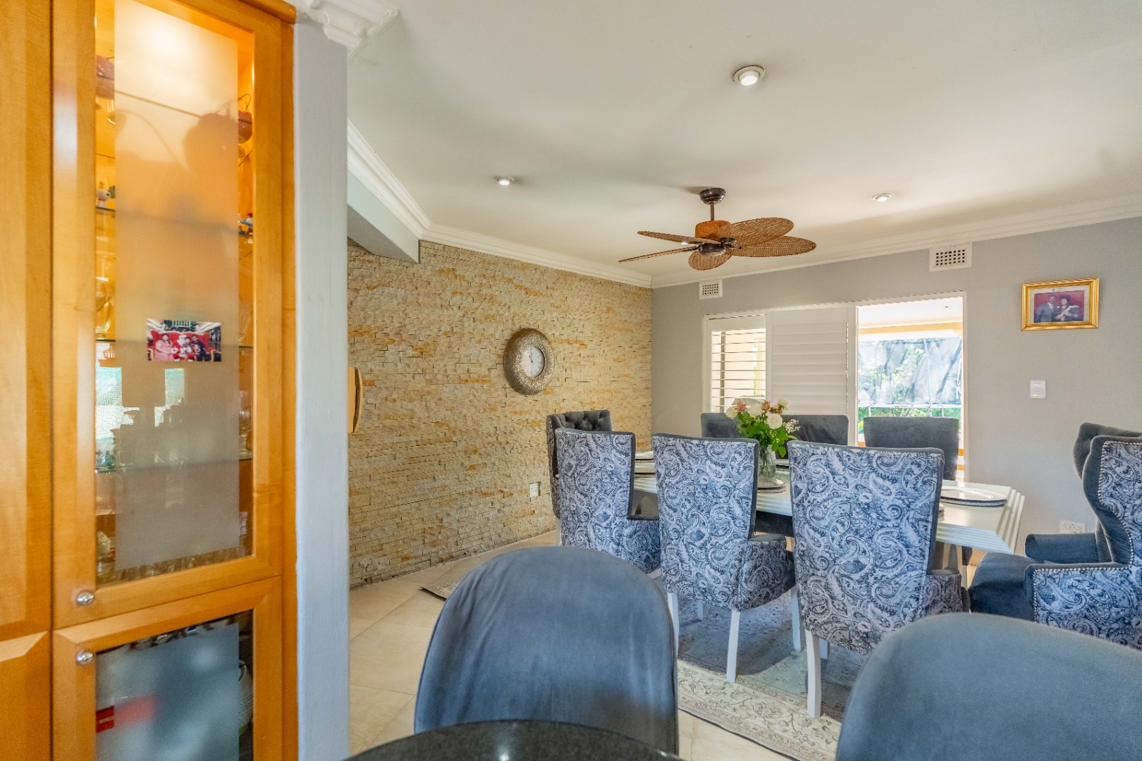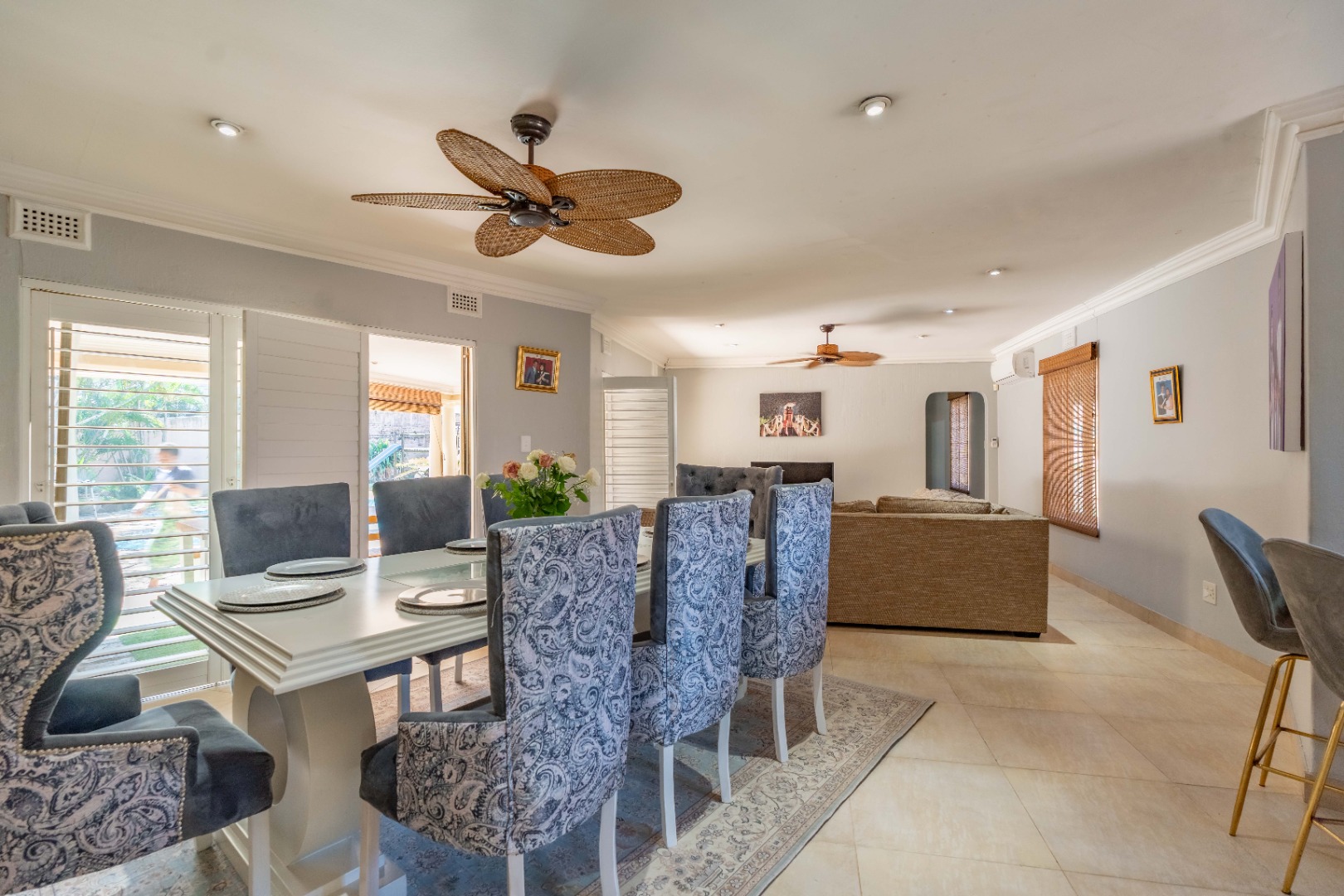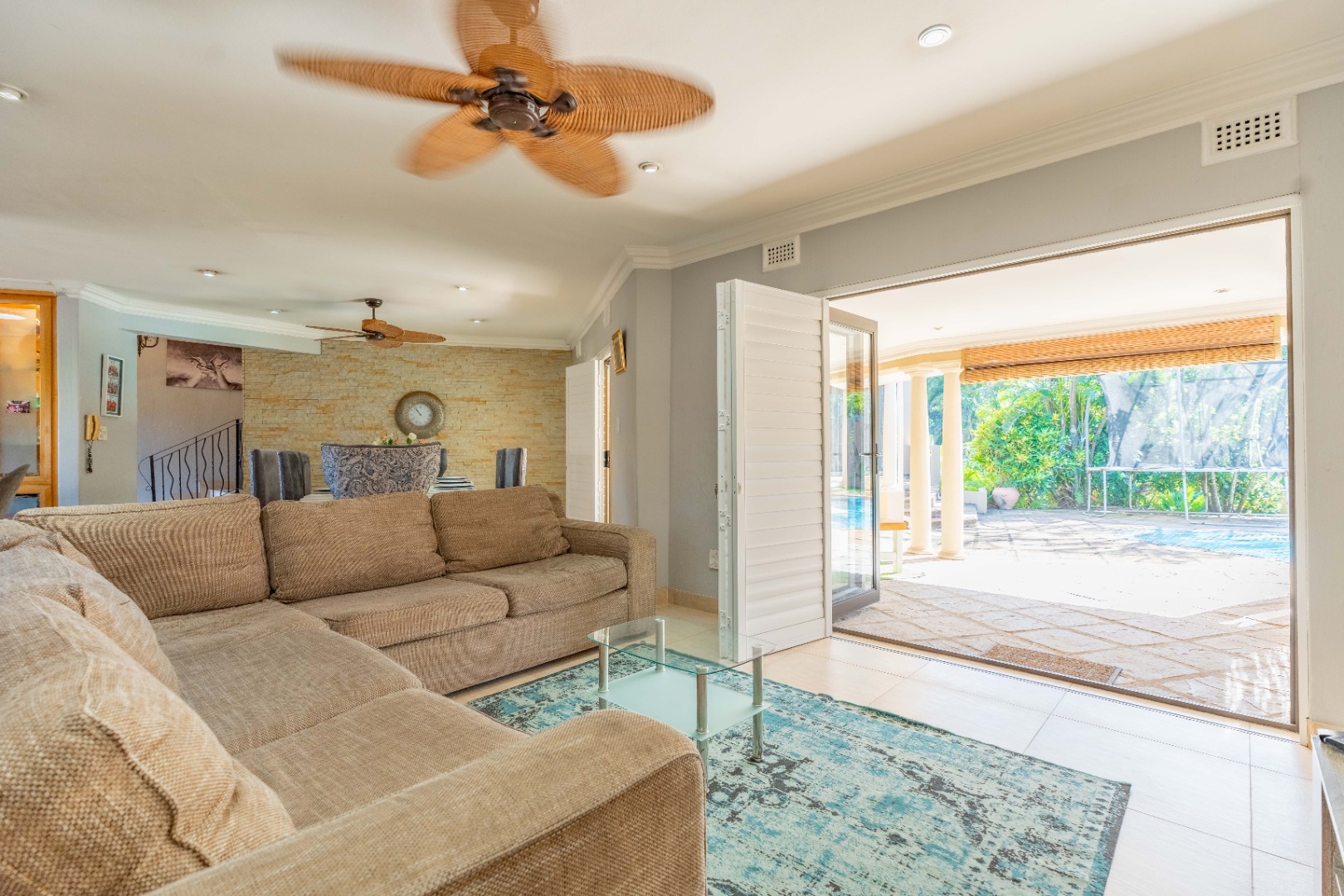 A level, paved front garden sets the tone, welcoming you into several expansive open-plan living areas. The lounge and dining space flow easily together, enhanced by ceiling fans, stack-back doors, a feature wall, and abundant natural light throughout. Shutters and blinds add a stylish finishing touch, while trellidoors provide added security.