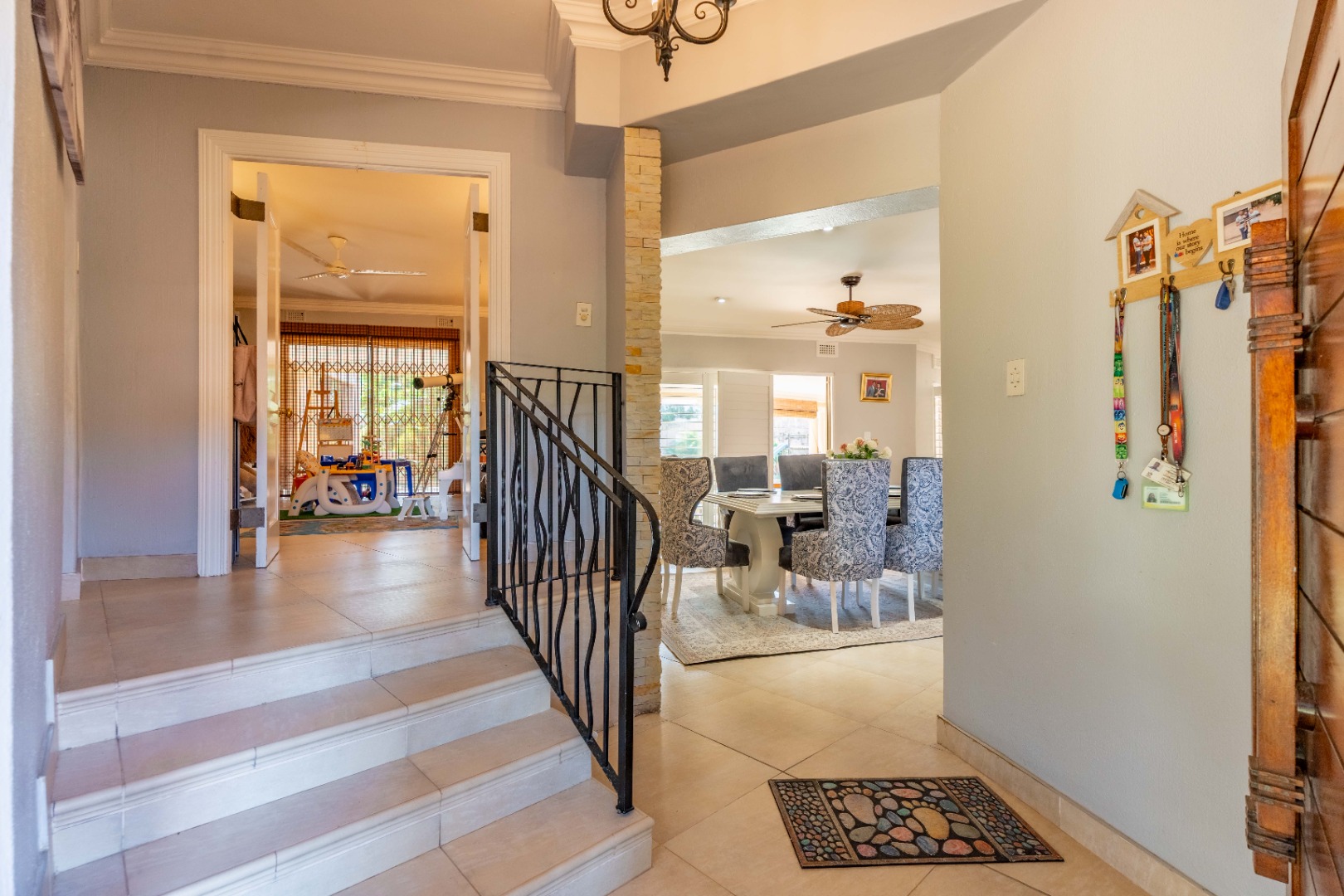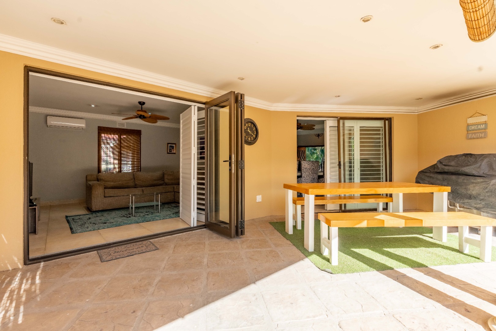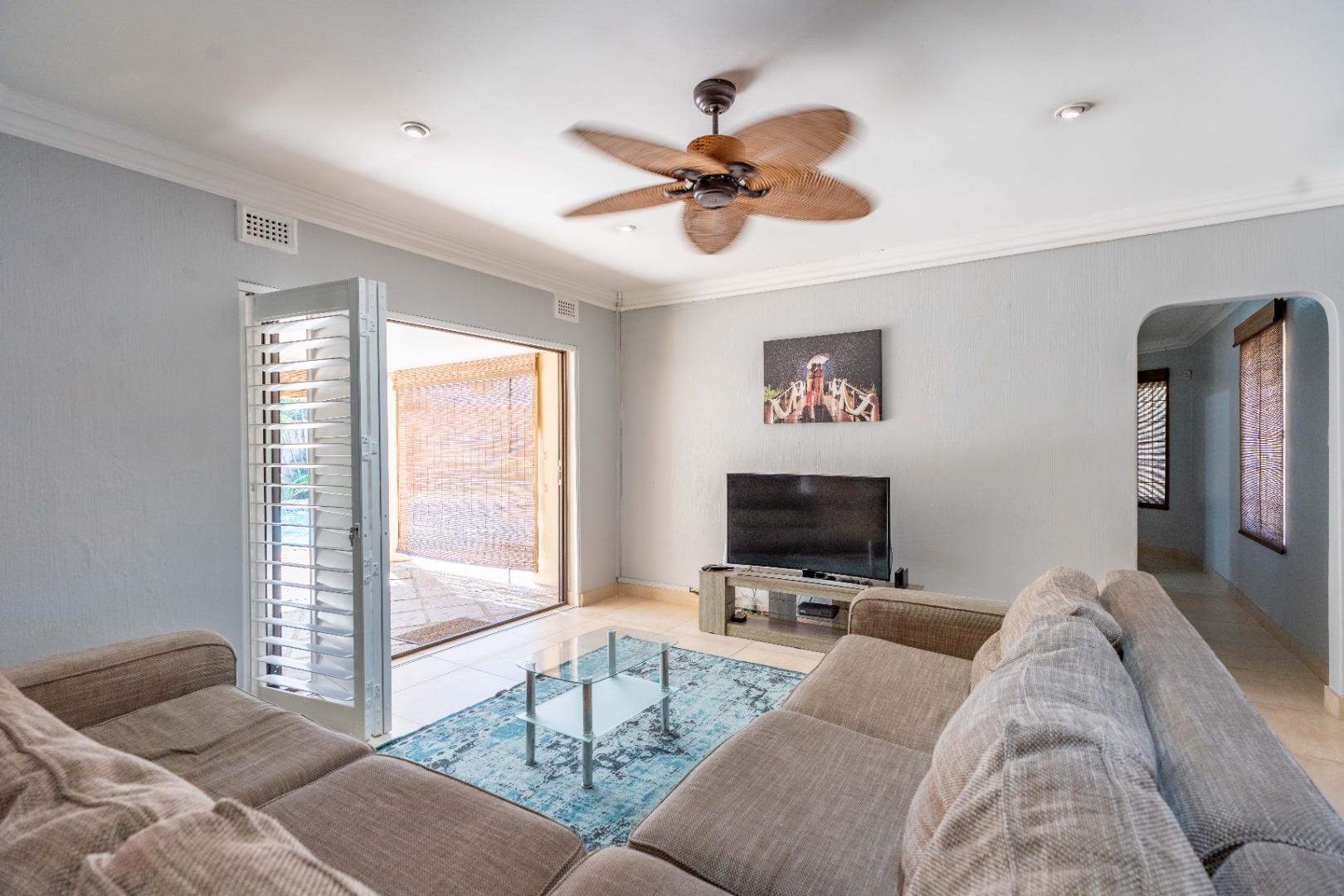 A level, paved front garden sets the tone, welcoming you into several expansive open-plan living areas. The lounge and dining space flow easily together, enhanced by ceiling fans, stack-back doors, a feature wall, and abundant natural light throughout. Shutters and blinds add a stylish finishing touch, while trellidoors provide added security.