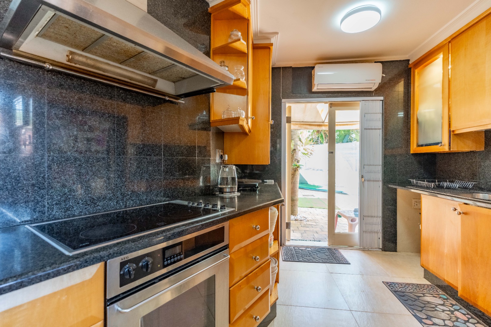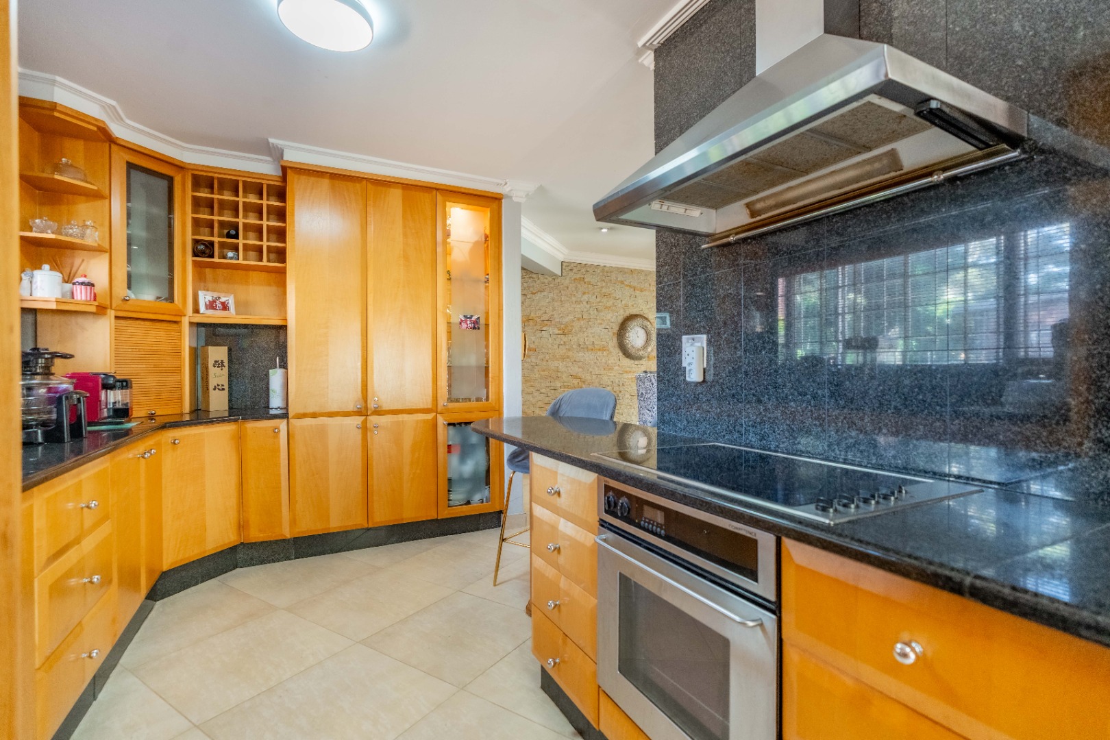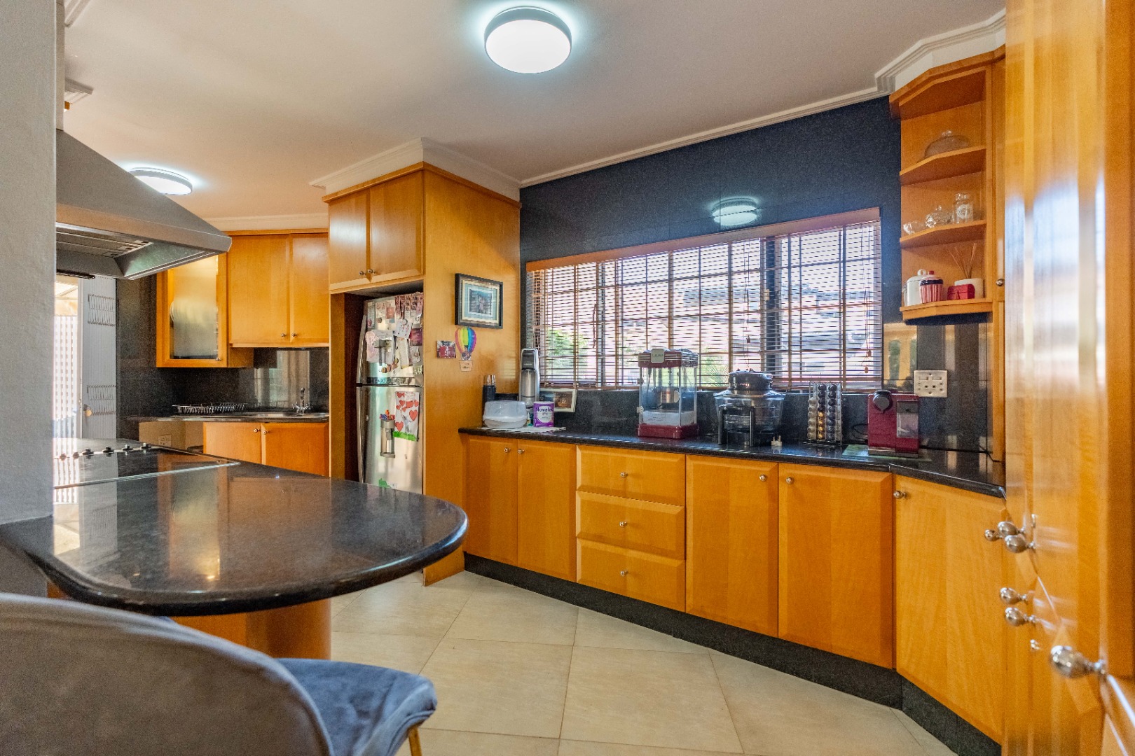 The open-plan kitchen, positioned off the dining area, is both stylish and practical, featuring granite countertops, a breakfast bar, glass stove top and hob, quality appliances, and stack-back blinds. A separate scullery and laundry area is tucked behind the kitchen and leads to a private courtyard, offering extra convenience for busy households.